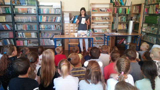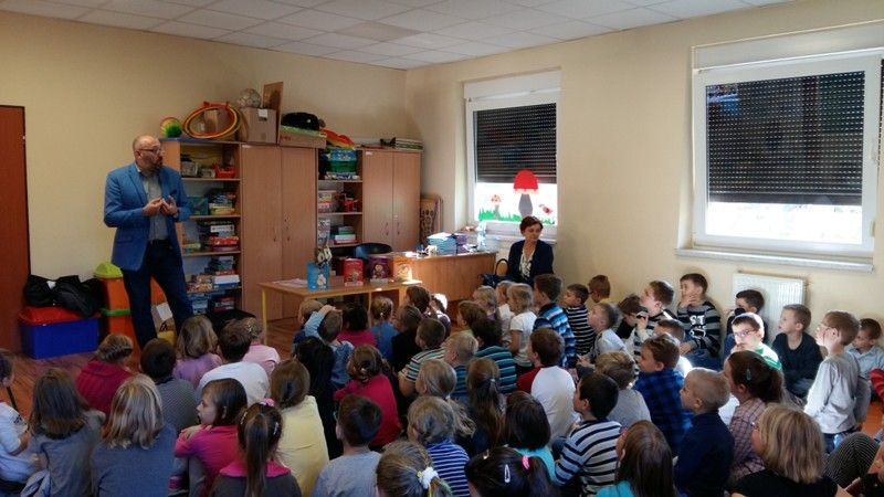 Opowiadał nam o korzyściach płynących z czytania. Młody czytelnik przez czytanie pobudza wyobraźnię, staje się kreatywnym, umie się wysłowić i gimnastykuje mózg. Pan Kulikowski zachęcał uczniów do korzystania z zasobów bibliotecznych, ponieważ co roku wydaje się wiele ciekawych pozycji dla dzieci i młodzieży.