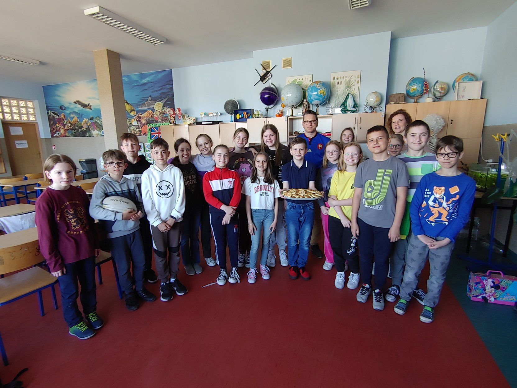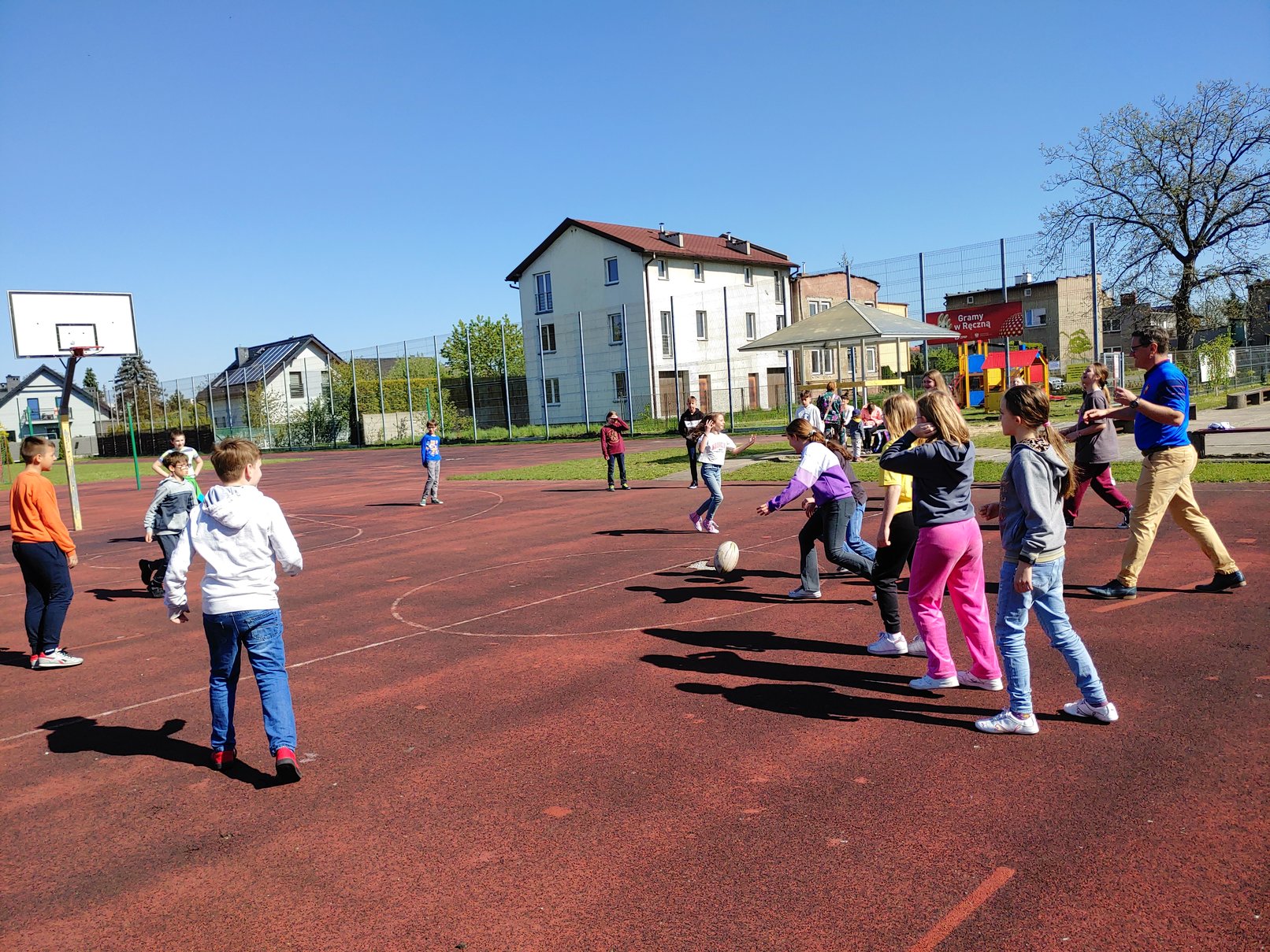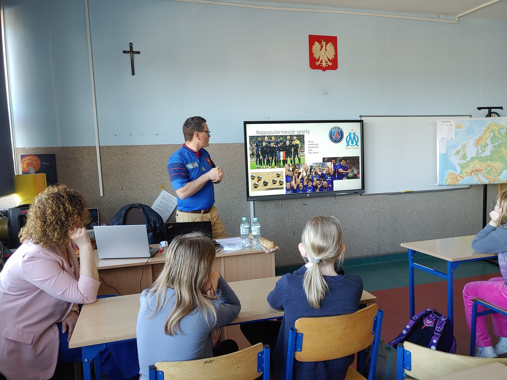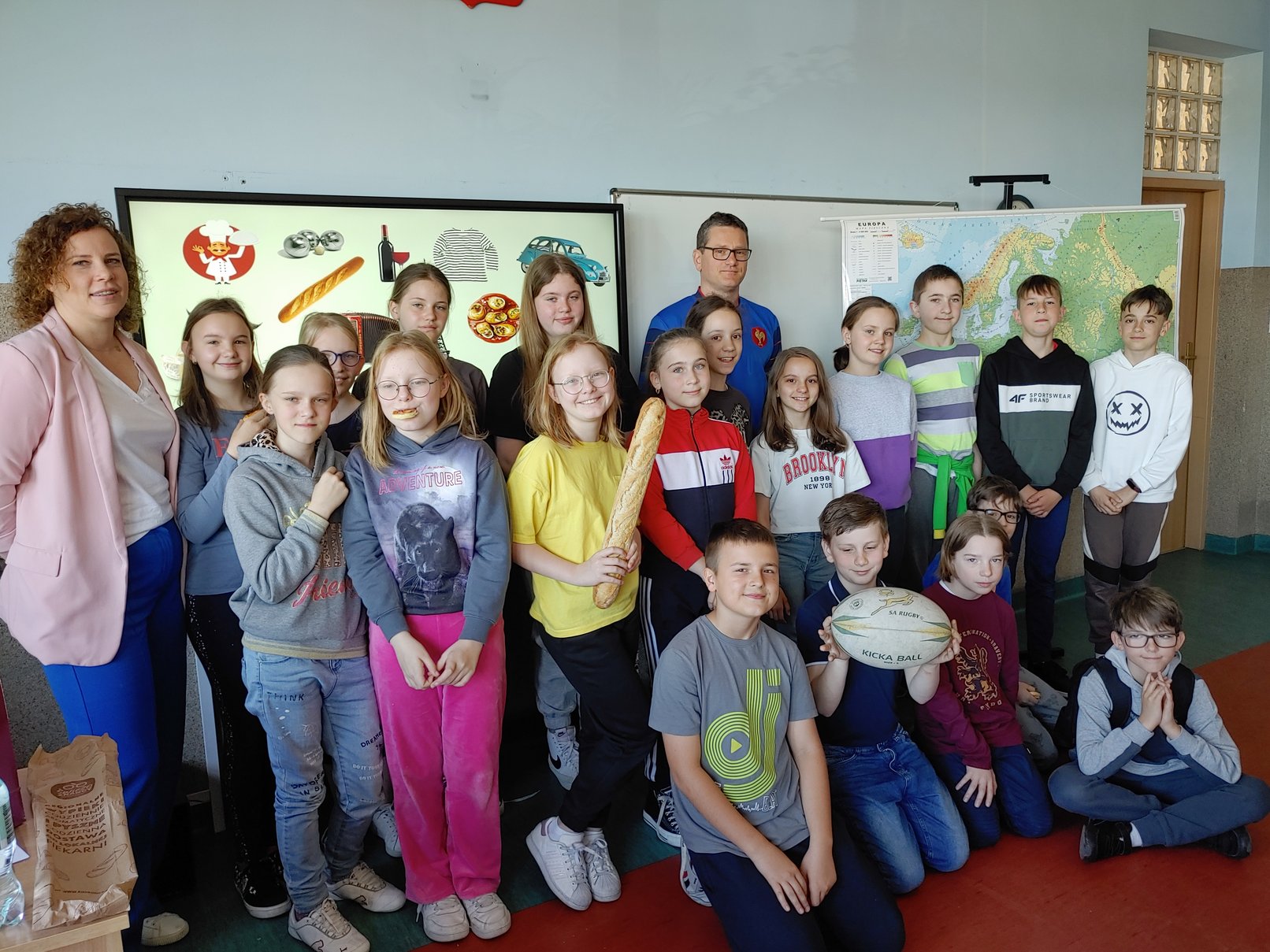 Pan Gilbert jest rodowitym Francuzem, jednak świetnie mówiącym po polsku! Szymon wraz ze swoim tatą przeczytali piękną francuszczyzną fragment „Mikołajka”, a następnie pan Kwarciak przedstawił czwartoklasistom prezentację o francuskiej szkole, tej dawnej i tej współczesnej. Nie zabrakło też wiadomości o różnicach między naszymi krajami i wielu ciekawostek. Pan Gilbert chętnie odpowiadał na pytania kolegów i koleżanek swojego syna, chociażby o to, jak nauczyć się tak dobrze języka obcego. Czwartoklasiści poznali kilka podstawowych zwrotów w języku francuskim i bardzo dobrze sobie poradzili z wymową tego trudnego dla Polaków języka. Skosztowaliśmy pysznych „escargots” upieczonych z ciasta francuskiego przez Szymona i jego mamę.Ale chyba największą atrakcją stała się praktyczna nauka gry w rugby, sport, który uwielbiają Francuzi i jest też hobby pana Gilberta.