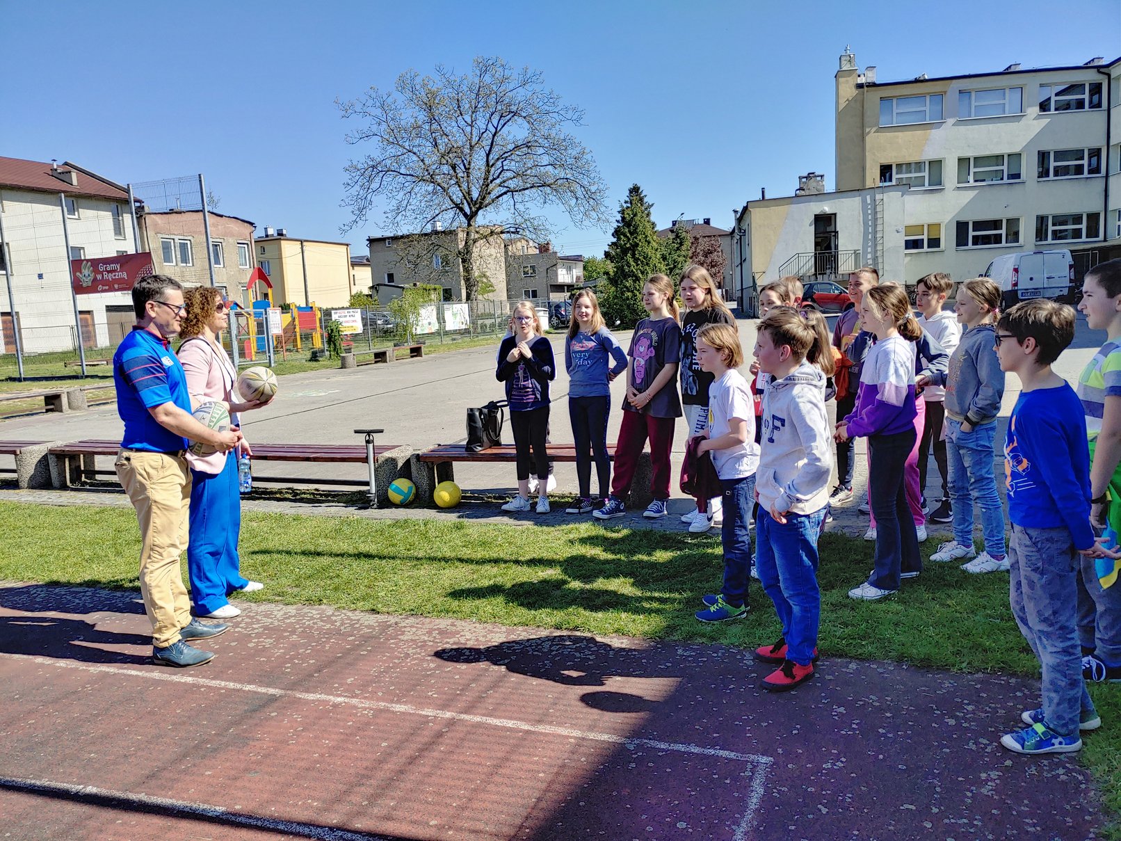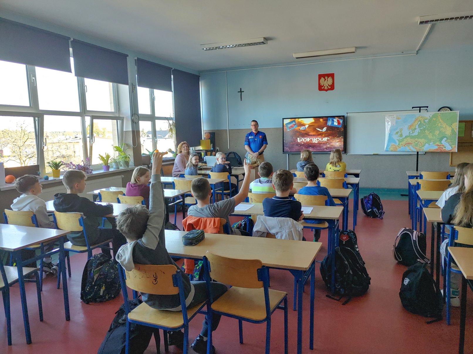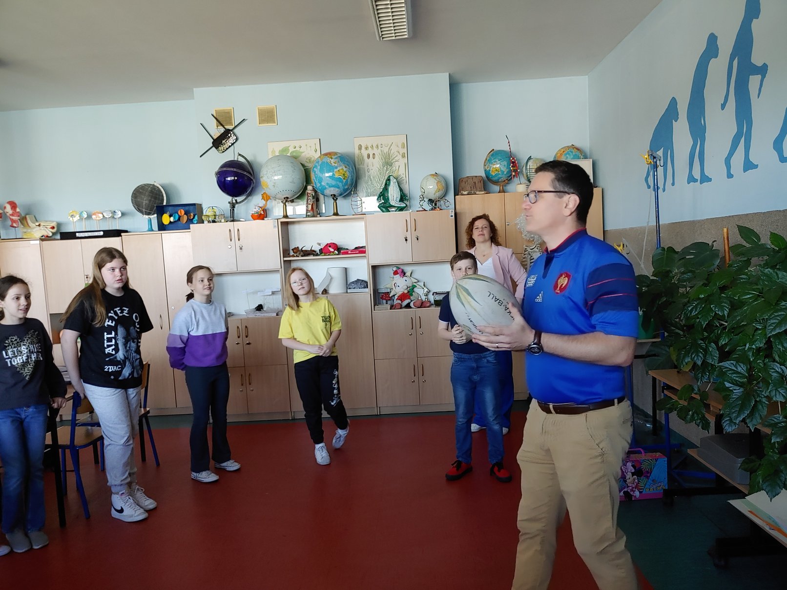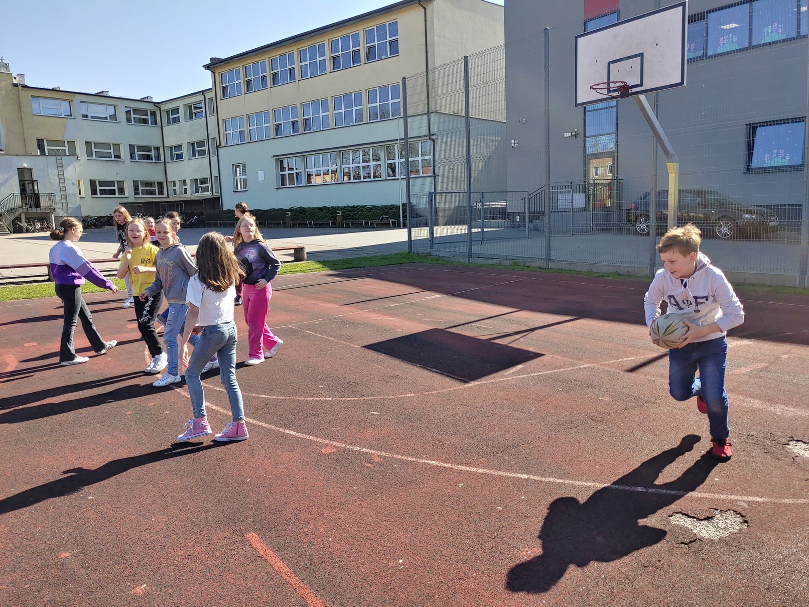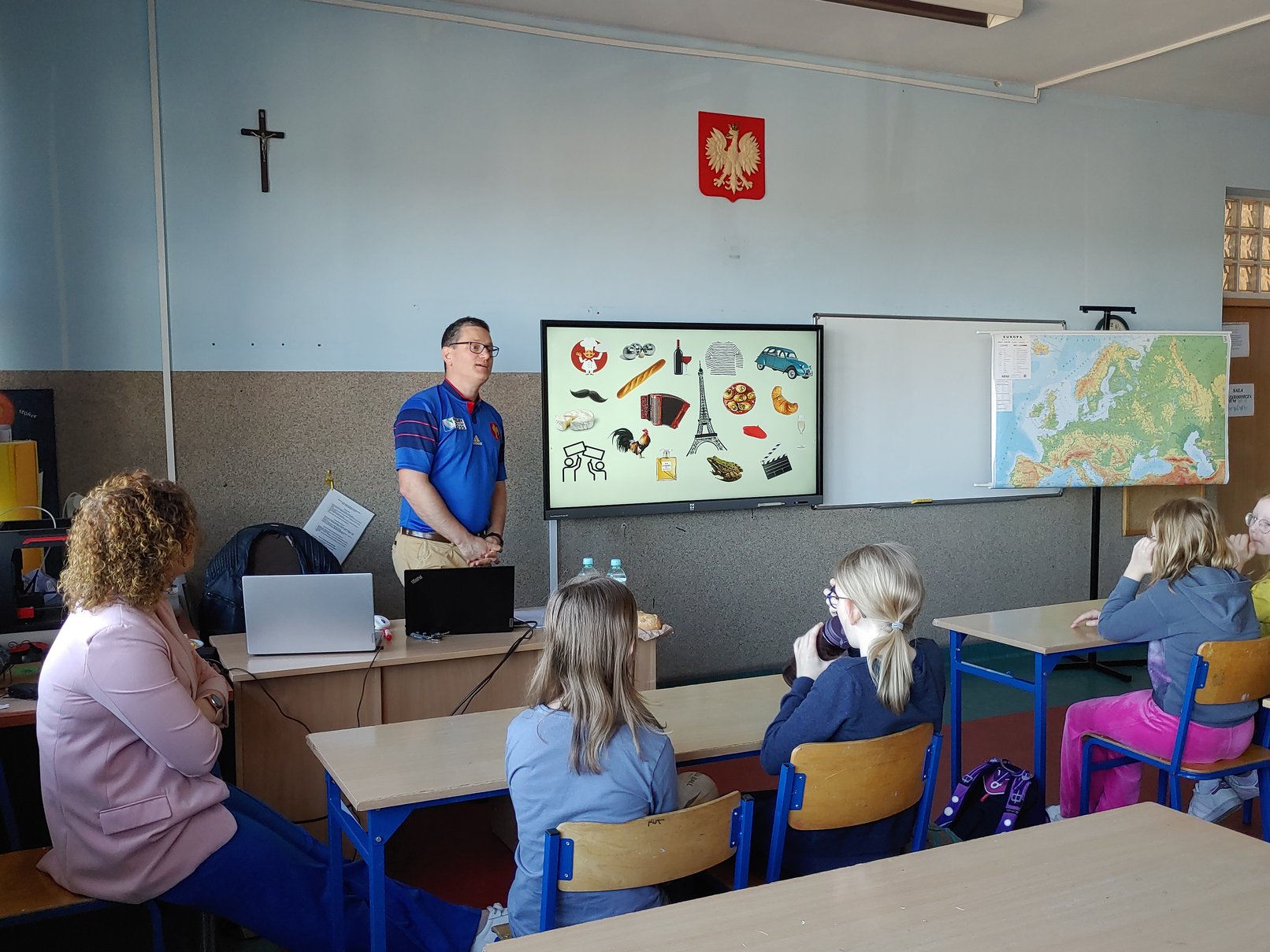 Pan Gilbert jest rodowitym Francuzem, jednak świetnie mówiącym po polsku! Szymon wraz ze swoim tatą przeczytali piękną francuszczyzną fragment „Mikołajka”, a następnie pan Kwarciak przedstawił czwartoklasistom prezentację o francuskiej szkole, tej dawnej i tej współczesnej. Nie zabrakło też wiadomości o różnicach między naszymi krajami i wielu ciekawostek. Pan Gilbert chętnie odpowiadał na pytania kolegów i koleżanek swojego syna, chociażby o to, jak nauczyć się tak dobrze języka obcego. Czwartoklasiści poznali kilka podstawowych zwrotów w języku francuskim i bardzo dobrze sobie poradzili z wymową tego trudnego dla Polaków języka. Skosztowaliśmy pysznych „escargots” upieczonych z ciasta francuskiego przez Szymona i jego mamę.Ale chyba największą atrakcją stała się praktyczna nauka gry w rugby, sport, który uwielbiają Francuzi i jest też hobby pana Gilberta.