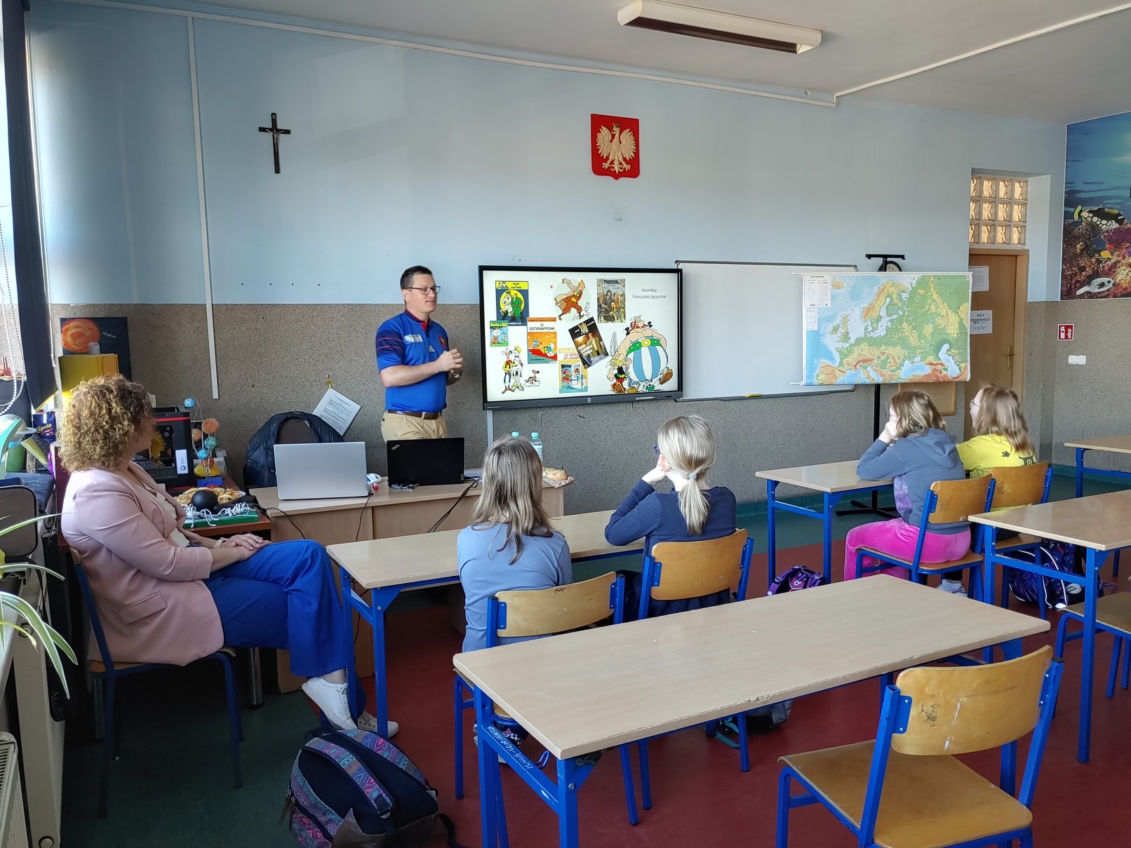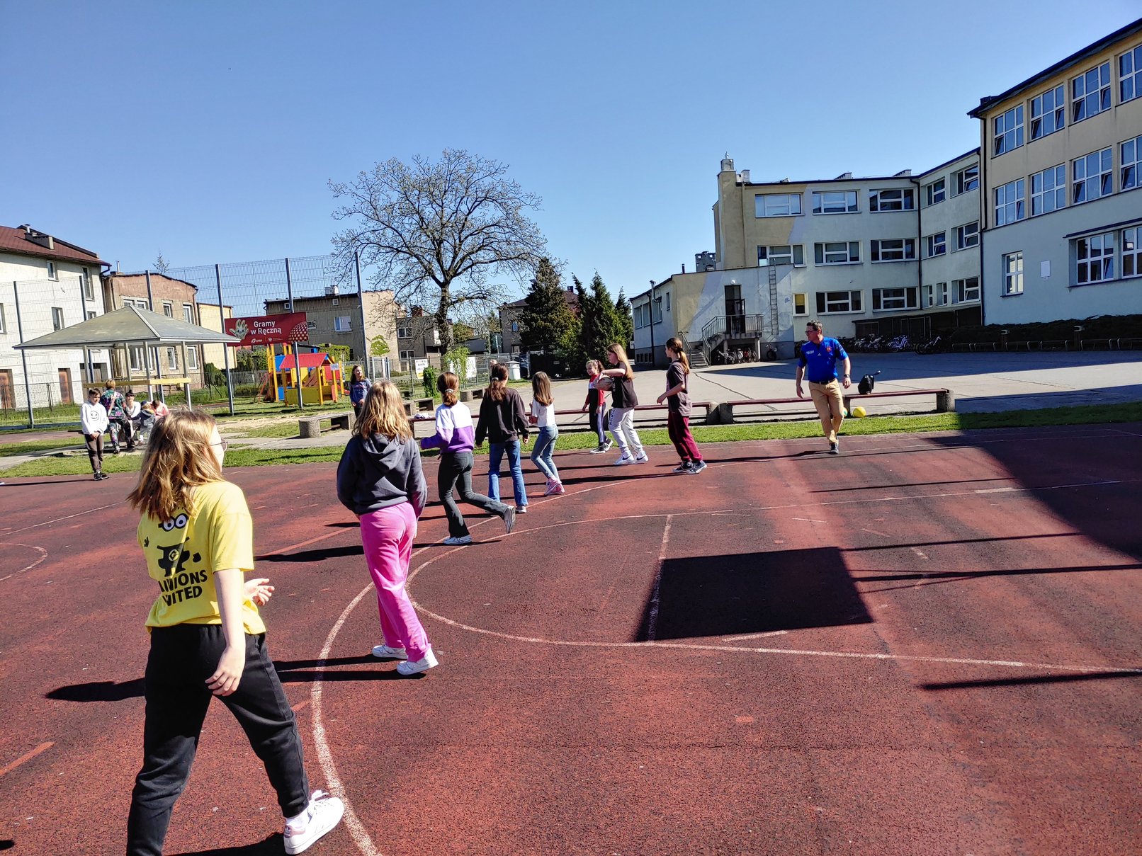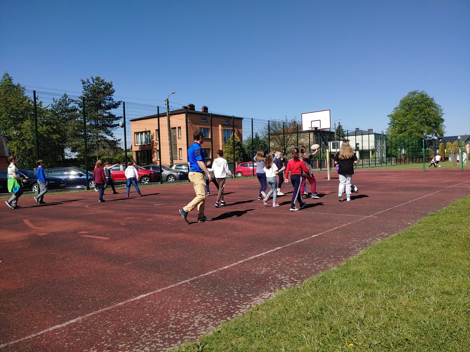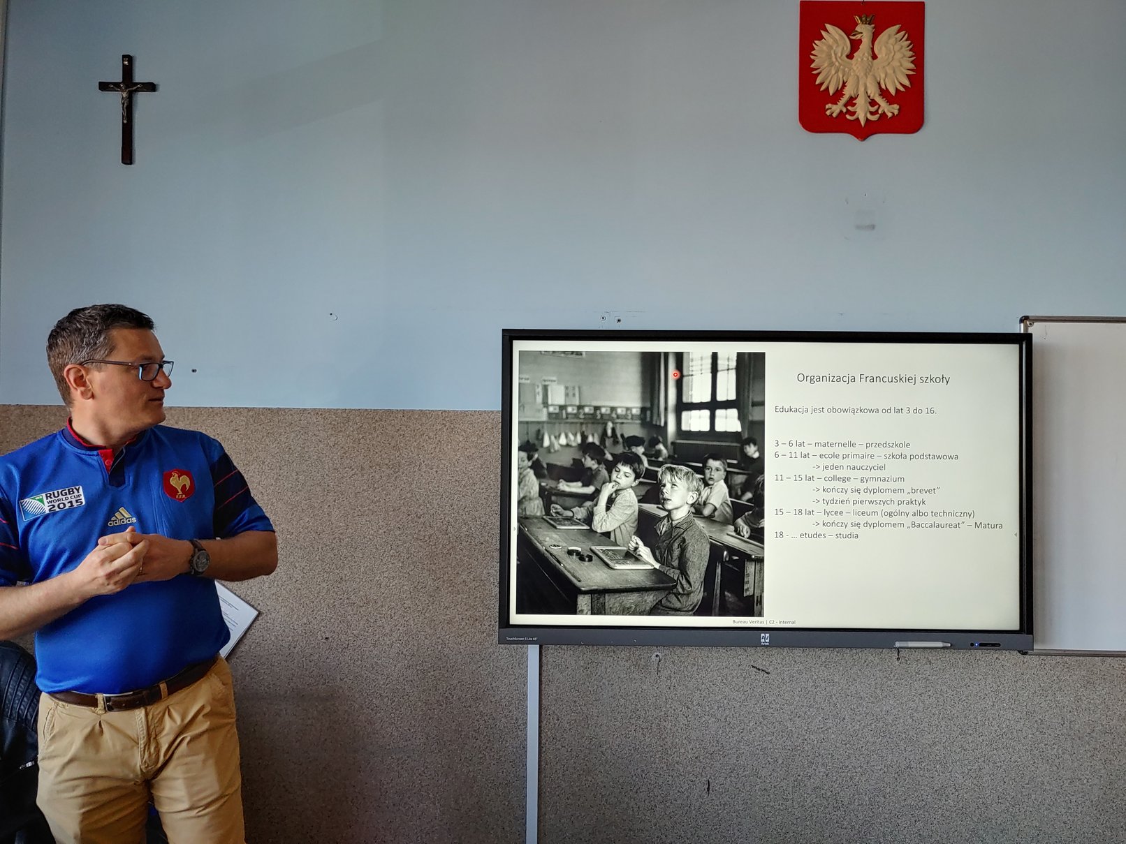 Pan Gilbert jest rodowitym Francuzem, jednak świetnie mówiącym po polsku! Szymon wraz ze swoim tatą przeczytali piękną francuszczyzną fragment „Mikołajka”, a następnie pan Kwarciak przedstawił czwartoklasistom prezentację o francuskiej szkole, tej dawnej i tej współczesnej. Nie zabrakło też wiadomości o różnicach między naszymi krajami i wielu ciekawostek. Pan Gilbert chętnie odpowiadał na pytania kolegów i koleżanek swojego syna, chociażby o to, jak nauczyć się tak dobrze języka obcego. Czwartoklasiści poznali kilka podstawowych zwrotów w języku francuskim i bardzo dobrze sobie poradzili z wymową tego trudnego dla Polaków języka. Skosztowaliśmy pysznych „escargots” upieczonych z ciasta francuskiego przez Szymona i jego mamę.Ale chyba największą atrakcją stała się praktyczna nauka gry w rugby, sport, który uwielbiają Francuzi i jest też hobby pana Gilberta.
