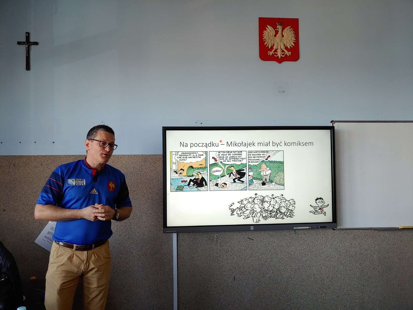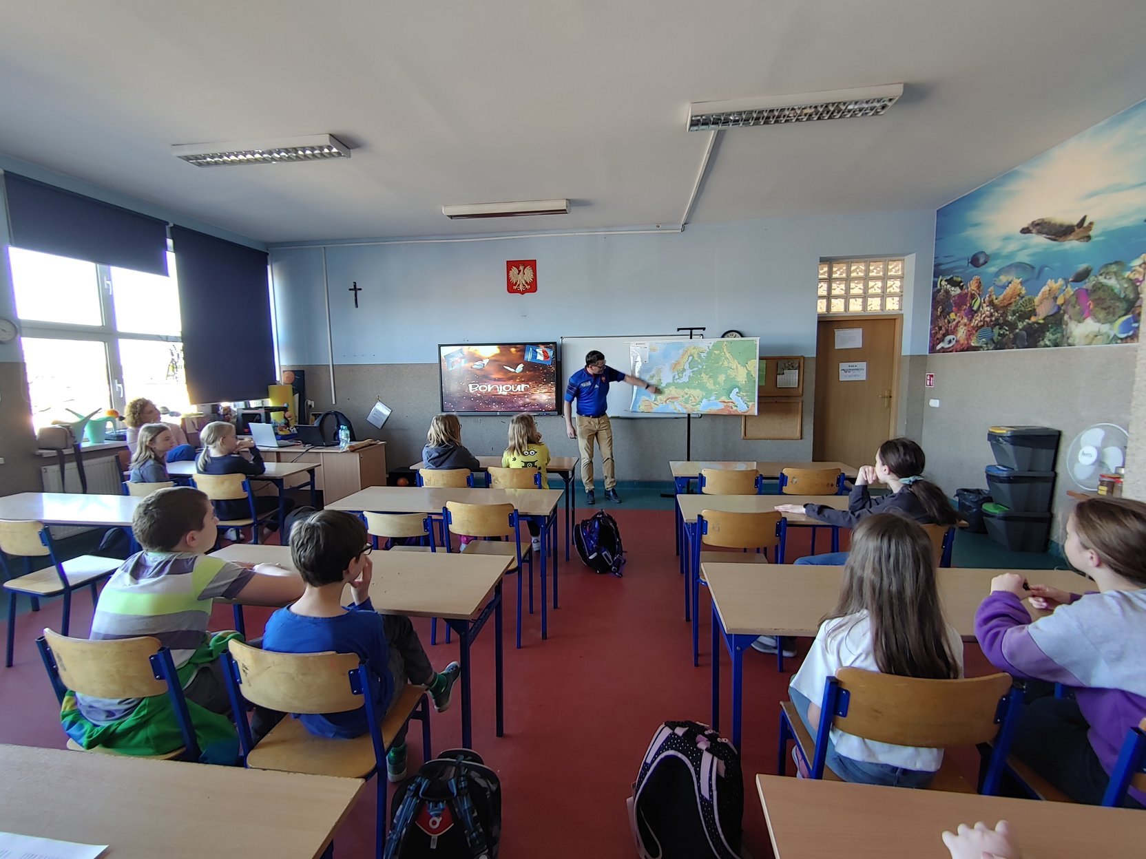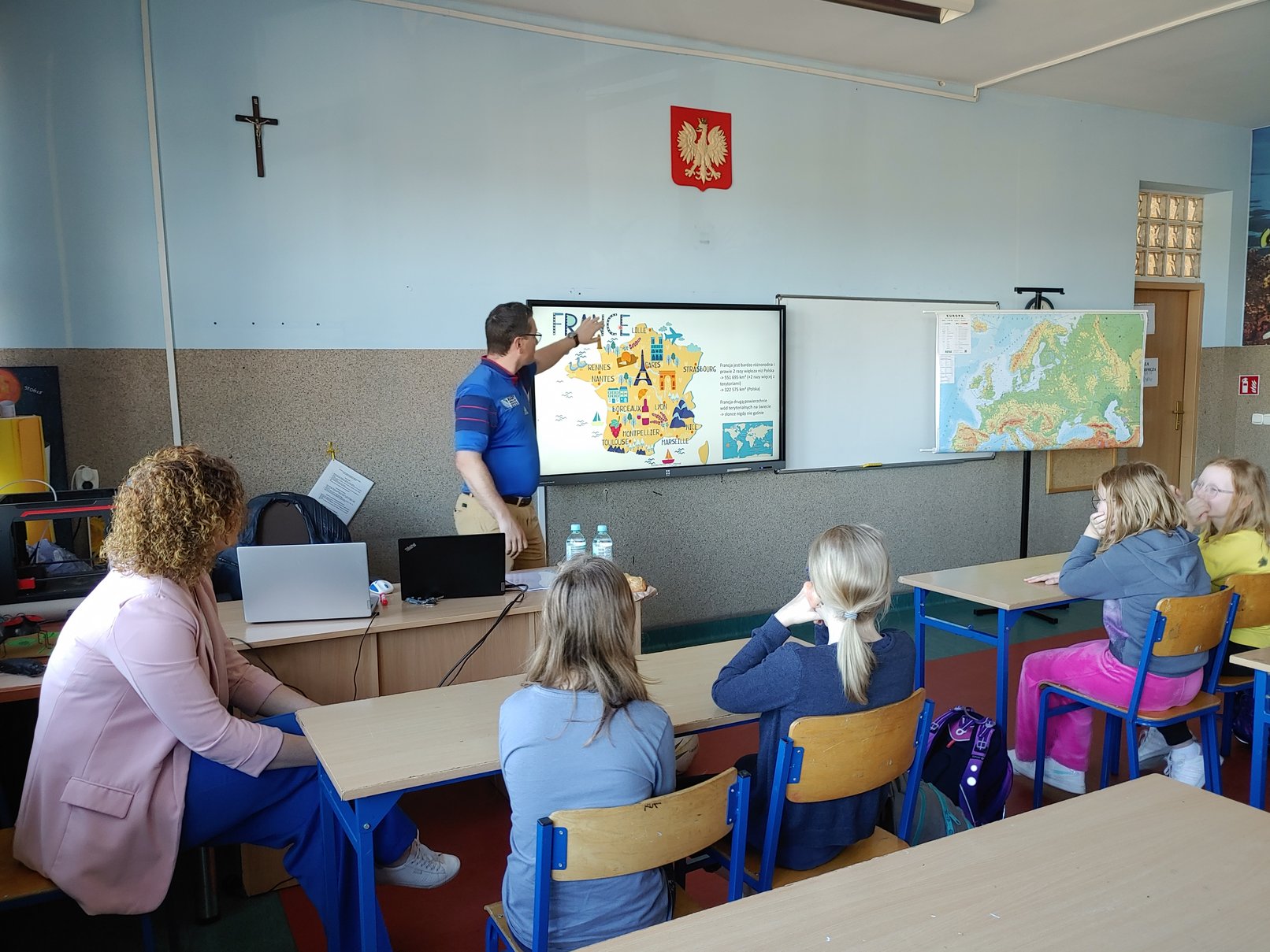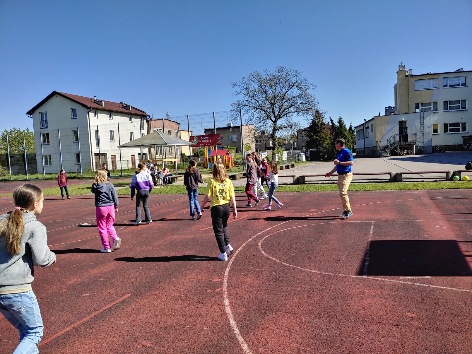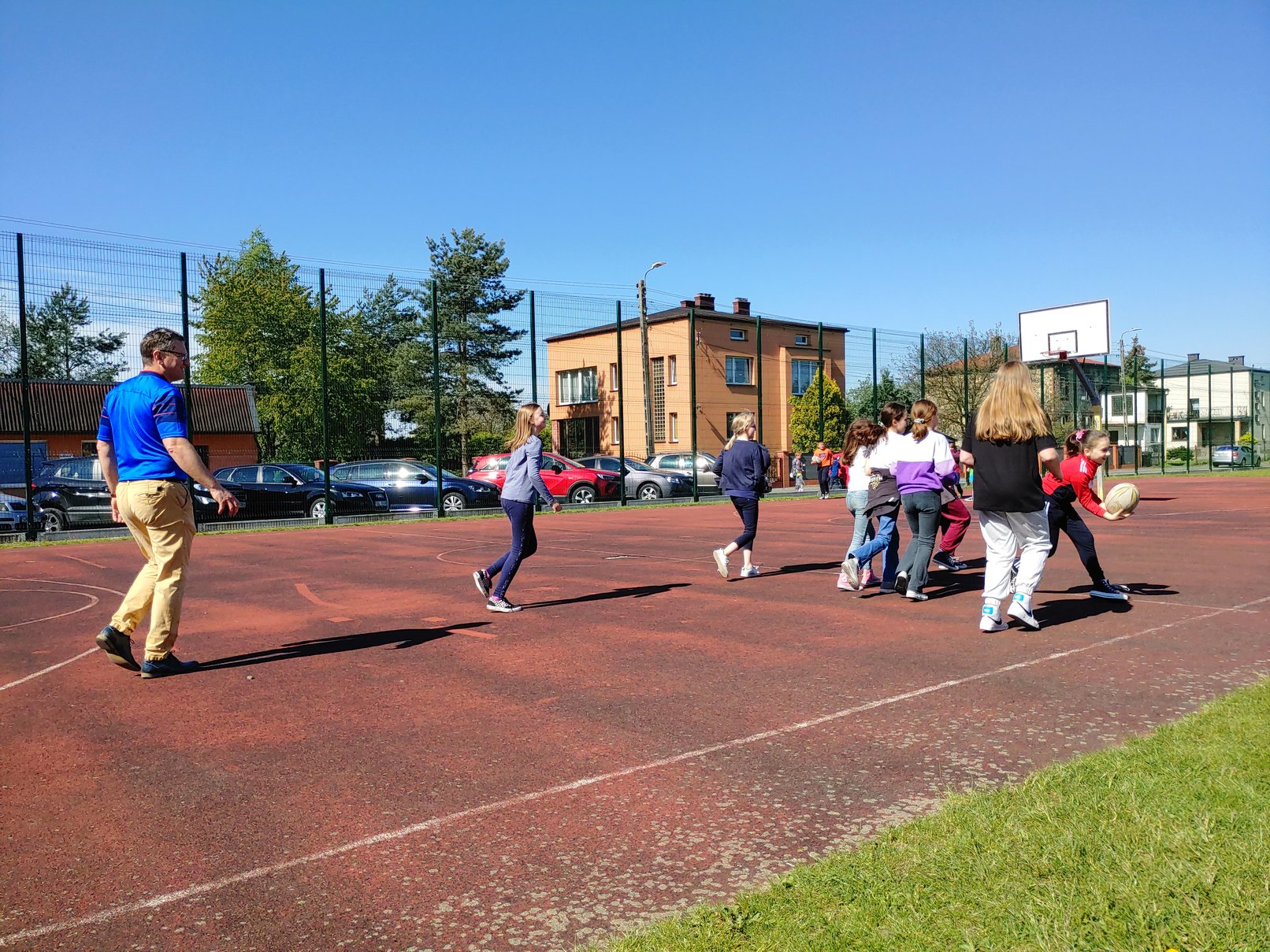 Pan Gilbert jest rodowitym Francuzem, jednak świetnie mówiącym po polsku! Szymon wraz ze swoim tatą przeczytali piękną francuszczyzną fragment „Mikołajka”, a następnie pan Kwarciak przedstawił czwartoklasistom prezentację o francuskiej szkole, tej dawnej i tej współczesnej. Nie zabrakło też wiadomości o różnicach między naszymi krajami i wielu ciekawostek. Pan Gilbert chętnie odpowiadał na pytania kolegów i koleżanek swojego syna, chociażby o to, jak nauczyć się tak dobrze języka obcego. Czwartoklasiści poznali kilka podstawowych zwrotów w języku francuskim i bardzo dobrze sobie poradzili z wymową tego trudnego dla Polaków języka. Skosztowaliśmy pysznych „escargots” upieczonych z ciasta francuskiego przez Szymona i jego mamę.Ale chyba największą atrakcją stała się praktyczna nauka gry w rugby, sport, który uwielbiają Francuzi i jest też hobby pana Gilberta.