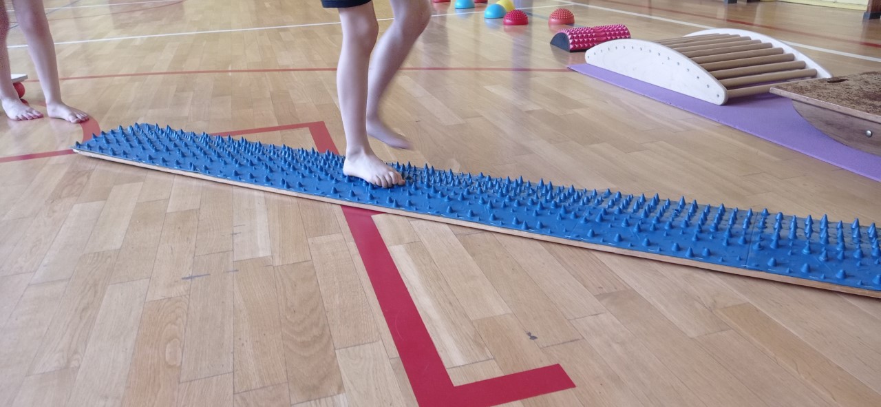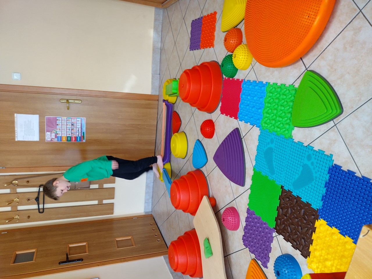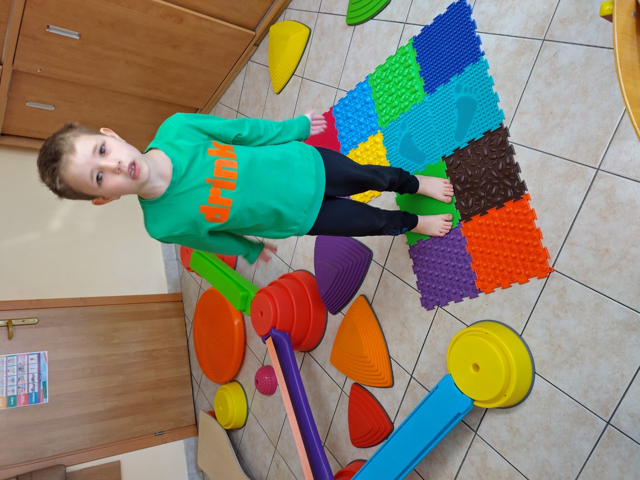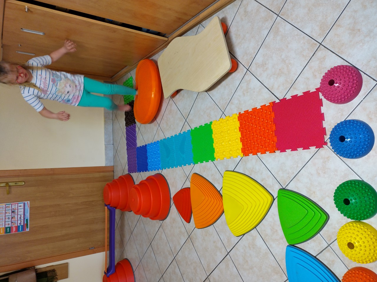 Majowe, ostatnie zadanie z Ogólnopolskiego Projektu „Gramy zmysłami” – to „Ścieżka sensoryczna”, realizowane na wybranych zajęciach logopedycznych, rewalidacyjnych i gimnastyki korekcyjnej.