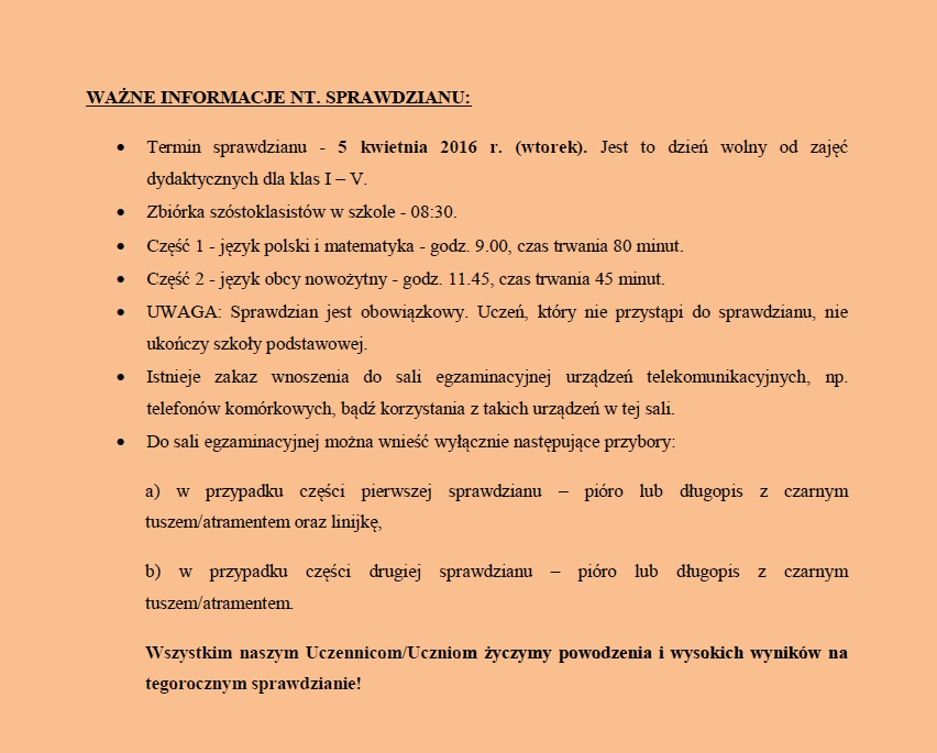 JUTRO SPRAWDZIAN TRZECIOKLASISTY - UWAGA: ZMIANA PLANU!
