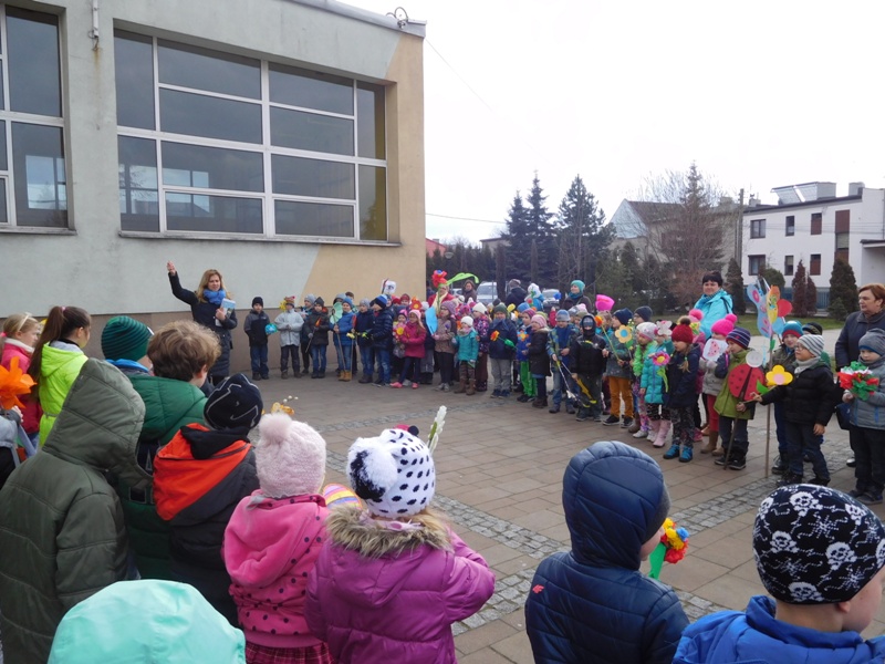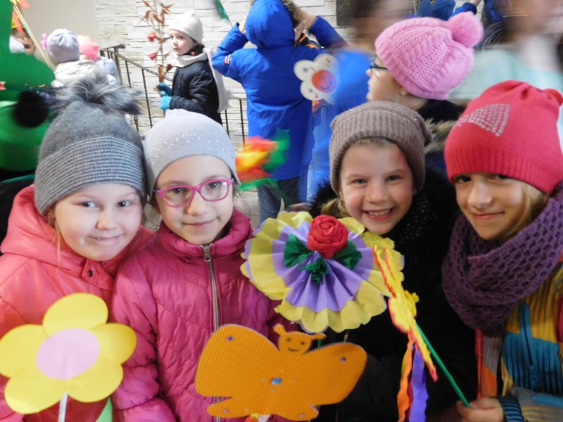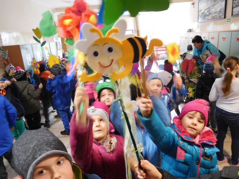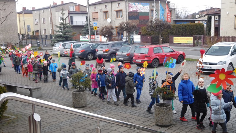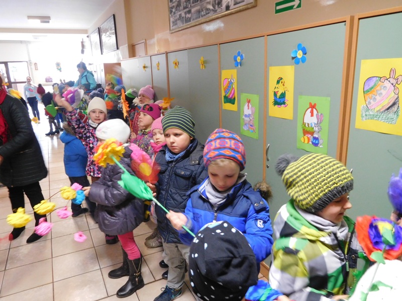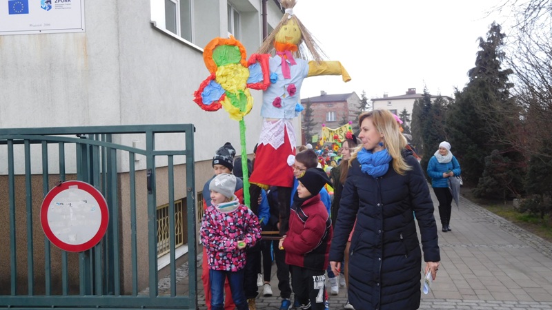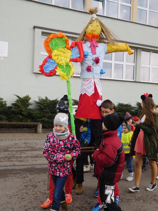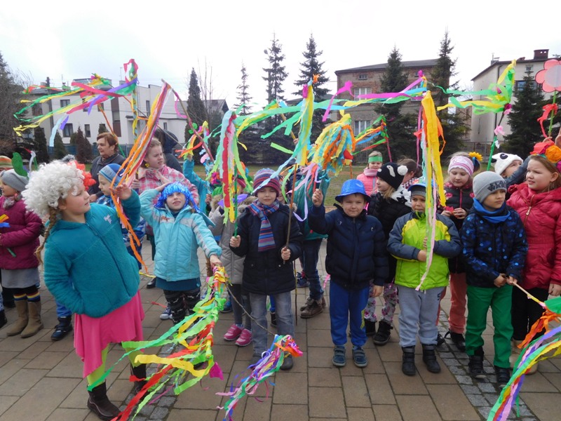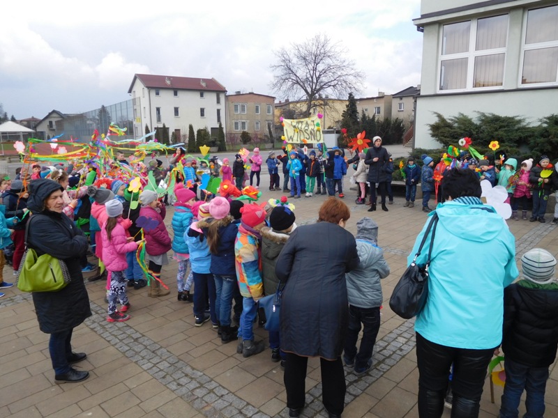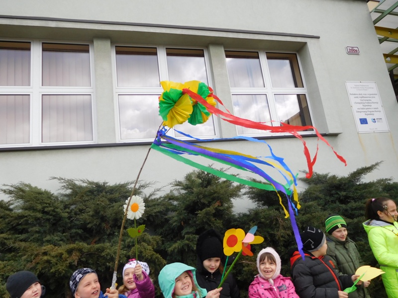 Można by rzec, iż klasy I-III celebrowały ten dzień trochę huczniej niż inni. Jednym za to nie odbiegały od starszaków- także w ich stroju zagościł żółty lub zielony kolor. Każdy z maluchów przyniósł (zrobionego przez siebie) kwiatka. Nasi kochani nauczyciele zadbali także o marzannę, która nieodłącznie kojarzy się z pożegnaniem zimy. Jak co roku nasi milusińscy wyruszyli w korowód wiosenny którego celem było powitanie długo wyczekiwanej wiosny. Po takiej paradzie zima na pewno do nas nie wróci.