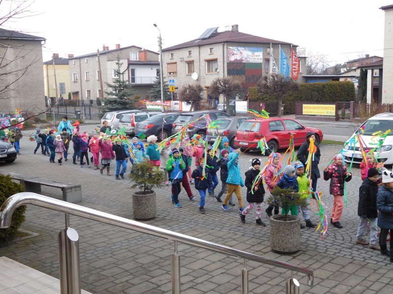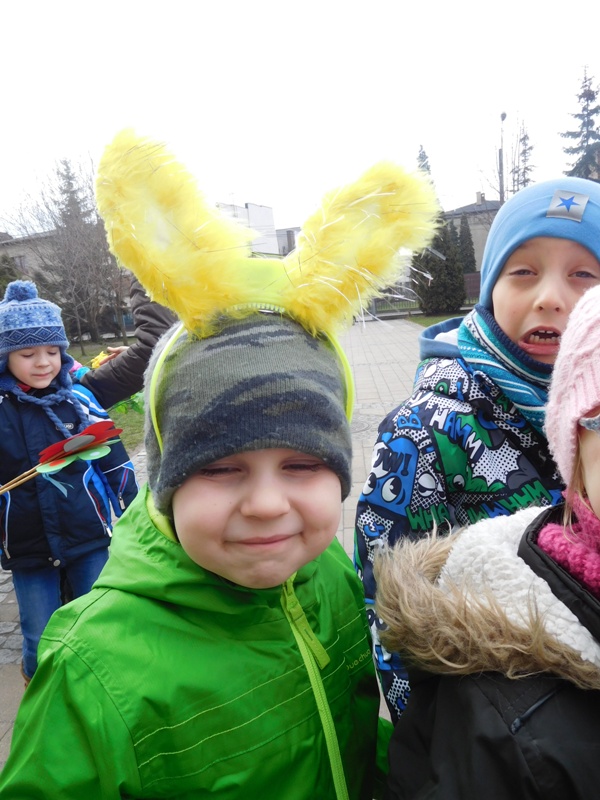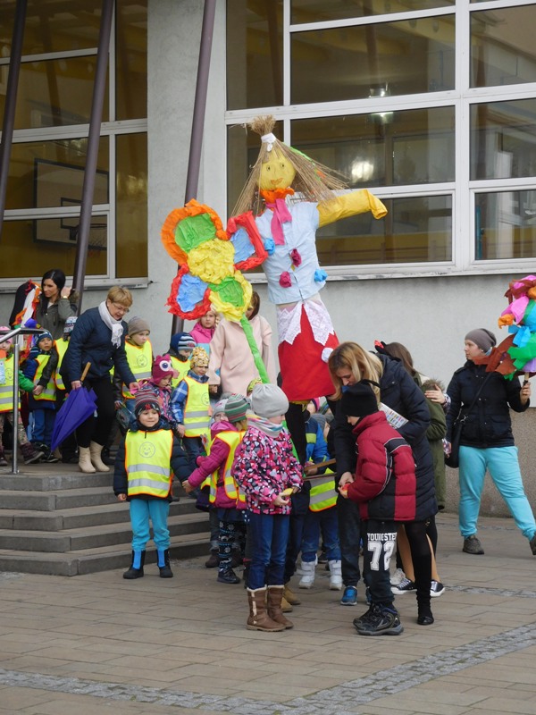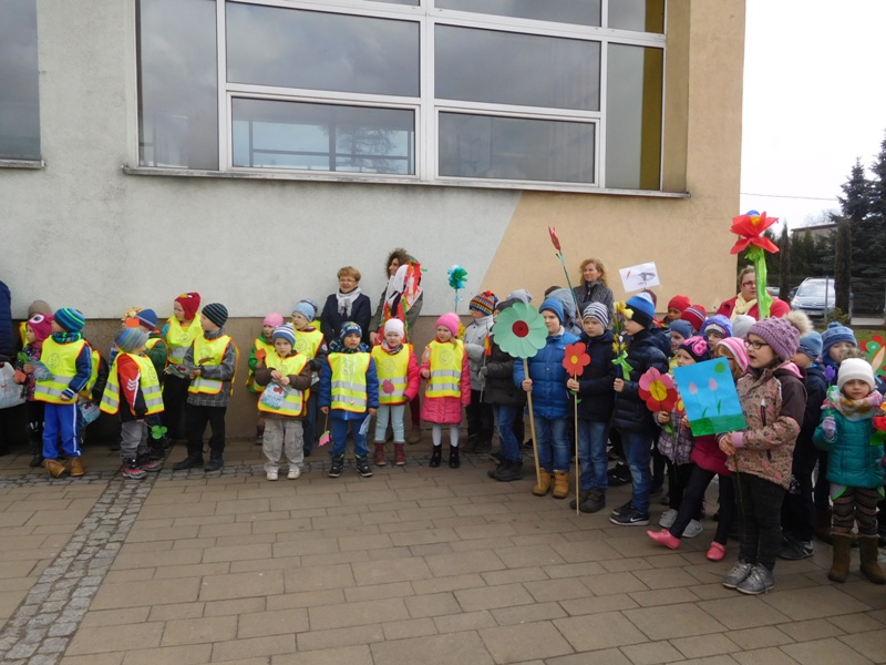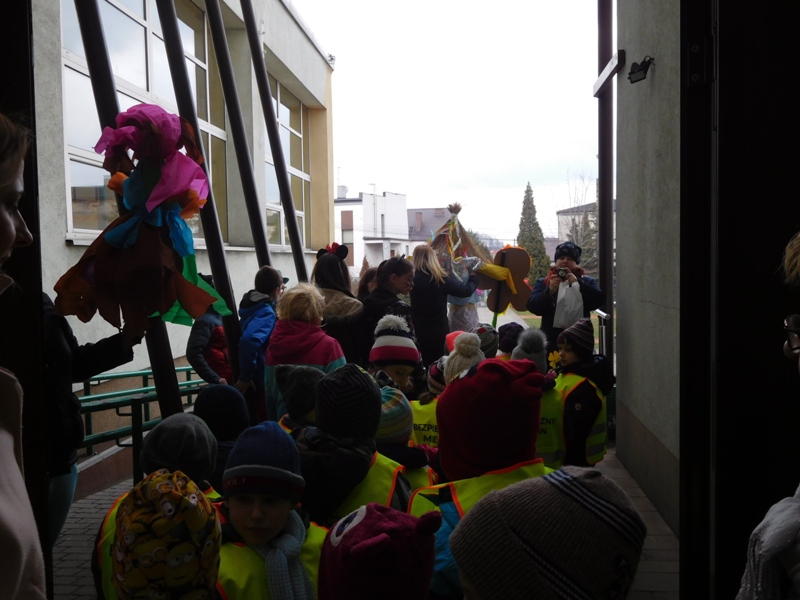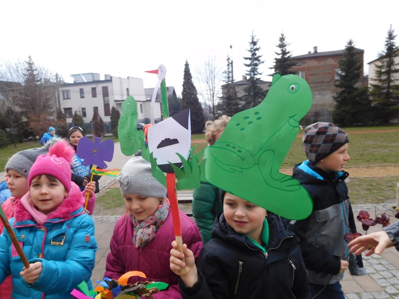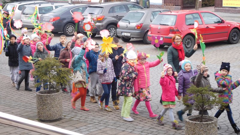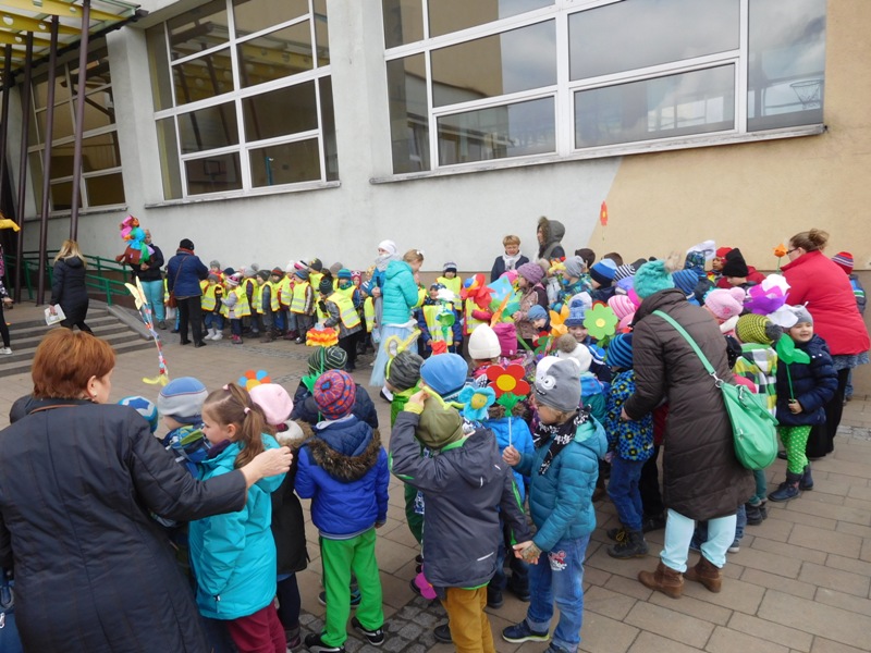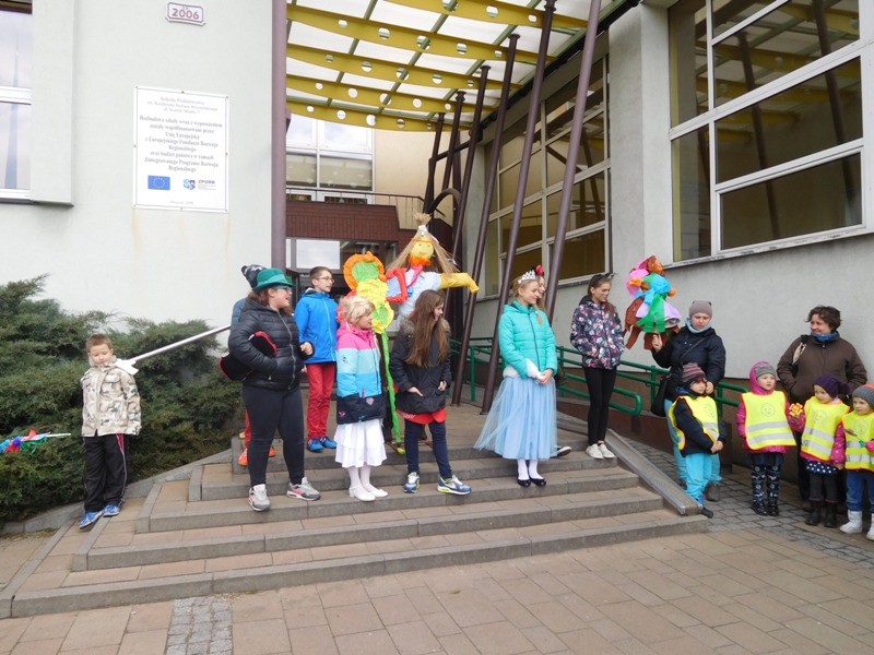 Można by rzec, iż klasy I-III celebrowały ten dzień trochę huczniej niż inni. Jednym za to nie odbiegały od starszaków- także w ich stroju zagościł żółty lub zielony kolor. Każdy z maluchów przyniósł (zrobionego przez siebie) kwiatka. Nasi kochani nauczyciele zadbali także o marzannę, która nieodłącznie kojarzy się z pożegnaniem zimy. Jak co roku nasi milusińscy wyruszyli w korowód wiosenny którego celem było powitanie długo wyczekiwanej wiosny. Po takiej paradzie zima na pewno do nas nie wróci.