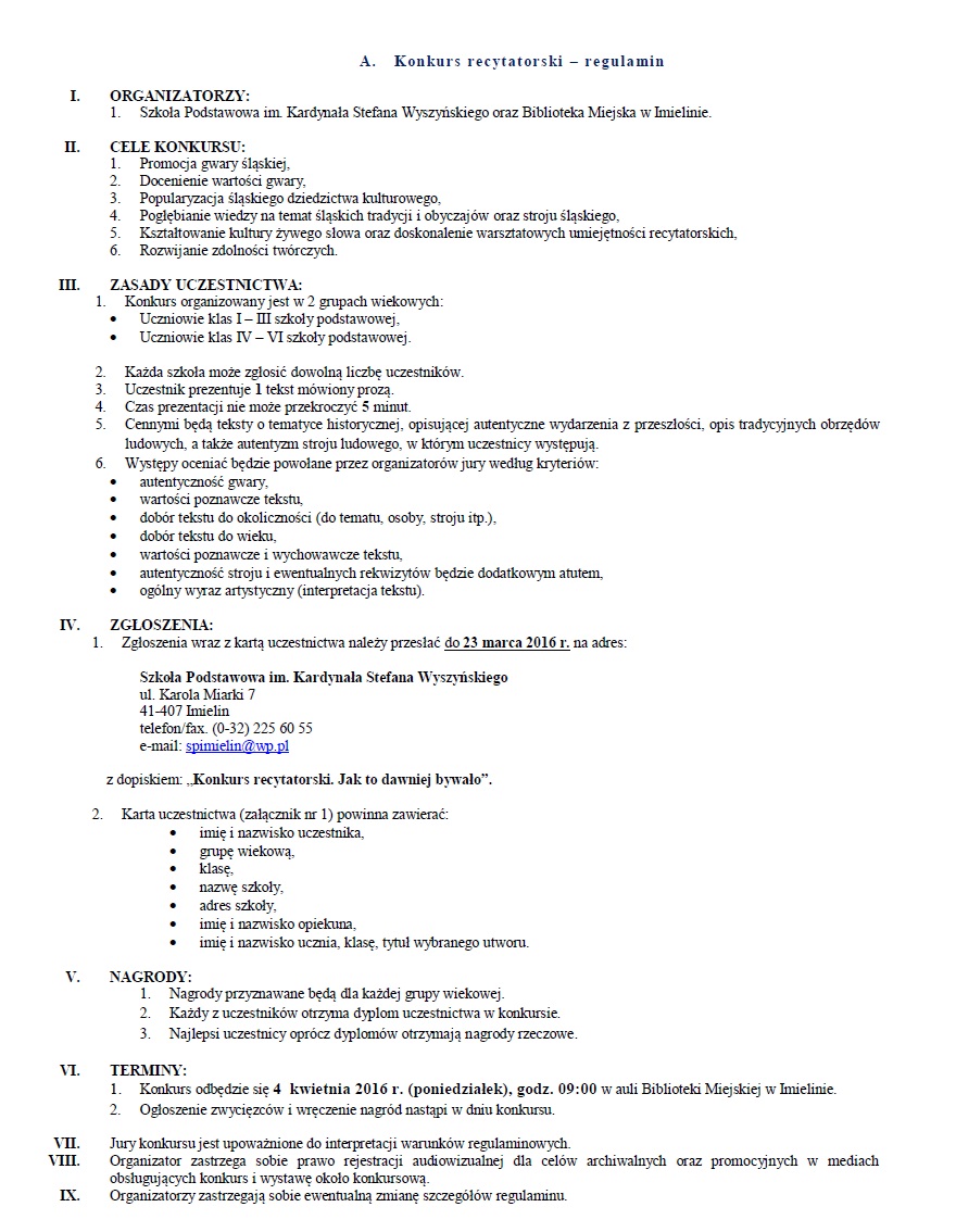 Serdecznie zapraszam uczniów i uczennice wszystkich szkół podstawowych naszego powiatu do udziału w IV Konkursie Gwary Śląskiej pt. "Jak to dawniej bywało". Konkurs, którego nasza szkoła jest współorganizatorem, odbędzie się 4 kwietnia br. w auli Biblioteki Miejskiej w Imielinie. (UWAGA: termin zgłoszeń upływa 23 marca).