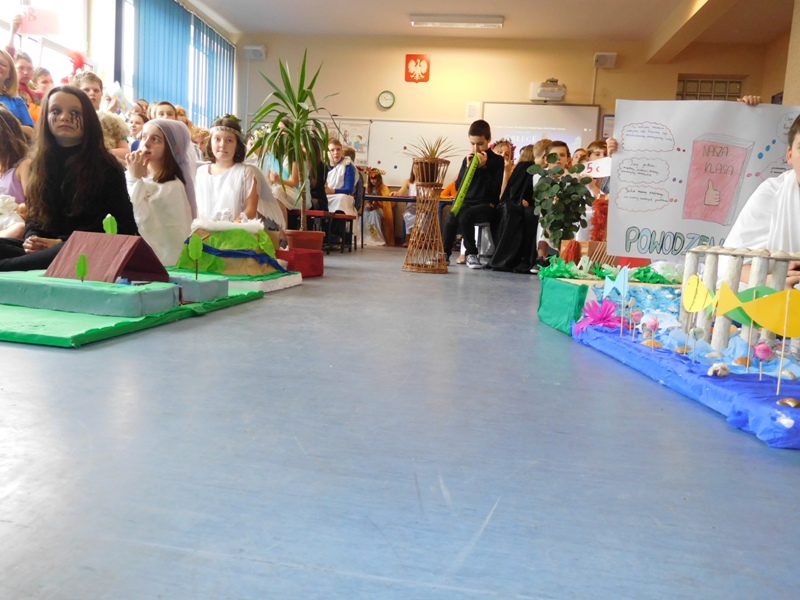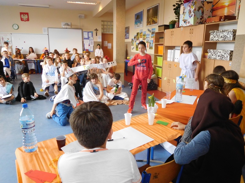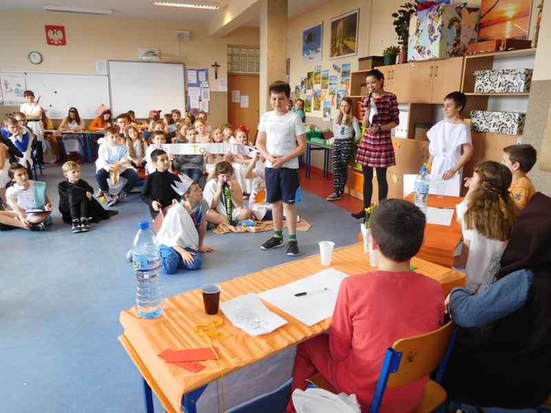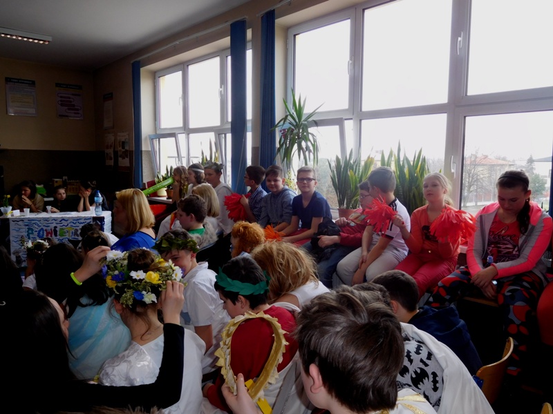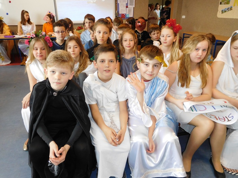 Zwieńczeniem mitologicznego cyklu lekcji były w tym roku szkolnym uczty bogów olimpijskich oraz projekty plastyczne, filmowe. Ponadto wszyscy uczniowie napisali test, który stał się podstawą do wyłonienia klasowych reprezentacji do II etapu konkursu mitologicznego. Dnia 8 marca na korytarzach naszej szkoły pojawili się niezwykli goście. Był Zeus z braćmi, jego żona Hera, Afrodyta, Demeter wraz w Korą, Atena, Ares… słowem, cały olimpijski parnas. A nawet kilku śmiertelników o boskich koneksjach. W ich role wcielili się uczniowie klas V, którzy wzięli udział w niecodziennym pokazie mody, będącym wstępem do wielkiego turnieju mitologicznego. Pokaz poprowadziła Olivia Bortel, która przybrała postać złośliwej Eris, bogini niezgody. Nie szczędziła ona naszym modelkom i modelom uszczypliwych uwag; oto mała próbka jej możliwości: "Ojciec i syn, realista i marzyciel – Dedal i Ikar. Powitajmy Szymona Pawlasa oraz Kamila Gawlika. Oj, Ikarku, dlaczego nie posłuchałeś tatusia? Zawsze urocza, zawsze młoda Hebe. Powiedz lepiej, jaki masz krem na te zmarszczki, Julio Pańczuk". Zebranie mieli również niepowtarzalną okazję usłyszeć powitanie wygłoszone w języku greckim przez Victorię Adamidis z klasy V "d":