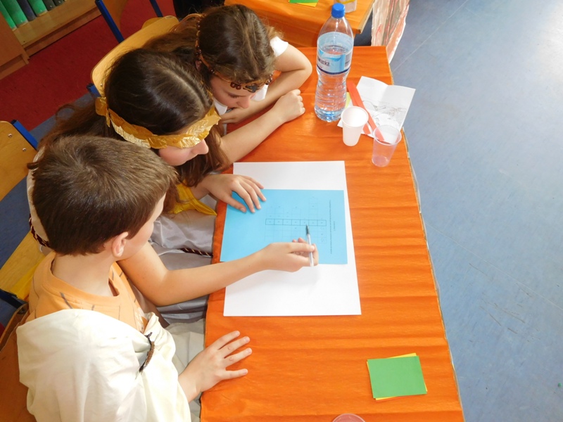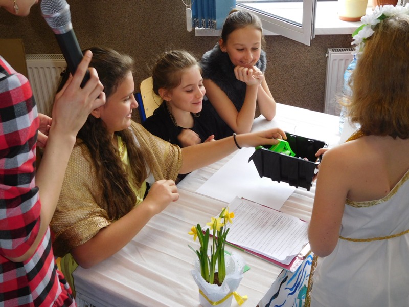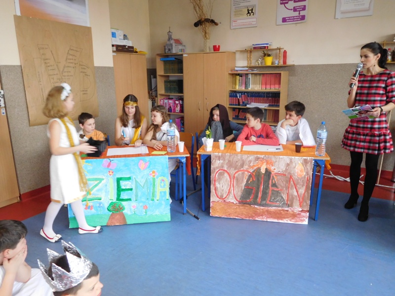 Po tej "rozgrzewce" nastąpił konkurs wiedzy o mitach, w którym aktywny udział brali nie tylko reprezentanci klas, ale wszyscy zgromadzeni w sali uczniowie, życzliwie dopingując swoje drużyny. "Jakiego koloru była krew bogów?", "Ile lat Odys przebywał poza domem?", "Kogo Syzyf zamknął w piwnicy?" - z tymi m.in. pytaniami najlepiej poradzili sobie uczniowie klasy V „d” (żywioł powietrza), którzy zajęli I miejsce. O miejsce II walczyli reprezentanci żywiołów ognia – kl. V „b” i wody – kl. V „c”. Ostatecznie srebro przypadło V „c”, zaś brąz V „b”. Tuż za podium znalazła się V „a” (żywioł ziemi).