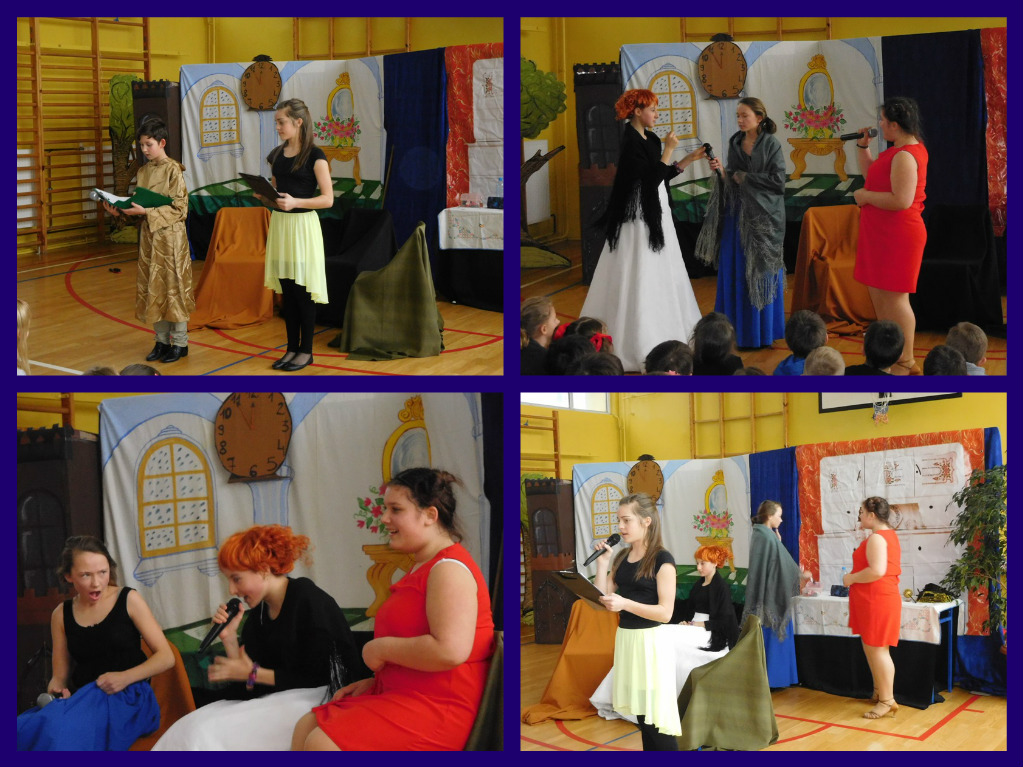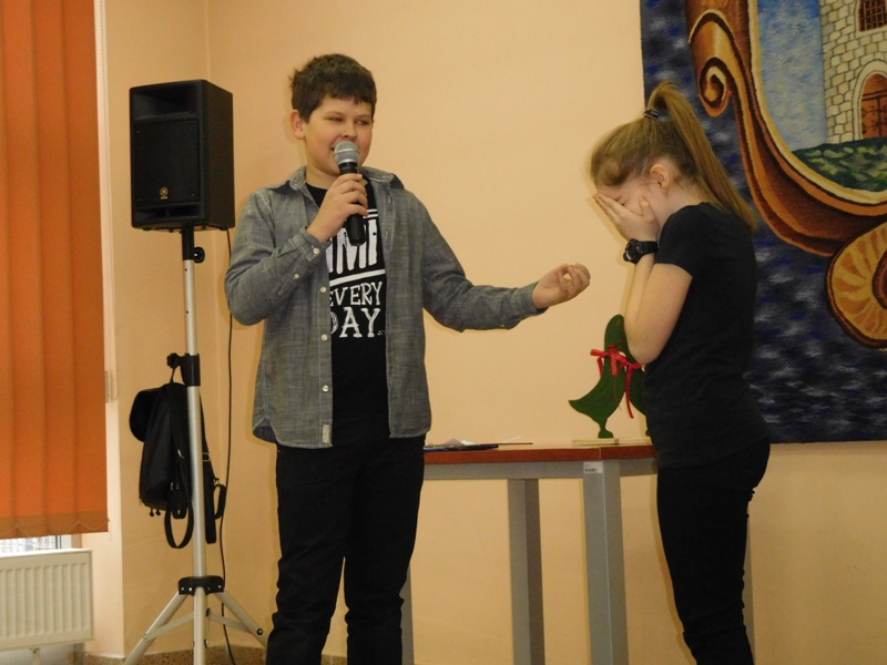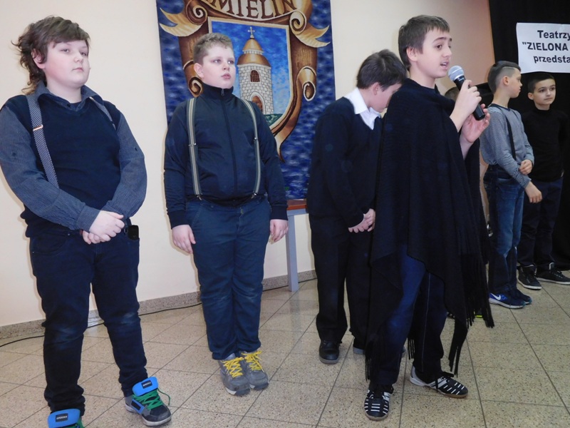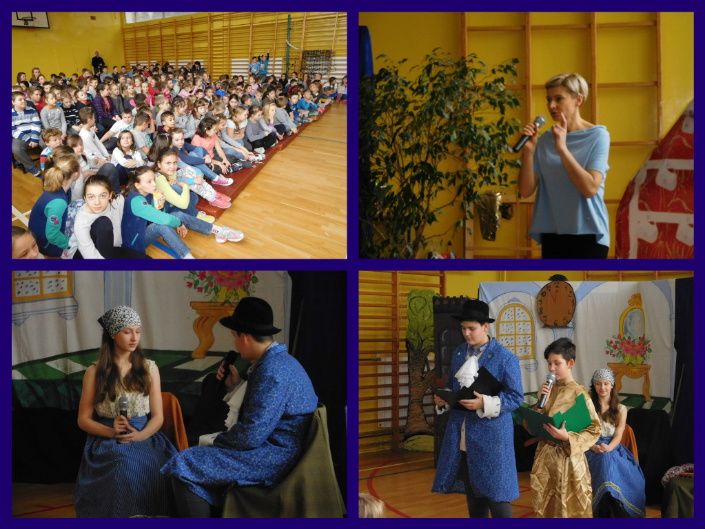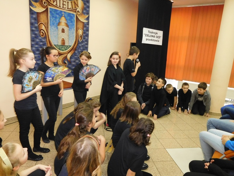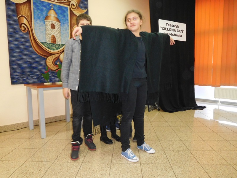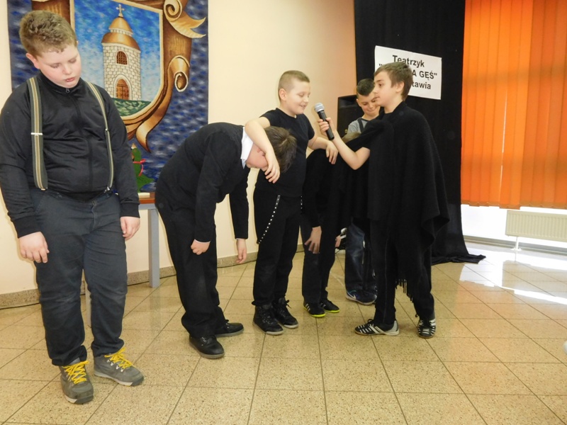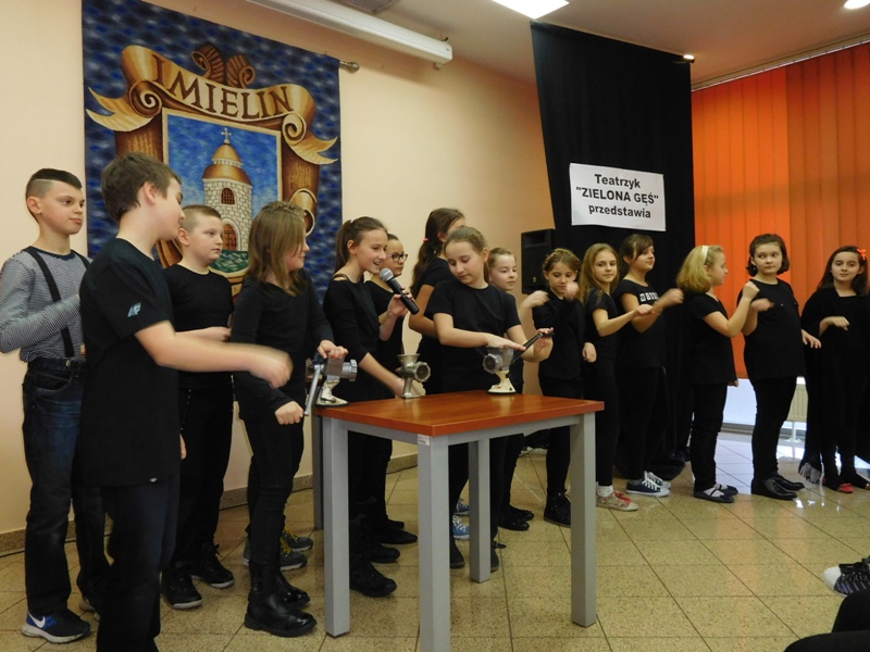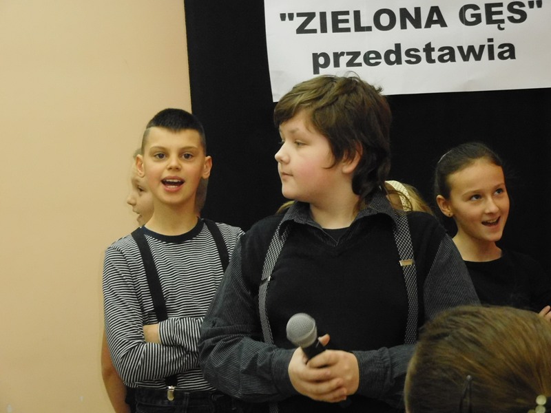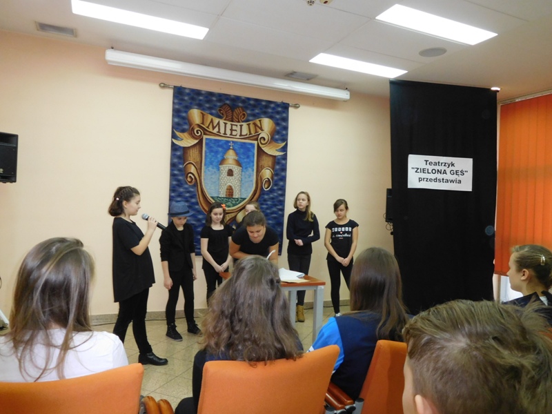 12 lutego klasa V "d" odegrała dla uczniów klas pierwszych imielińskiego gimnazjum przedstawienie, którego scenariusz stworzono w oparciu o teksty autorstwa Konstantego Ildefonsa Gałczyńskiego. Sceny udzieliła - jak zawsze życzliwa - Biblioteka Miejska w Imielinie. Piątoklasiści zaprezentowali starszym kolegom popularne, pełne absurdalnego humoru miniatury teatralne, m.in. "Pozytywnego górala", "Żarłoczną Ewę", "Siedmiu braci śpiących" czy "Biurokratę na wakacjach"; zaśpiewali również 4 piosenki o przedmiotach codziennego użytku: "Durszlak", "Szelki", "Żelazko" i "Maszynkę do mięsa". To już 3 przedstawienie, które klasa przygotowała. Rok temu, w grudniu, V "d" wystawiła „Opowieść wigilijną”, a tuż przed wakacjami humorystyczną sztukę pt. „Książę szuka żony”. Tym razem uczniowie zmierzyli się z zadaniem daleko bardziej poważnym. Wzięli bowiem na warsztat tekst literacki, który chociaż jest humorystyczny i rozrywkowy, to jednak bardzo wymagający zarówno dla aktora jak i dla publiczności. Nazwijmy rzeczy po imieniu: kiedy klasa pierwszy raz przeczytała scenariusz, to polonistka długo musiała tłumaczyć, co powinno śmieszyć i dlaczego... Jednak nie tylko V "d" miała problem z oswojeniem „Zielonej Gęsi”. Zanim publika przyzwyczaiła się do humoru „Teatrzyku Zielona Gęś", podnoszono liczne protesty i głosy oburzenia. Dzisiaj w dobie zwariowanych kabaretów i prześmiewczych satyryków dowcipy Konstantego Ildefonsa Gałczyńskiego już nikogo nie szokują. Ale śmieszą nadal, a przy tym zmuszają do refleksji nad naszym życiem i relacjami między ludźmi. Już wkrótce zaprosimy Was do wspólnej zabawy i rozmyślań podczas oglądania „Najmniejszego Teatrzyku Świata” w wykonaniu klasy V „d”! (film w przygotowaniu!); tymczasem zobaczcie fotorelację.
