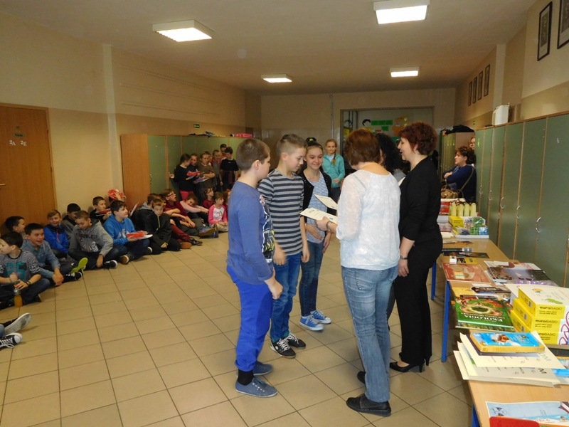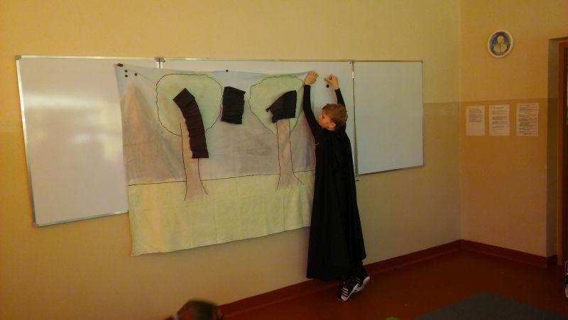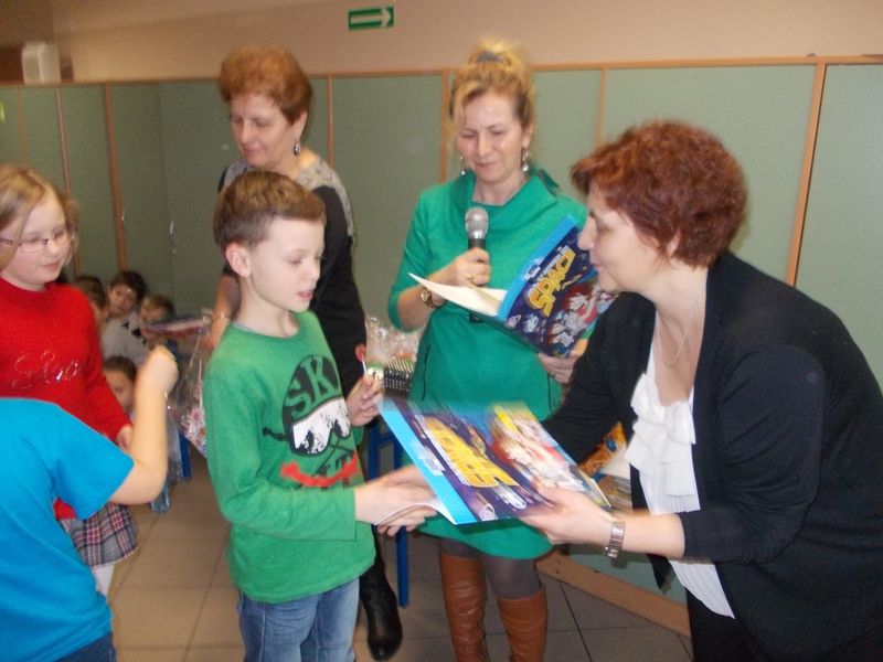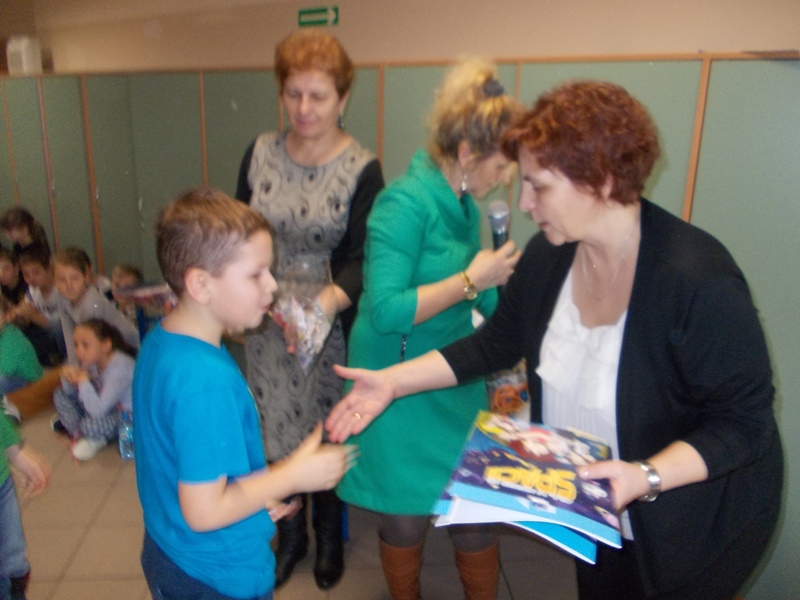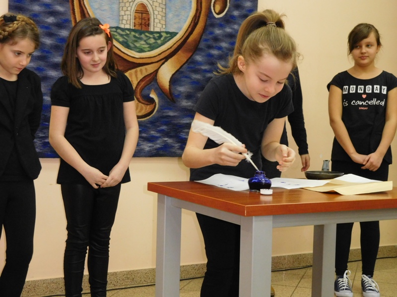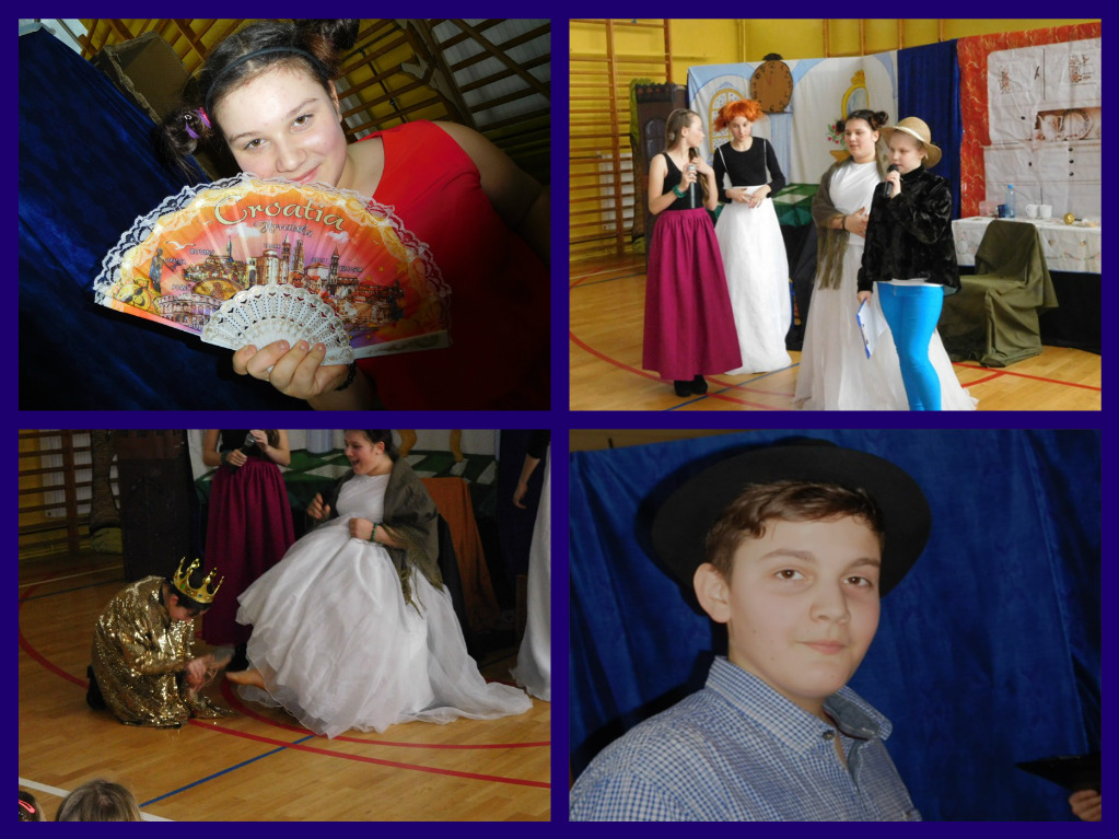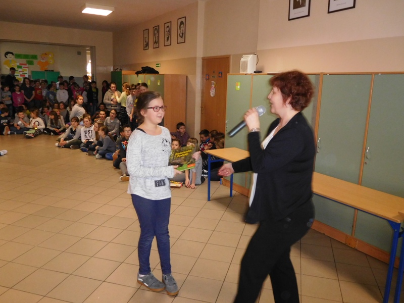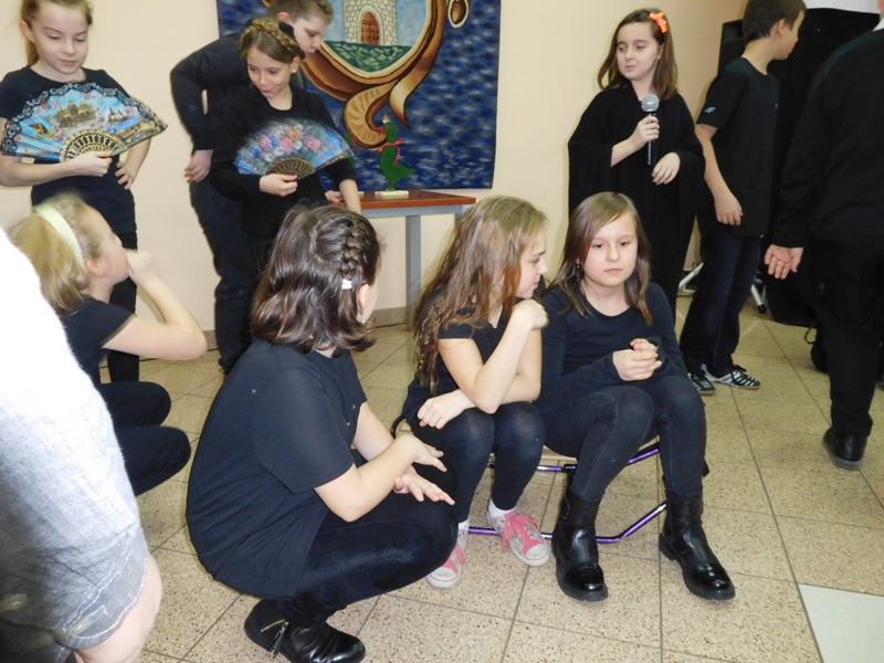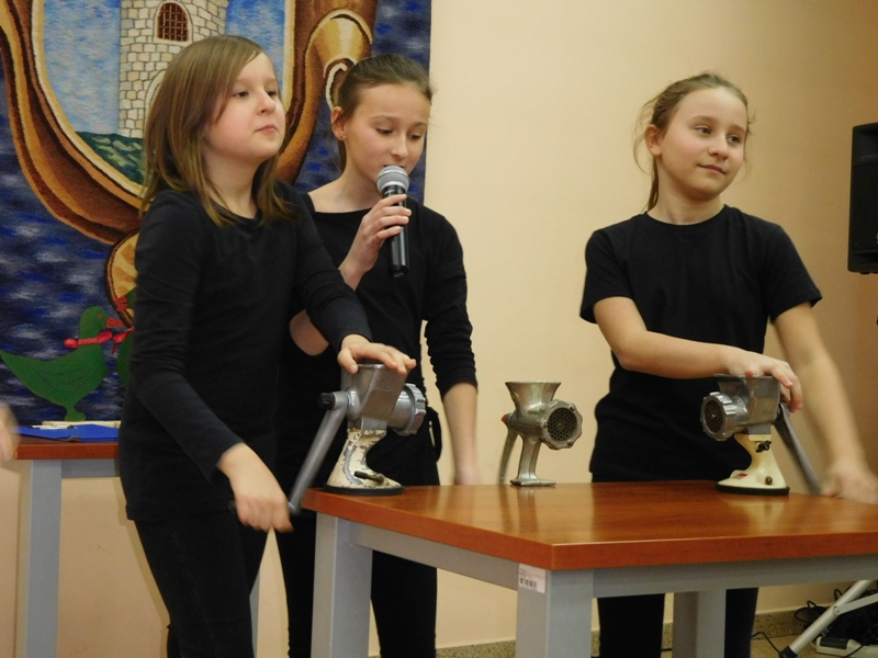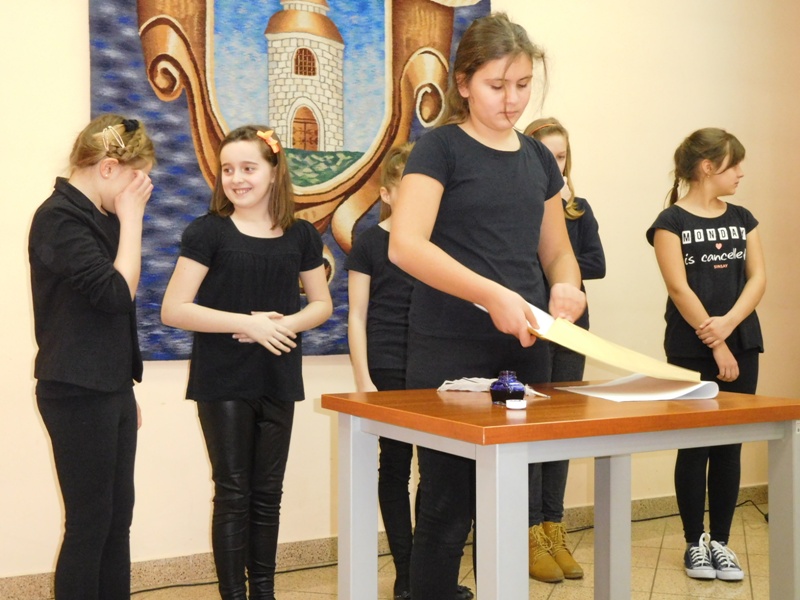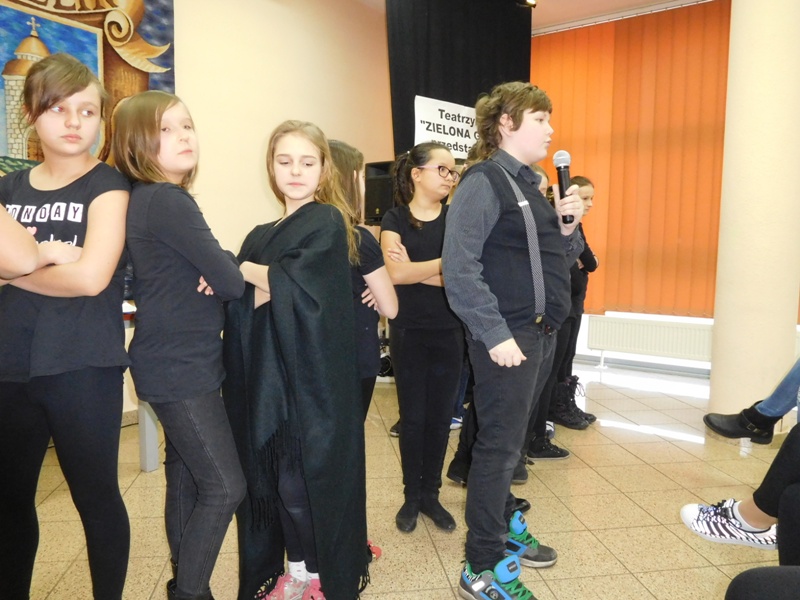 12 lutego klasa V "d" odegrała dla uczniów klas pierwszych imielińskiego gimnazjum przedstawienie, którego scenariusz stworzono w oparciu o teksty autorstwa Konstantego Ildefonsa Gałczyńskiego. Sceny udzieliła - jak zawsze życzliwa - Biblioteka Miejska w Imielinie. Piątoklasiści zaprezentowali starszym kolegom popularne, pełne absurdalnego humoru miniatury teatralne, m.in. "Pozytywnego górala", "Żarłoczną Ewę", "Siedmiu braci śpiących" czy "Biurokratę na wakacjach"; zaśpiewali również 4 piosenki o przedmiotach codziennego użytku: "Durszlak", "Szelki", "Żelazko" i "Maszynkę do mięsa". To już 3 przedstawienie, które klasa przygotowała. Rok temu, w grudniu, V "d" wystawiła „Opowieść wigilijną”, a tuż przed wakacjami humorystyczną sztukę pt. „Książę szuka żony”. Tym razem uczniowie zmierzyli się z zadaniem daleko bardziej poważnym. Wzięli bowiem na warsztat tekst literacki, który chociaż jest humorystyczny i rozrywkowy, to jednak bardzo wymagający zarówno dla aktora jak i dla publiczności. Nazwijmy rzeczy po imieniu: kiedy klasa pierwszy raz przeczytała scenariusz, to polonistka długo musiała tłumaczyć, co powinno śmieszyć i dlaczego... Jednak nie tylko V "d" miała problem z oswojeniem „Zielonej Gęsi”. Zanim publika przyzwyczaiła się do humoru „Teatrzyku Zielona Gęś", podnoszono liczne protesty i głosy oburzenia. Dzisiaj w dobie zwariowanych kabaretów i prześmiewczych satyryków dowcipy Konstantego Ildefonsa Gałczyńskiego już nikogo nie szokują. Ale śmieszą nadal, a przy tym zmuszają do refleksji nad naszym życiem i relacjami między ludźmi. Już wkrótce zaprosimy Was do wspólnej zabawy i rozmyślań podczas oglądania „Najmniejszego Teatrzyku Świata” w wykonaniu klasy V „d”! (film w przygotowaniu!); tymczasem zobaczcie fotorelację.