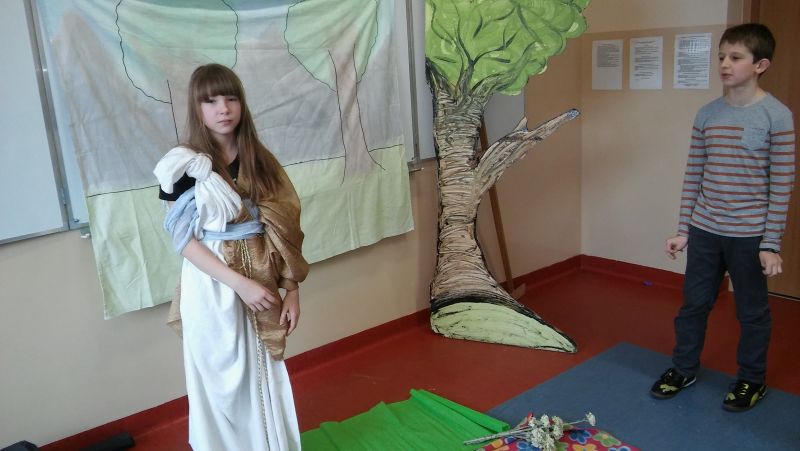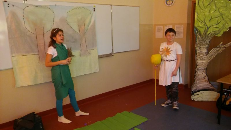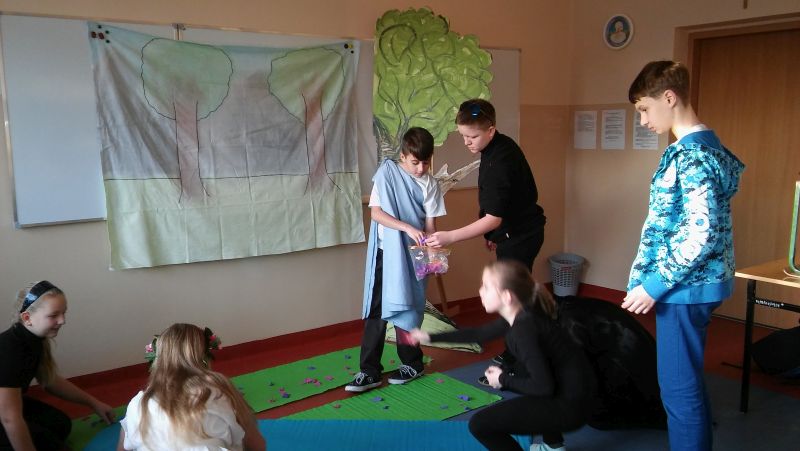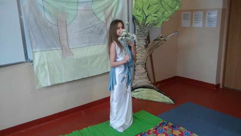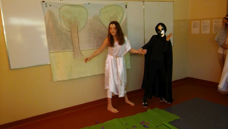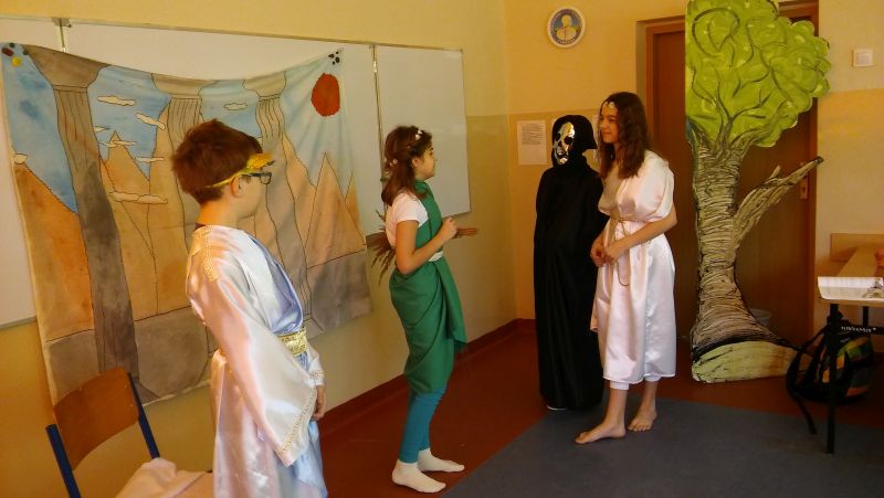 Tak bardzo pokochaliśmy mity greckie, że postanowiliśmy nakręcić film o „Demeter i Korze”. Sami opracowaliśmy scenariusz, przygotowaliśmy dekoracje, stroje, nagraliśmy muzykę, wyreżyserowaliśmy i zmontowaliśmy film. Przekonaliśmy się na własnej skórze, jak niełatwa jest rola reżysera, który musi dopilnować, aby wszystko grało. Jak każde działanie, również nasza inicjatywa poddana została surowej krytyce nas samych. Podczas oglądania nagrania najłatwiej dostrzec popełniane błędy, ale również miło zobaczyć siebie i kolegów, wcielających się w mitologiczne postaci. Nagrywanie filmu okazało się dla nas ciekawą i pouczającą lekcją.