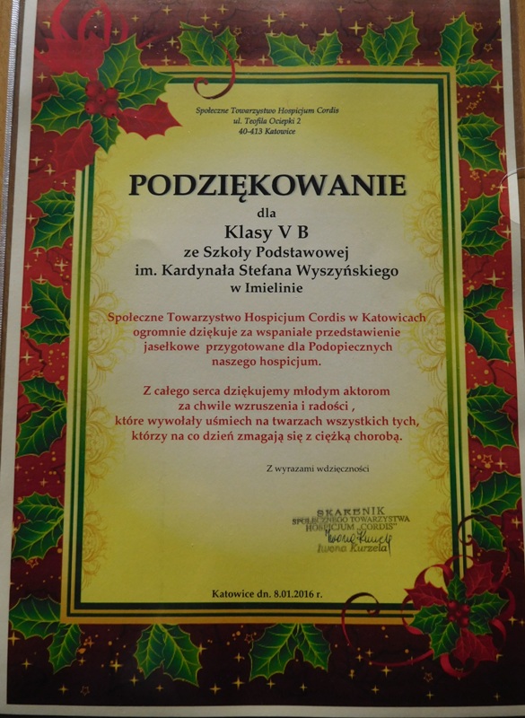 Dnia 8 stycznia uczniowie klasy V "b" wraz ze swoimi katechetkami odwiedzili katowickie hospicjum Cordis, gdzie wystawili tradycyjne jasełka. Nasi wychowankowie kolędowali oraz grali na instrumentach dla podopiecznych hospicjum.