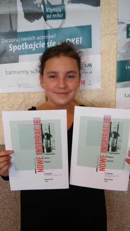 Nasza koleżanka, Ania Kurek, ma już na swoim koncie kilka wierszy i tekstów, które zostały zauważone w konkursach. Tym razem Ania postanowiła wziąć udział w IX Ogólnopolskim Konkursie Poetyckim „NOWE INSPIRACJE”. Napisała dwa wiersze: HAIKU oraz wiersz dowolny pt. „Cisza”. W obu kategoriach zajęła 3 miejsce. Poetka twierdzi, że wynik bardzo ją zaskoczył, ponieważ w konkursie startowało wielu uczestników. W nagrodę otrzymała od organizatorów aż 11 książek. Ania uwielbia czytać oraz pisać wiersze, bo sprawia jej to wiele przyjemności.