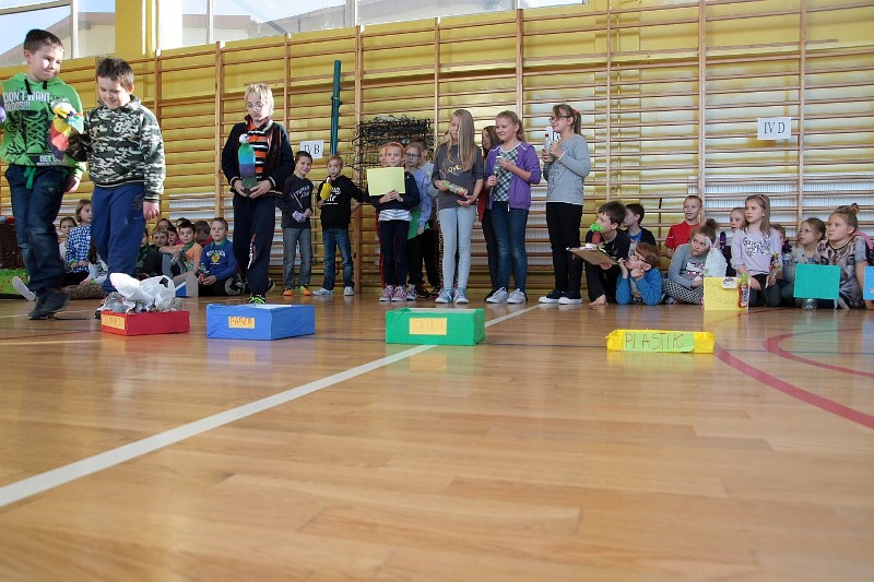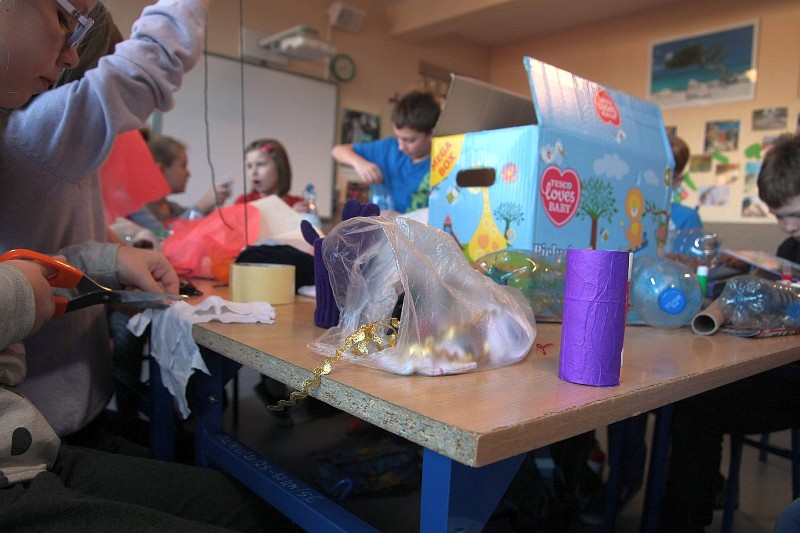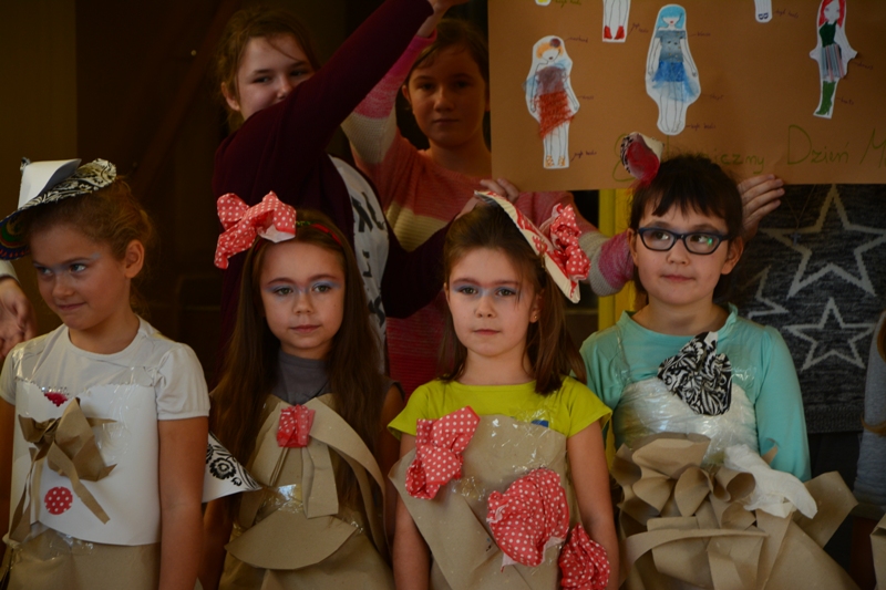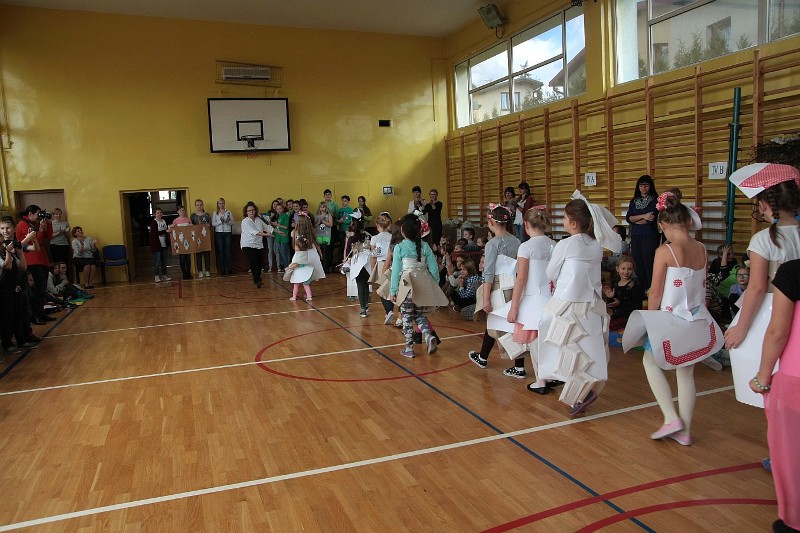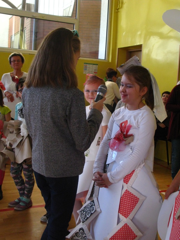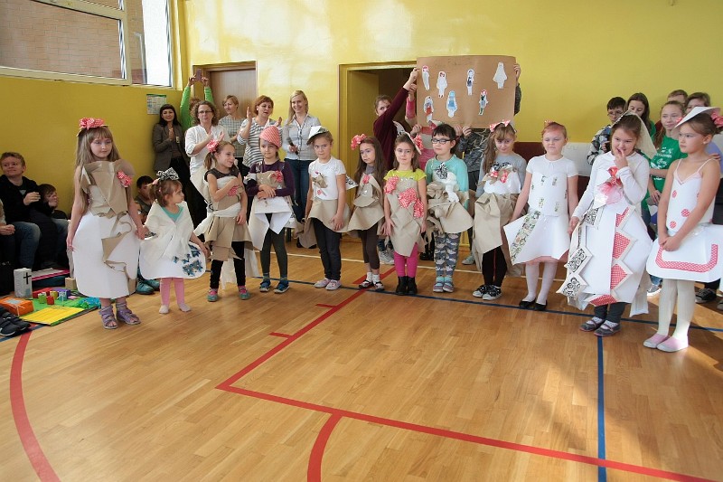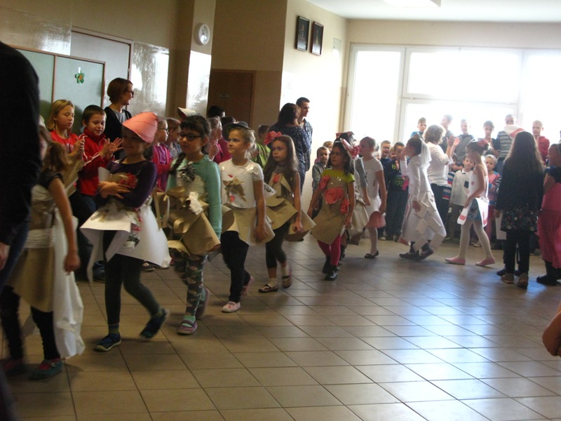 Akcję "Sprzątanie Świata" w naszej szkole zakończył pokaz mody ekologicznej. Jak coś ładnego zrobić z czegoś niepotrzebnego, wymyśliły nasze małe stylistki oraz panie ze świetlicy szkolnej. Stroje zostały wykonane z resztek szarego papieru, bibuły, papierowych tacek i innych surowców wtórnych. Modelki z klas I-III dzielnie znosiły przygotowania w szkolnej garderobie, by móc pięknie zaprezentować się na wybiegu. Pokaz oglądali z wielkim zapałem uczniowie klas starszych oraz rówieśnicy modelek. Wszystkim występ bardzo się podobał, co zostało potwierdzone gromkimi brawami.