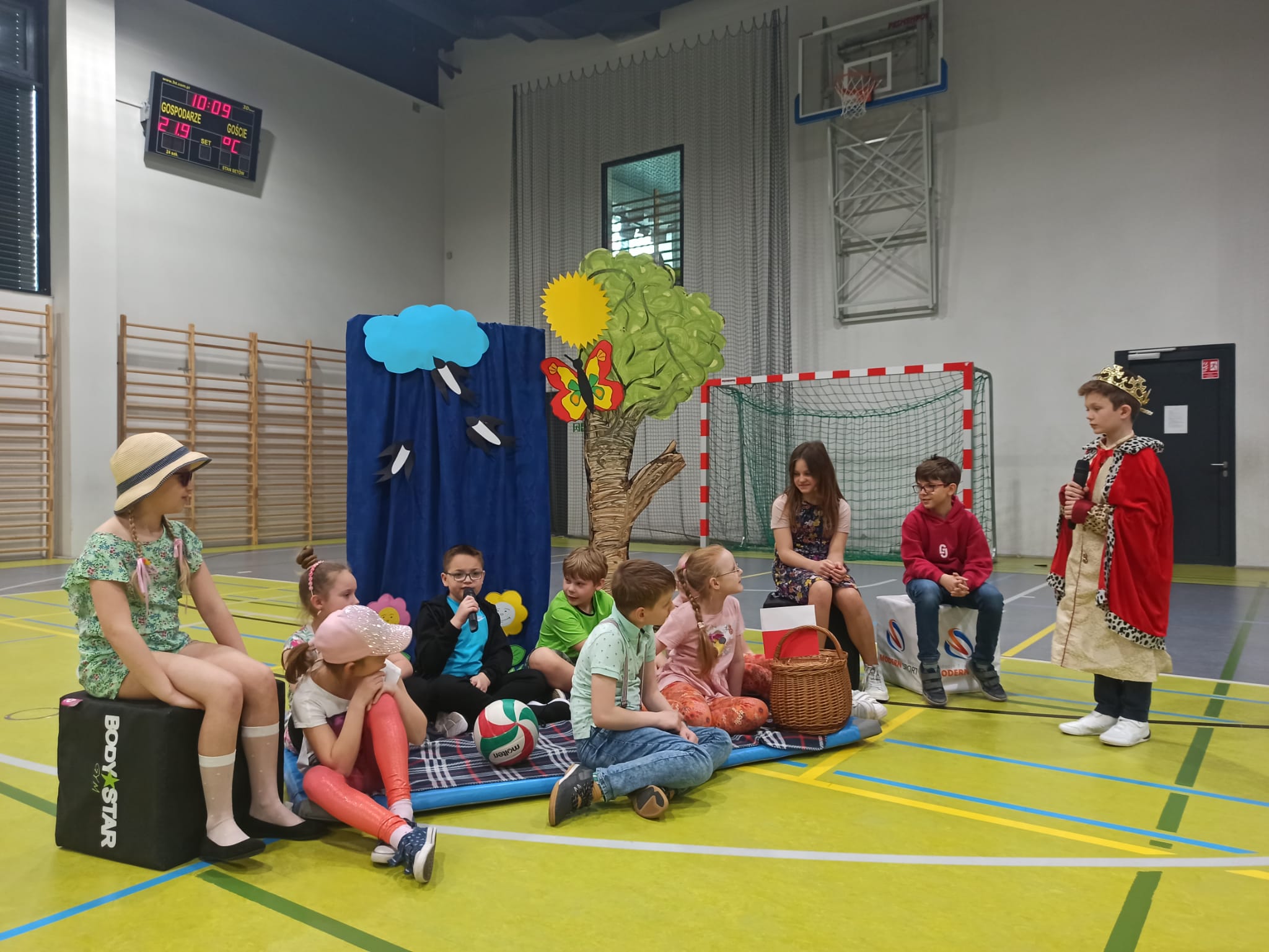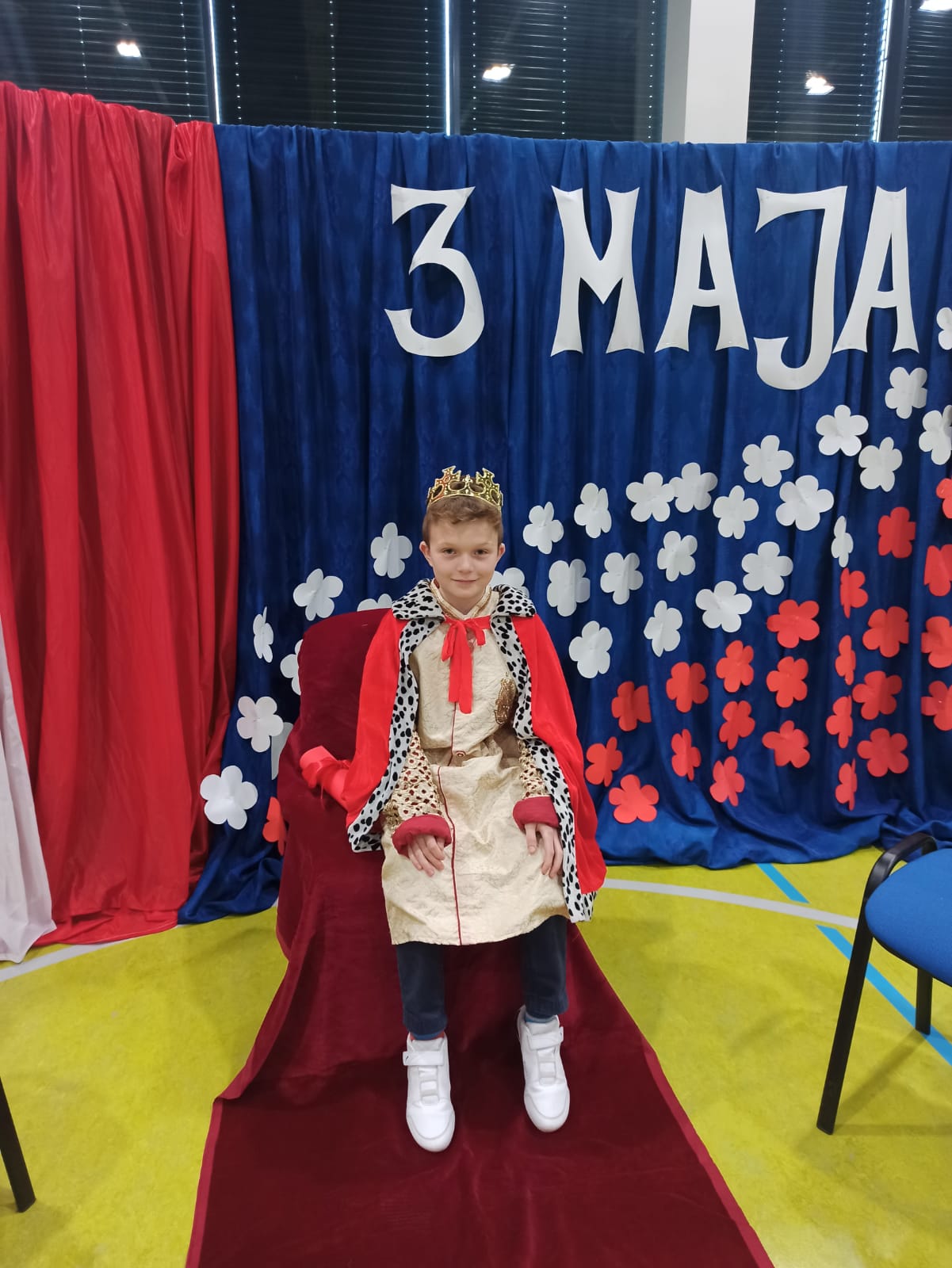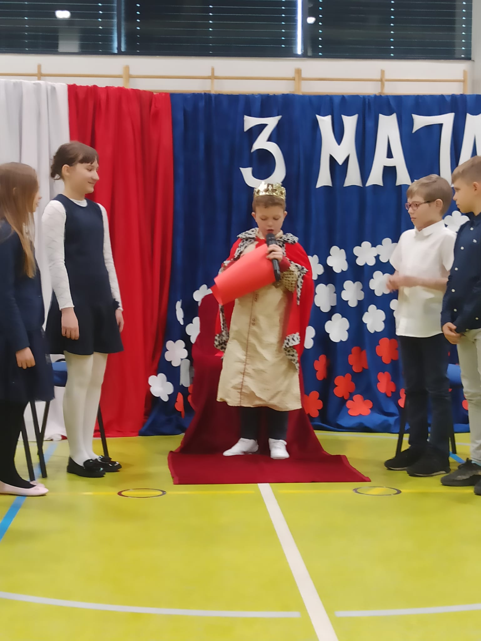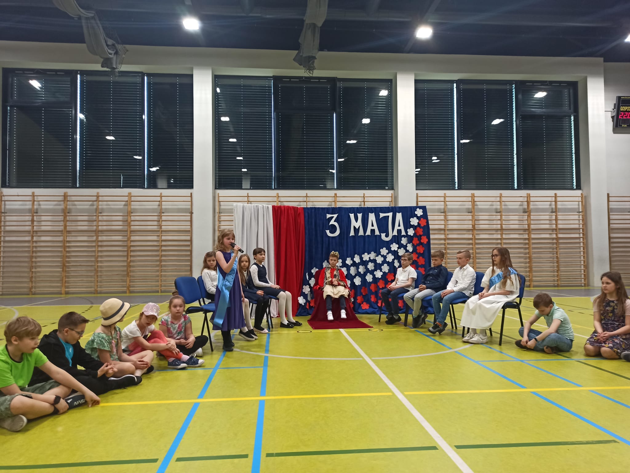 Inscenizację przenoszącą nas w świat króla Stanisława Augusta Poniatowskiego przygotowali uczniowie klas 2a, 3a, 3b i 3c. Towarzyszył im w pięknym wystąpieniu chór szkolny Koralinki oraz pozostałe klasy młodsze śpiewające piosenkę „Witaj majowa jutrzenko”. Wszystkim gratulujemy pięknego wystąpienia.