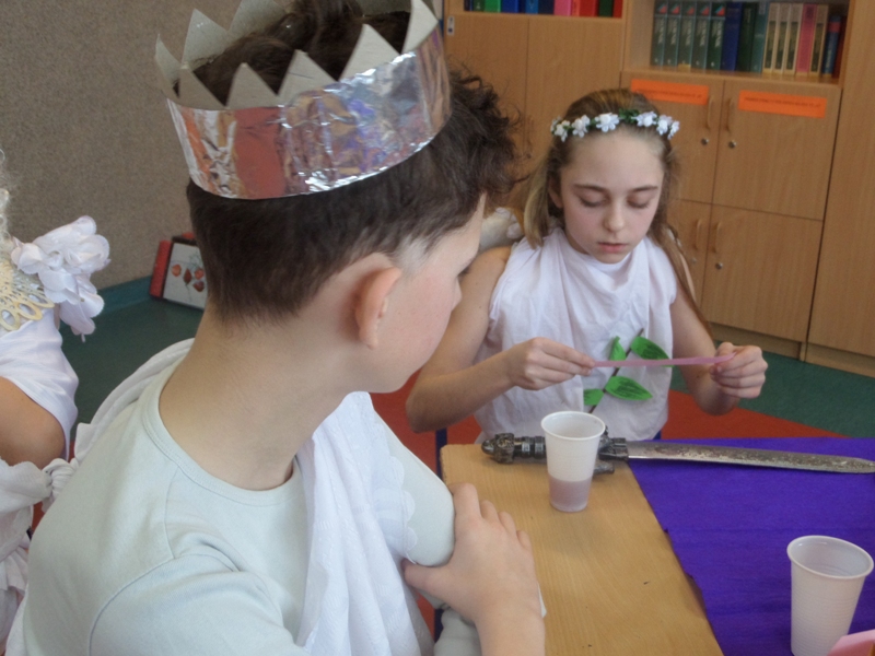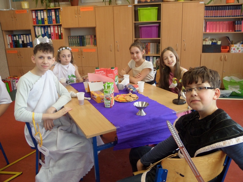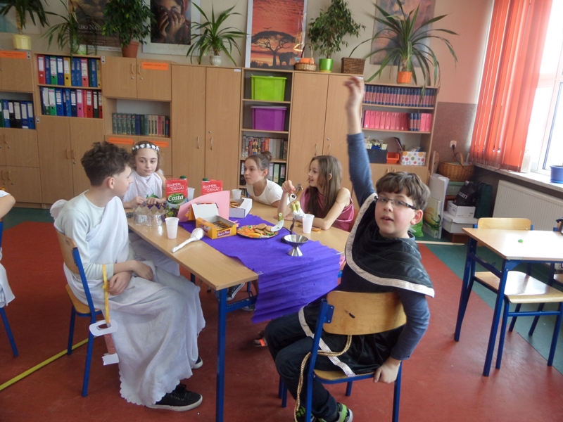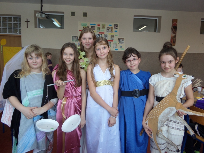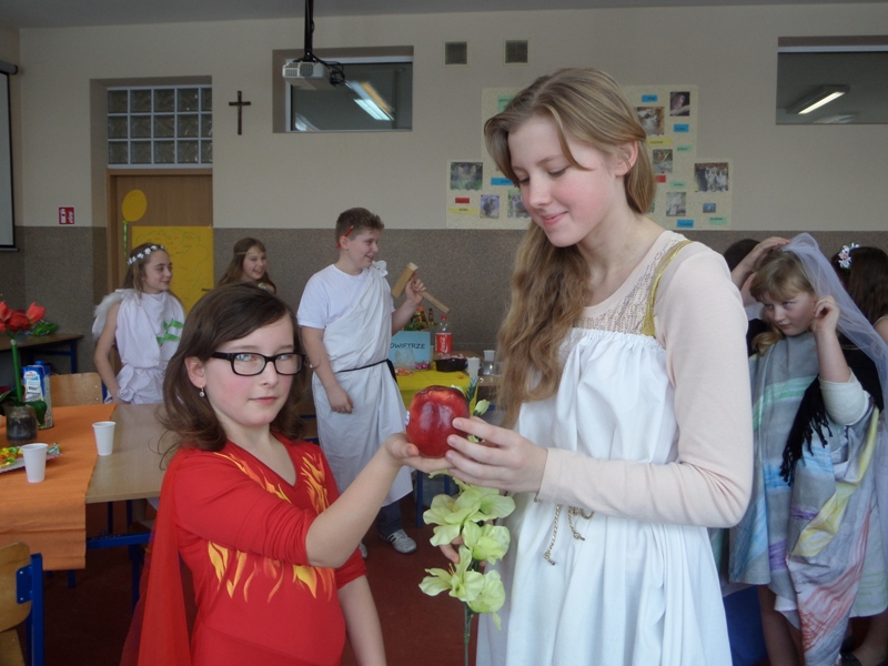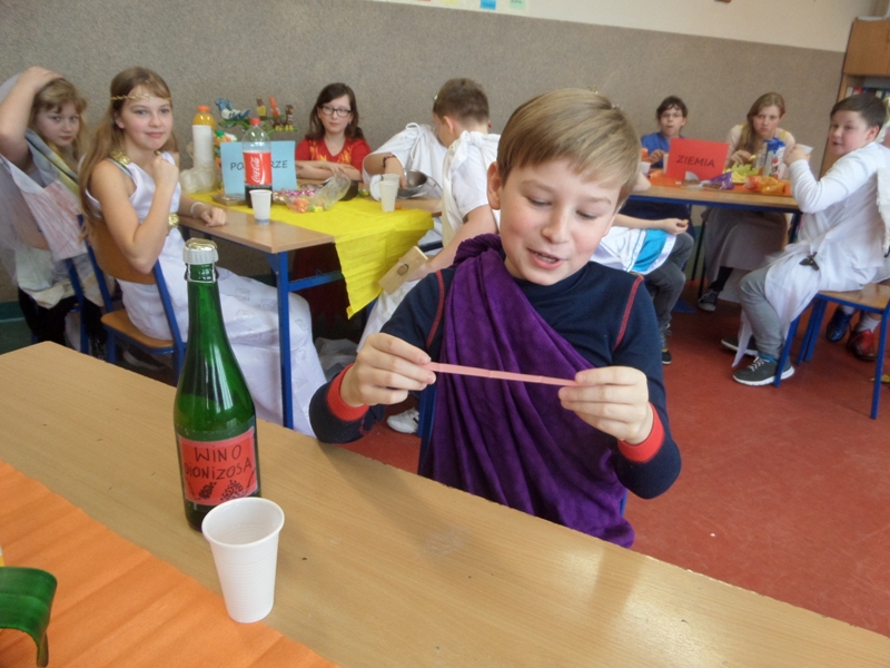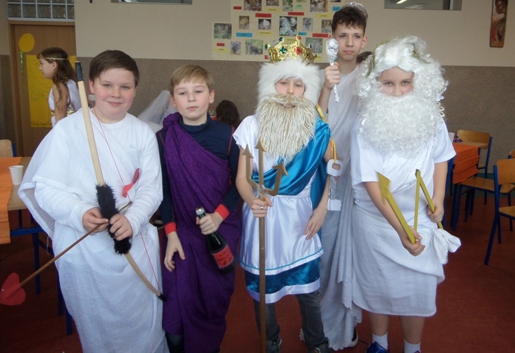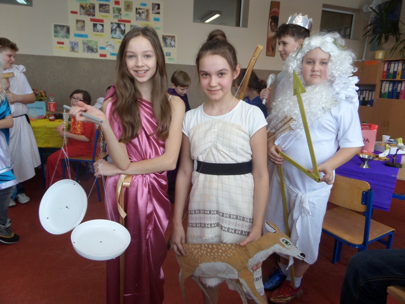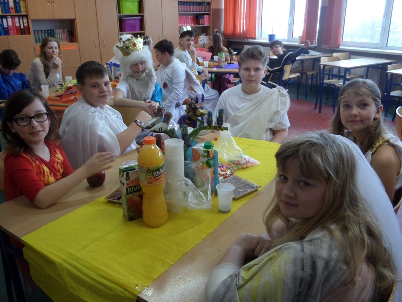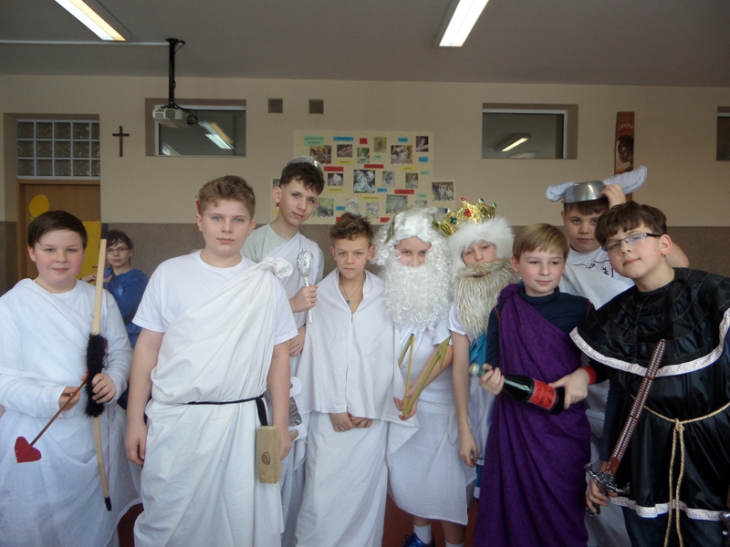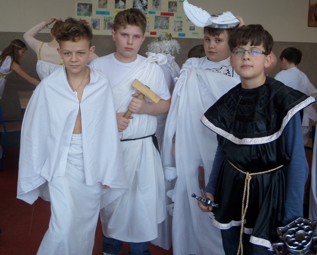 Lekcje mitologiczne s± jednymi z ulubionych zajęć pi±toklasistów. Bogowie jak ludzie, wyborowi herosi i przedziwne potwory inspiruj± uczniowsk± wyobraĽnię i zachęcaj± do wędrówek w stronę starożytnej Grecji. Zwieńczeniem mitologicznego cyklu lekcji były w tym roku szkolnym uczty bogów olimpijskich, pokazy mody greckiej oraz klasowe konkursy wiedzy o mitach.