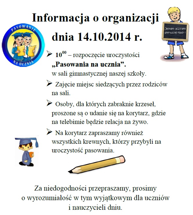 dobiegły końca przygotowania do wielkiego wydarzenia - ¶lubowania naszych pierwszoklasistów. Zapraszamy do zobaczenia fotorelacji z dzisiejszych "zmagań z materi±";) Prosimy również o zapoznanie się z informacj± organizacyjn±. Mamy nadzieję, że jutrzejszy dzień będzie przyjemny i radosny dla wszystkich dzieci, rodziców i nauczycieli.