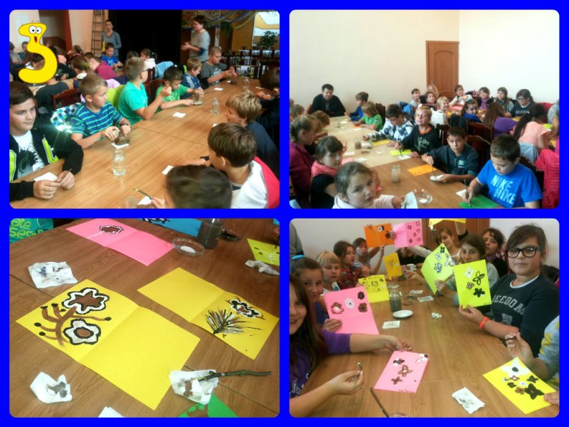 3. PóĽniej sami wzięli¶my udział w warsztatach; oklepali¶my kamieniami patyczki -zrobili¶my sobie „miotełki-pędzelki” do malowania i... do dzieła!