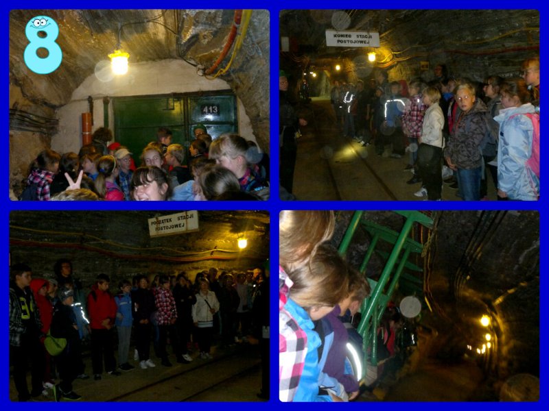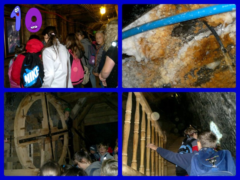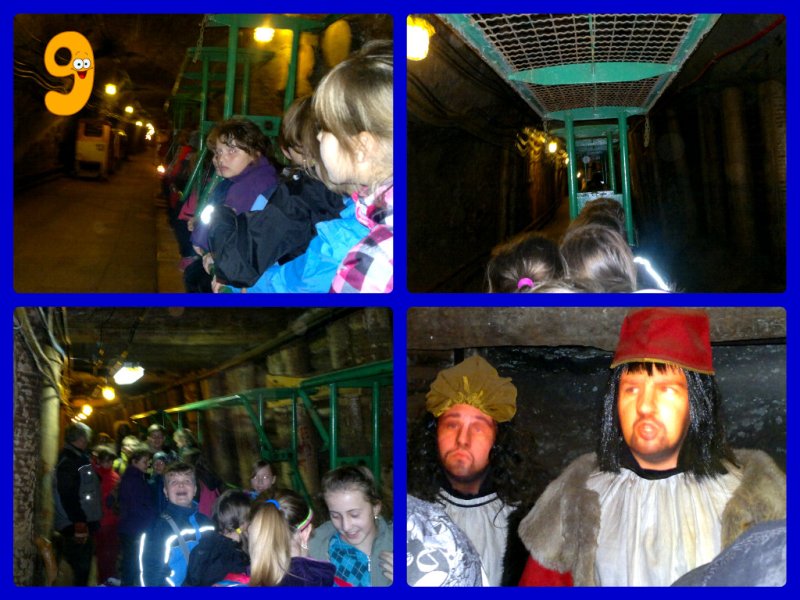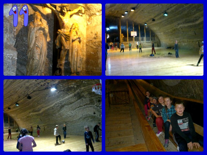 Cz. II - Bochnia. Foto. 8 -11: Jeste¶my w Bochni! Wehikuł czasu przenosi nas do roku 1248 - na 212 metrach pod ziemi± pierwszy wła¶ciciel kopalni Bolesław Wstydliwy opowiada nam o jej pocz±tkach. Wykucie korytarza o długo¶ci 10 m. zajmowało wtedy górnikom 2 tygodnie... Dowiadujemy się również, że najcięższ± i najbardziej niebezpieczn± prac± w kopalni zajmowali się wypalacze metanu -podchodzili do ognisk gazu z pochodniami... i... następował wybuch. Na zdjęciach widoczne s± m.in. korytarze kopalniane, sprzęty łopaty, narzędzia. Na kolejnej fotografii kaplica ¶w. Kingi - jedyny ko¶ciół, przez którego ¶rodek przebiegaj± tory kolejowe! A na samym końcu - jakie atrakcje! Zjeżdżalnia, boiska - no to gramy w piłkę! Wszystko to ci±gle w kopalni Bochnia w komorze Warzyn! Jak tu ¶wietnie! TO BYŁA WSPANIAŁA WYCIECZKA!