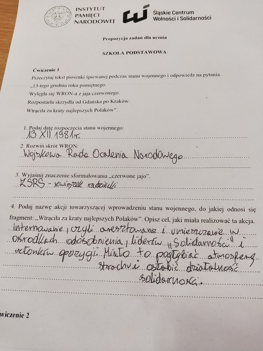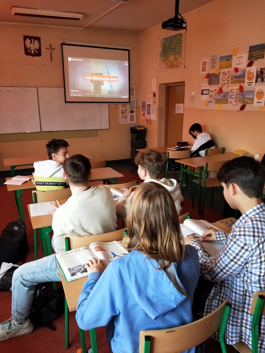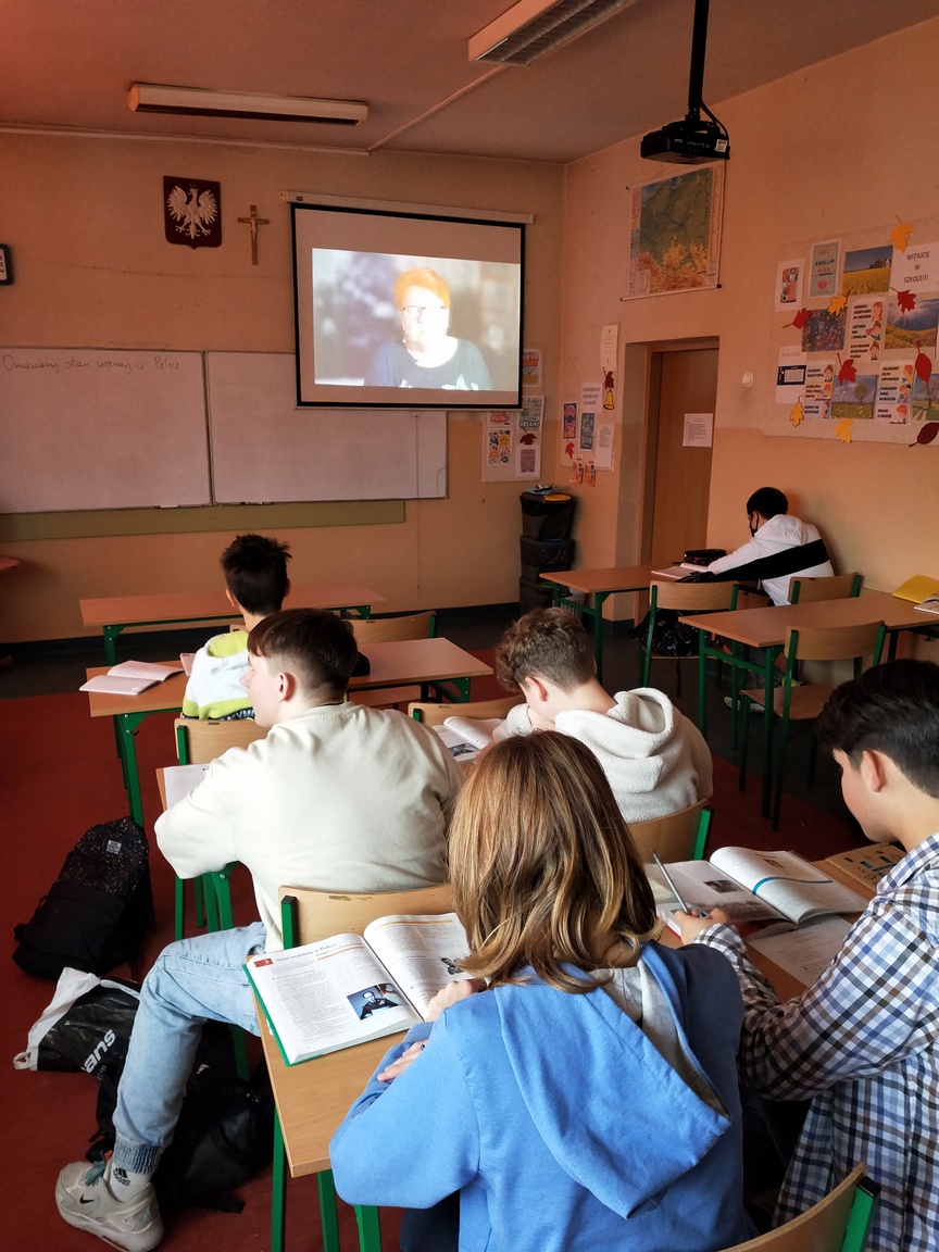 W ramach projektu: „Gdy gaśnie pamięć ludzka, dalej mówią kamienie” w klasach siódmych oraz ósmych naszej szkoły odbył się cykl lekcji historii związanych z czasami stanu wojennego w Polsce. Uczniowie oglądali fragmenty filmów dokumentalnych oraz pracowali na kartach pracy przygotowanych przez Instytut Pamięci Narodowej w Katowicach. W ramach zajęć miała miejsce projekcja filmu: „Nie zabierajcie Mamy” - historii działaczek Solidarności, kobiet aresztowanych i internowanych w okresie stanu wojennego w Polsce.