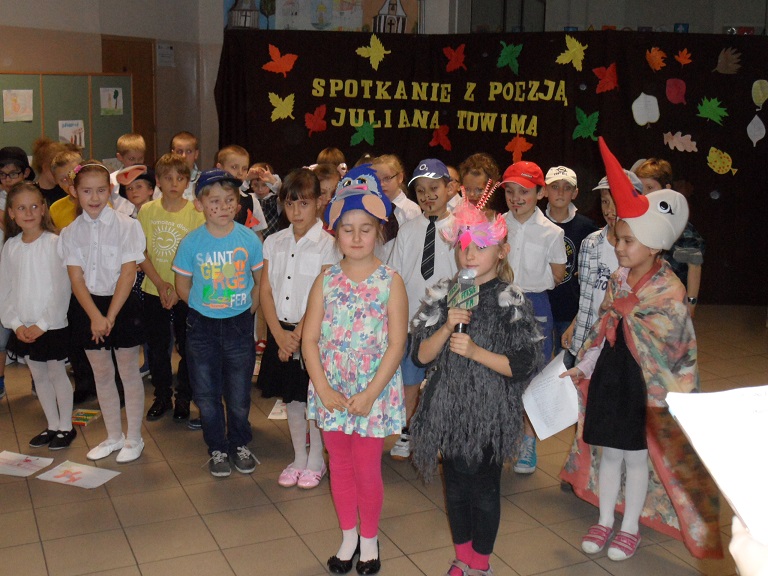 Wieczorkiem poetyckim pożegnali¶my jesień w naszej szkole. Uczniowie klasy II b i II d pod kierunkiem pań: Beaty Balickiej i Małgorzaty Syrek przygotowali dla rodziców spotkanie z poezj± Juliana Tuwima. Mali arty¶ci recytowali wybrane wiersze poety, takie jak: "Lokomotywa", "Rzepka", "Bambo", "SpóĽniony słowik", "Skakanka", "Cuda i dziwy" i wiele innych. ¦piewali jesienne piosenki, którym towarzyszyły pl±sy. Każde dziecko wcieliło się w rolę bohatera, o którym była mowa w wierszu. Pomysłowo¶ć charakteryzacji i barwne rysunki dzieci dodały uroku całemu występowi. Wieczór poetycki zakończył duży aplauz ze strony zgromadzonej publiczno¶ci.