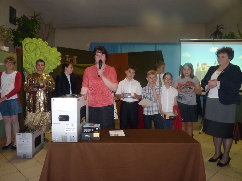 7 czerwca podsumowali¶my projekt "Wiem, umiem więcej...". Nagrody otrzymali uczniowie klas 2-6, którzy osi±gnęli najwyższe wyniki w konkursie szybkiego czytania (pod uwagę brane było zarówno tempo jak i poziom zrozumienia tekstu). Zwycięzcy otrzymali wspaniałe nagrody - tablety, drukarki i aparaty fotograficzne. Nagrody wręczyła p. Mirosława Strojny oraz p. Mariola Orlik z UM Imielin.