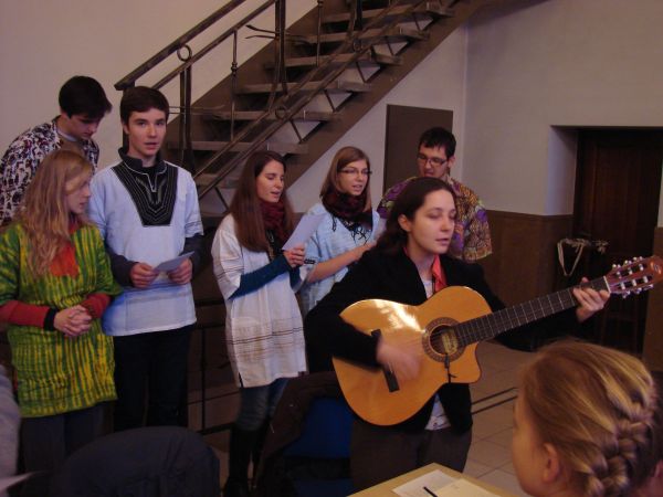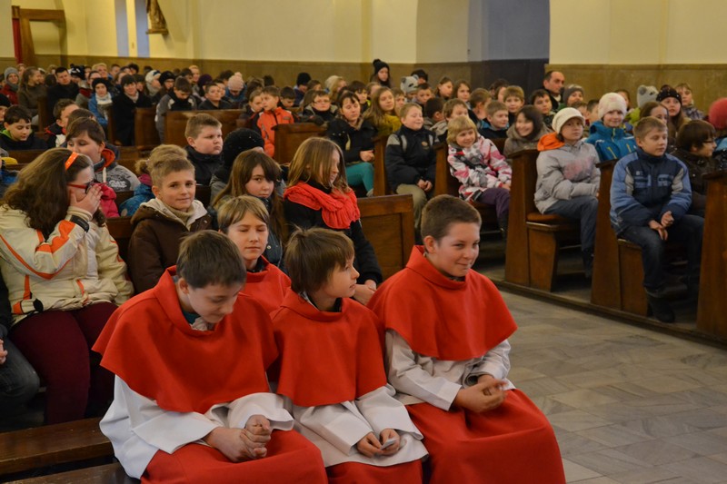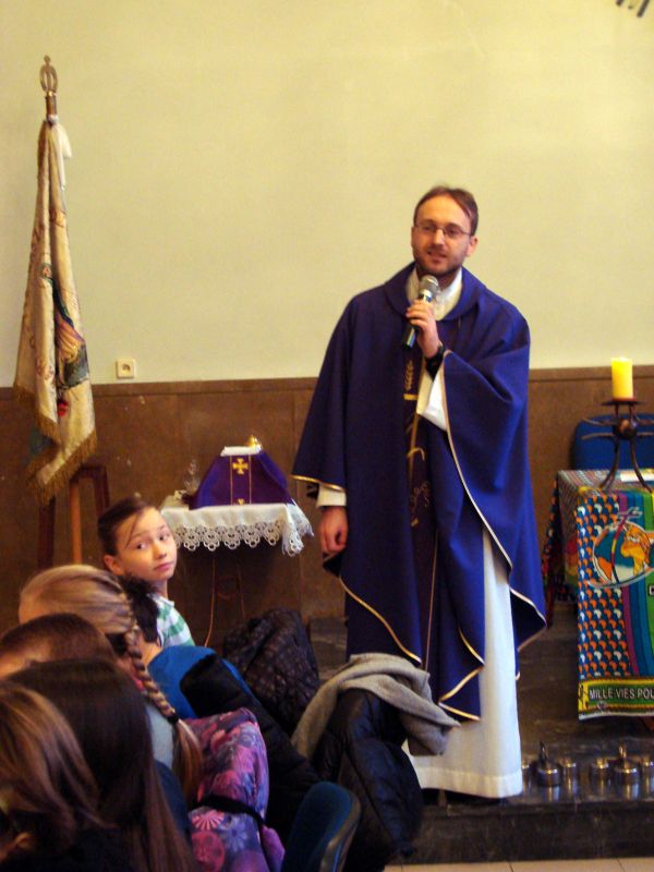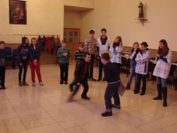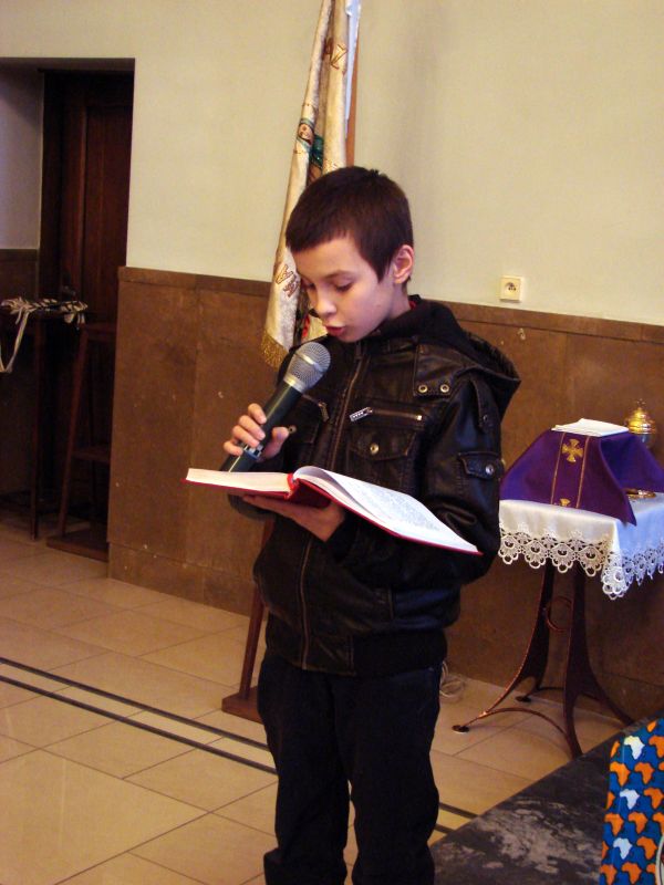 O godz. 10.00 rozpoczęła się Msza ¶w. O. Maciej przypomniał nam o potrzebie modlitwy za misje i misjonarzy, a także serdecznie podziękował nam w imieniu tych wszystkich, których wspieramy w ich posłudze misyjnej (nie wszyscy mogli przyjechać do Polski!). Następnie wspólnie bawili¶my się m .in. tańcz±c, ¶piewaj±c i przeci±gaj±c linę. Potem podzielili¶my się na grupy: jedna ogl±dała ciekaw± prezentację zdjęć i filmów z misjach w Ghanie, a druga robiła ¶wi±teczne, wielkanocne kartki z życzeniami, które po¶lemy do naszych misjonarzy. Spotkanie zakończyło się ok. 13.00 wspóln± modlitw± różańcow± za misje.