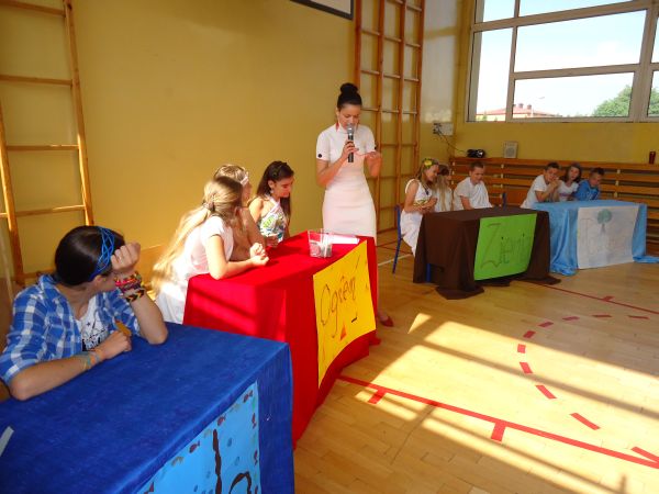 Po pokazie mody nast±pił konkurs wiedzy o mitach, w którym aktywny udział brali nie tylko reprezentanci klas, ale wszyscy zgromadzeni na sali uczniowie. Co to jest róg obfito¶ci i jak powstał?, W jaki sposób Grecy tłumaczyli wybuchy wulkanu Etna na Sycylii?, Kto jest twórc± Odysei?- z tymi m.in. pytaniami najlepiej poradzili sobie uczniowie klasy V „b”, którzy zajęli I miejsce. Miejsce II wywalczyli reprezentanci żywiołu powietrza – kl. V „d”, III - wody – kl. V „a”. Tuż za podium znalazła się V „c”.