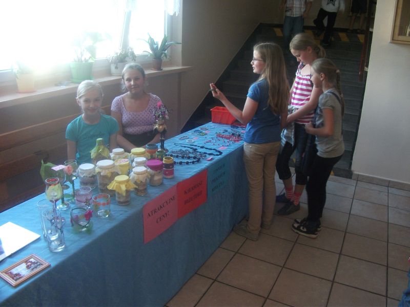 Dla zwiedzaj±cych przygotowano również kawiarnię i cukiernię. Jednym z elementów zabawy był bowiem kiermasz ciast, które przygotowali Rodzice oraz ufundowali sponsorzy szkoły. Za niewielk± kwotę zakupić można było nieco słodko¶ci i doskonał± kawę… A potem już tylko zasi±¶ć w szkolnej ławie i powspominać niegdysiejsze czasy. Przed wyj¶ciem obowi±zkowo zatrzymywano się przy stoiskach z kartkami, obrazkami, biżuteri± oraz innymi drobiazgami wykonanymi przez uczniów, rodziców i nauczycieli:. Milusińscy za¶ obowi±zkowo zaliczali malowanie twarzy i stół ze specjałami firmy Danone.