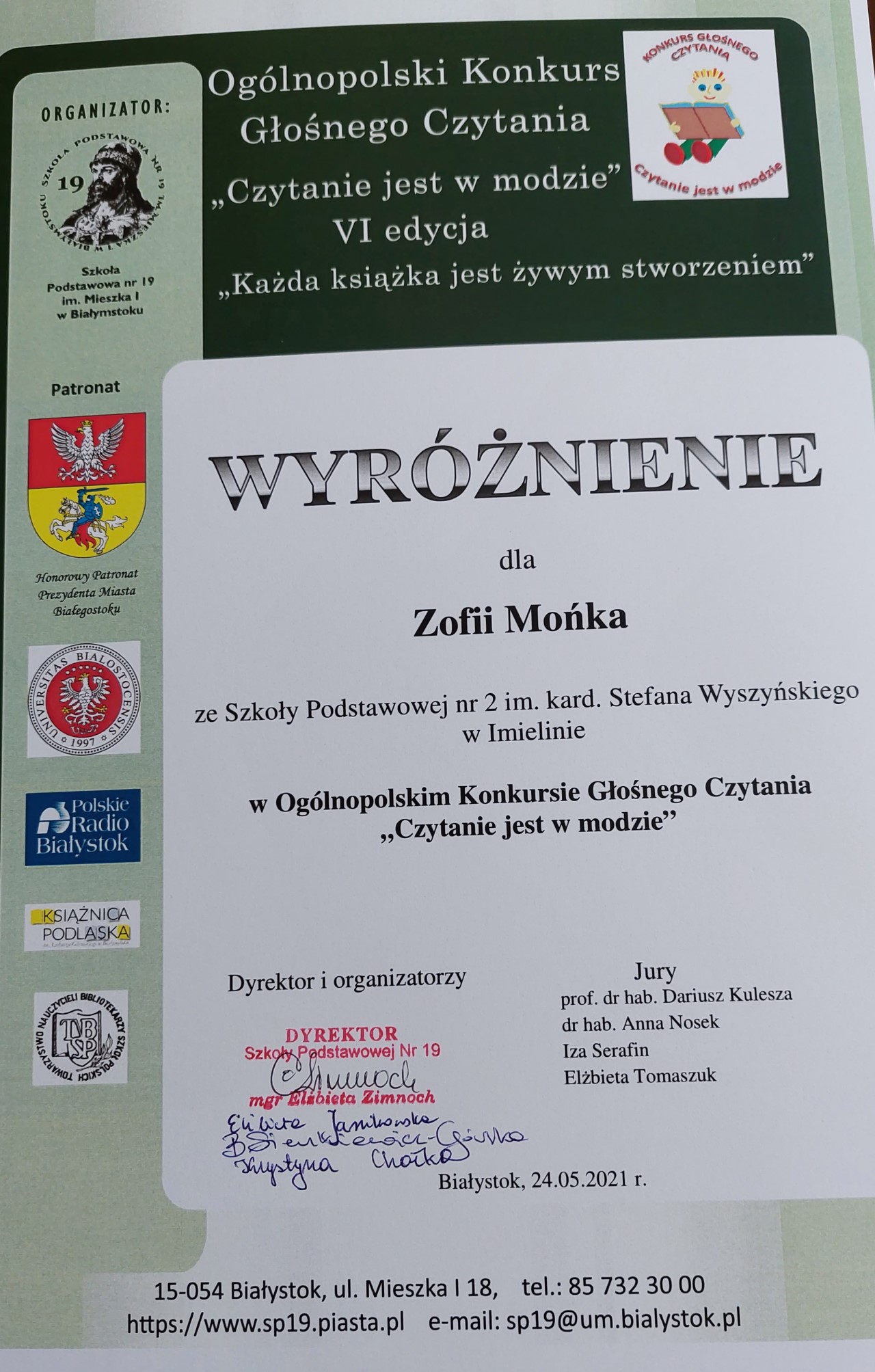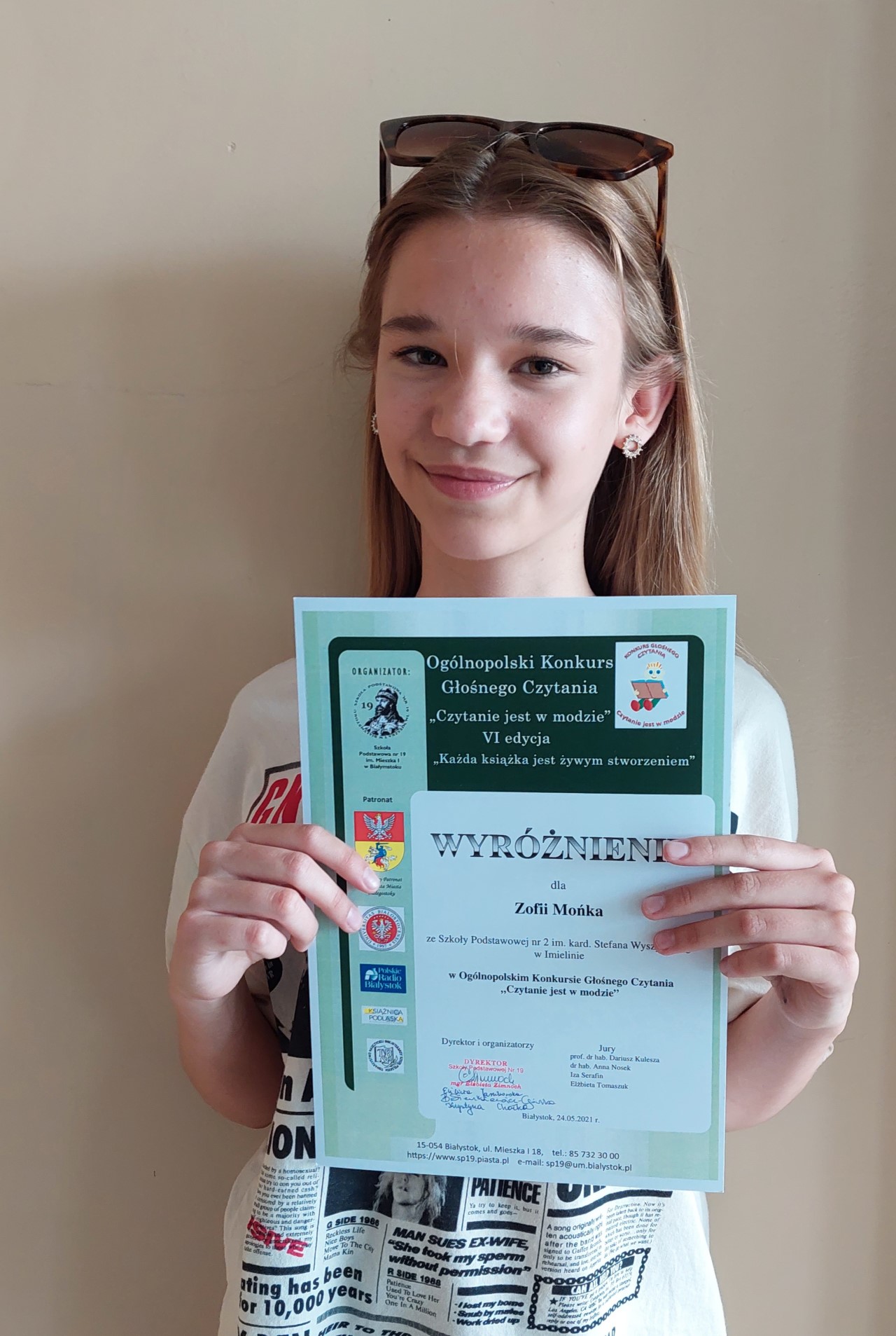 Uczennica klasy 7c - Zofia Mońka - została wyróżniona w Ogólnopolskiej edycji Konkursu Głośnego Czytania "Czytanie jest w modzie" pod hasłem "Każda książka jest żywym stworzeniem".