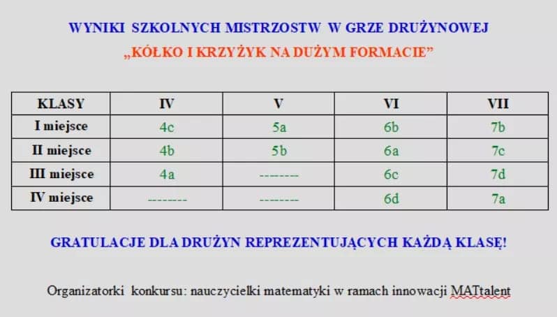 W ramach innowacji matematycznej MATtalent uczniowie klas 4-7 uczestniczyli w Mistrzostwach szkolnych w grze „Kółko i krzyżyk na dużym formacie”. Zawody stały się doskonałą sposobnością do integracji całej klasy po zdalnym nauczaniu, ponieważ każdy w klasie w ramach eliminacji musiał zagrać z każdym uczniem. Wspaniałe było to, że uczniowie na co dzień zmagający się z matematyką , podczas gry okazali się doskonałymi strategami. Niektórzy odkryli talenty, o które do tej pory wcale się nie podejrzewali i z wielką radością ogrywali innych kolegów i koleżanki. Ta gra nie tylko integruje, ale bardzo relaksuje i daje dużo pozytywnych emocji. Część uczniów natomiast zaczęła bardziej obiektywnie oceniać swoje mocne strony i nauczyła się nigdy nie lekceważyć przeciwnika. Przedstawiamy wyniki zmagań. Fotorelacja pokazuje ogromne zaangażowanie każdej klasy w grę- zapraszamy do oglądania.