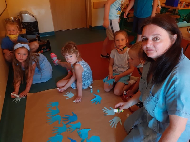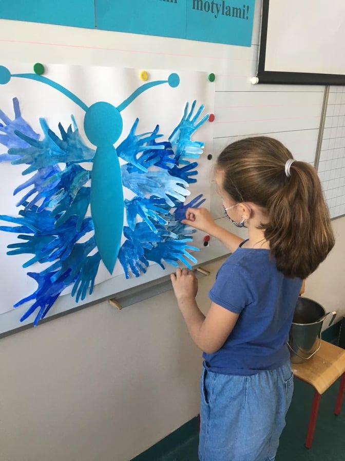 2. Wykonać pracę plastyczną, np. odbić niebieskie ręce w kształcie motyla lub serca albo wykonać dowolną aktywność wg własnej inwencji twórczej, np. „taniec motyla”.