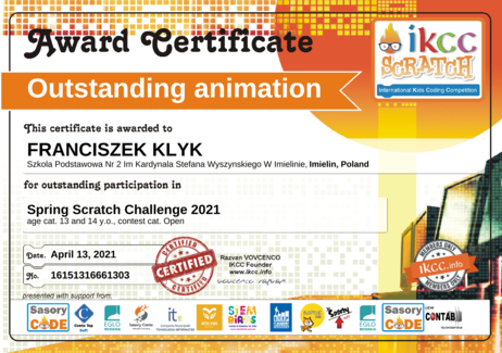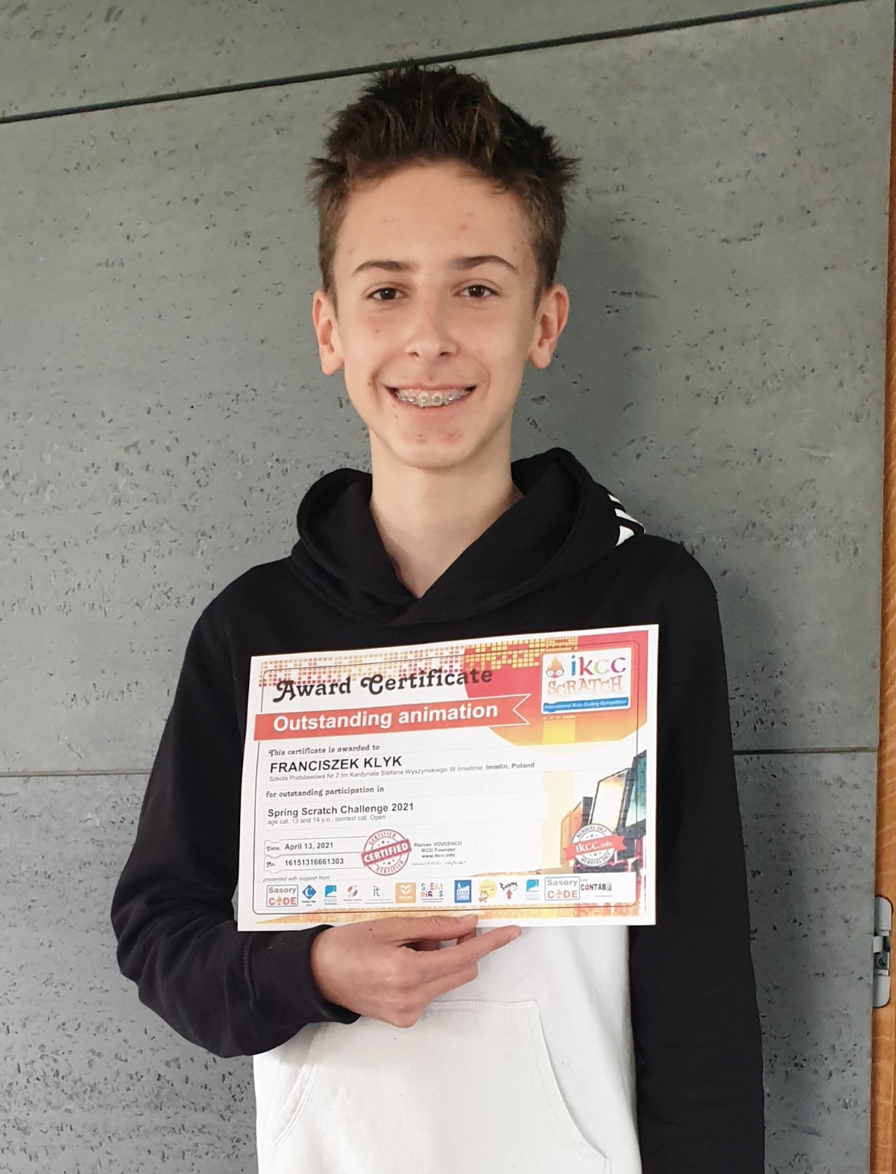 Uczeń klasy 7 c Franciszek Kłyk uzyskał IV miejsce i nagrodę za jedną z najlepszych animacji.