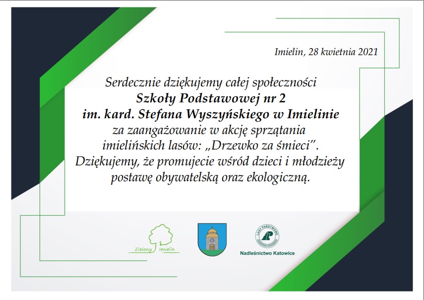 pozwalam sobie złożyć na Pani ręce podziękowanie za udział w akcji sprzątania imielińskich lasów: "Drzewko za śmieci". Z dumą informuję, że w akcję zaangażowało się ponad 100 rodzin, wspólnymi siłami zebraliśmy ponad 220 worków śmieci. Stało się tak, między innymi dzięki Państwa pomocy w rozpropagowaniu akcji wśród uczniów oraz rodziców, a także osobistemu udziałowi kilku nauczycieli z ich rodzinami. Bardzo dziękujemy!