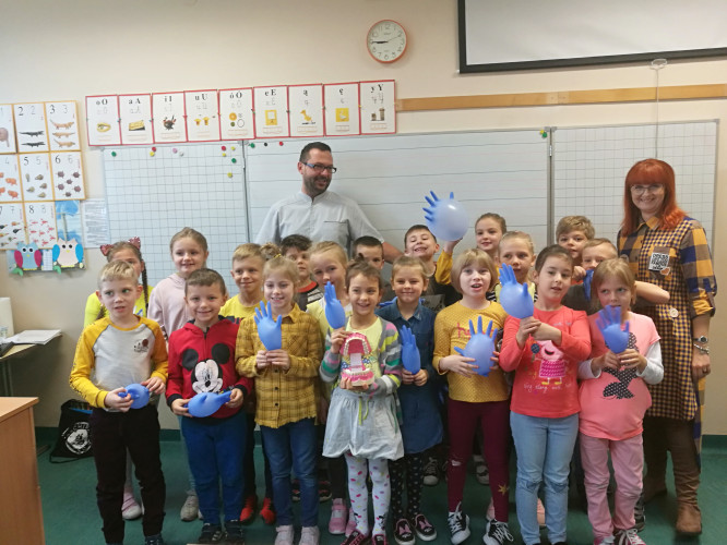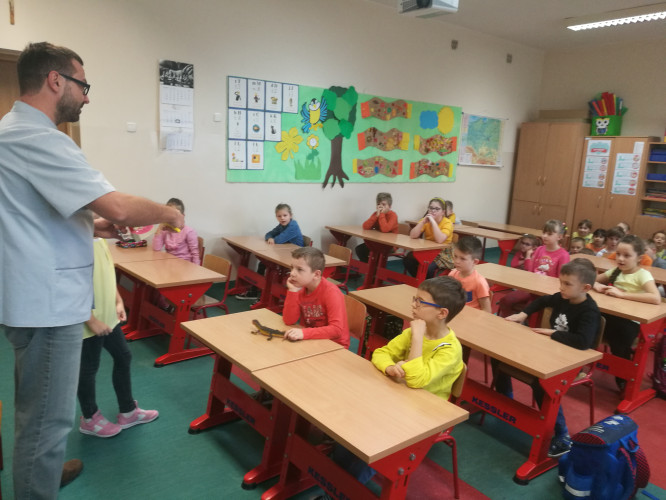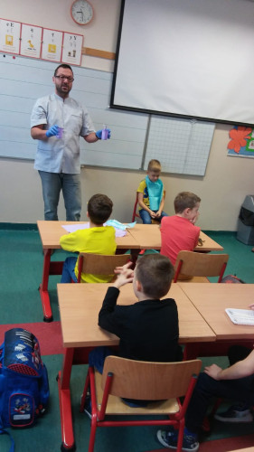 W ramach doradztwa zawodowego, naszych pierwszoklasistów odwiedził gość specjalny – lekarz, chirurg stomatolog, pan Jarosław Kokoszczyk - tata jednego z naszych uczniów. Dzieci dowiedziały się jak wygląda praca stomatologa, jak dbać o jamę ustną, co jeść, żeby mieć zdrowe zęby, jak je prawidłowo myć, bo to też jest sztuka :-). Mogły również zobaczyć jakich narzędzi używa stomatolog w swojej pracy. To była bardzo ciekawa i cenna lekcja.