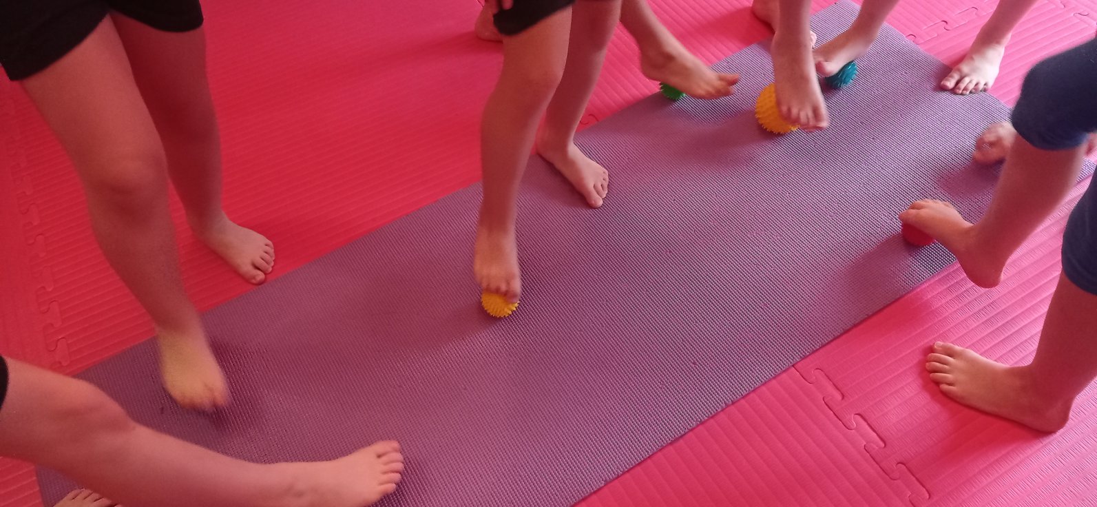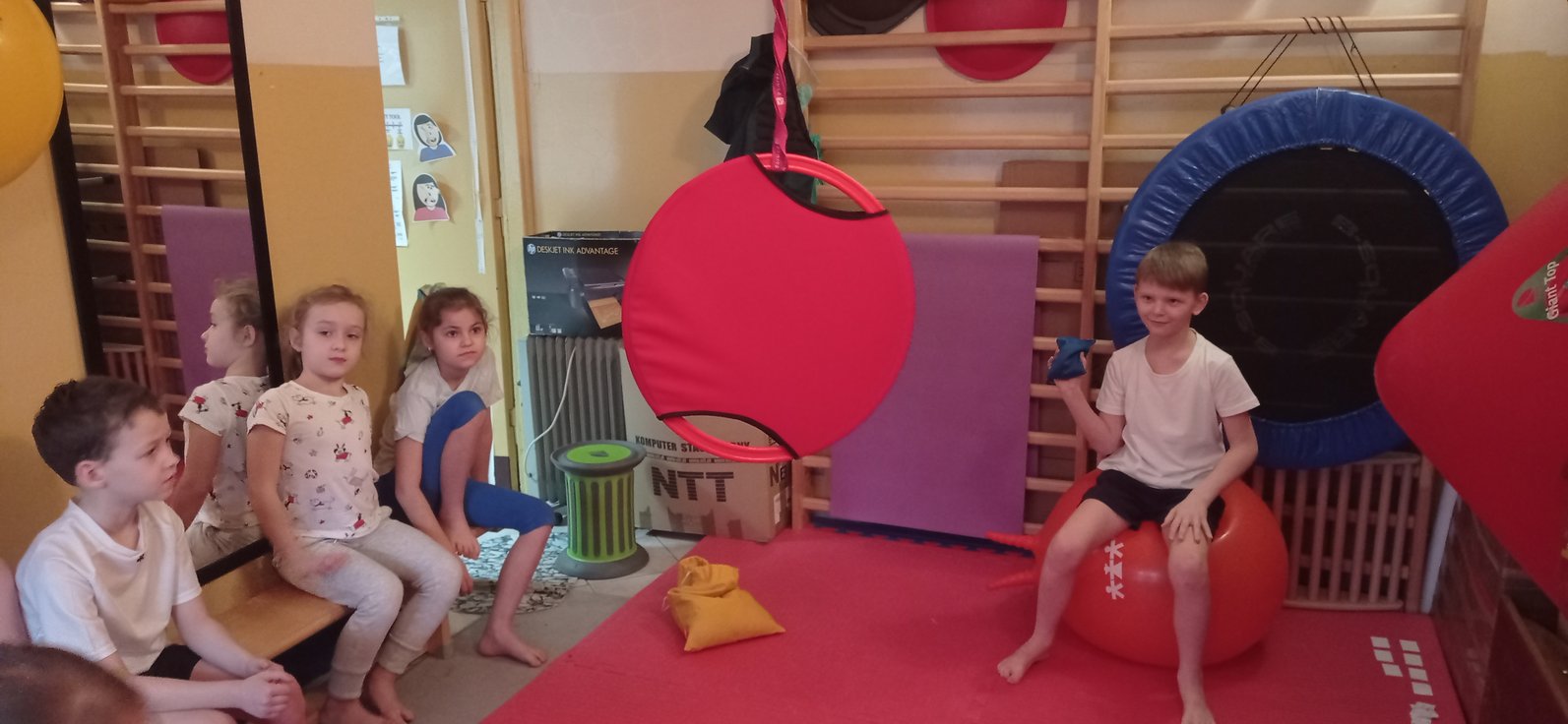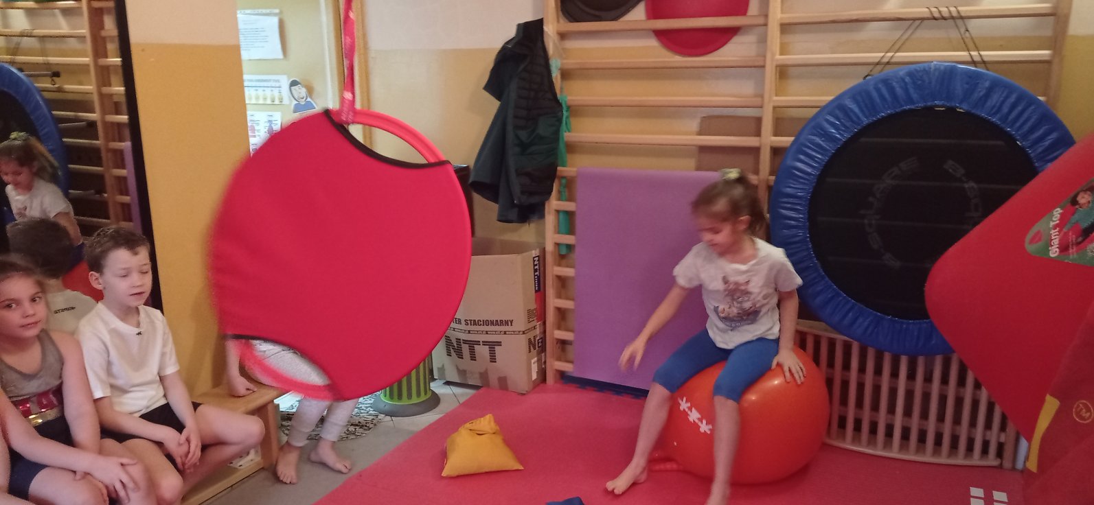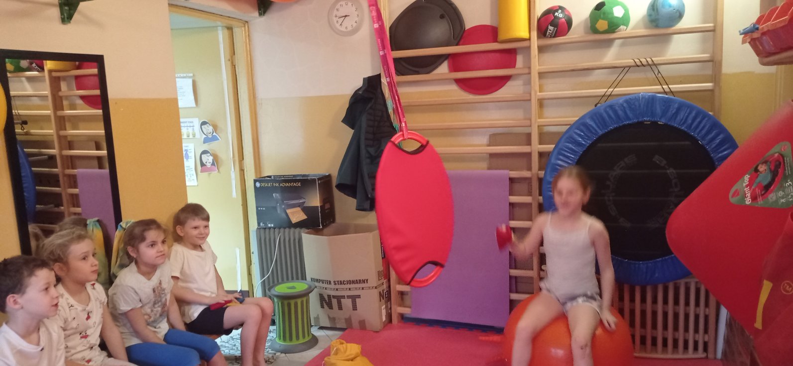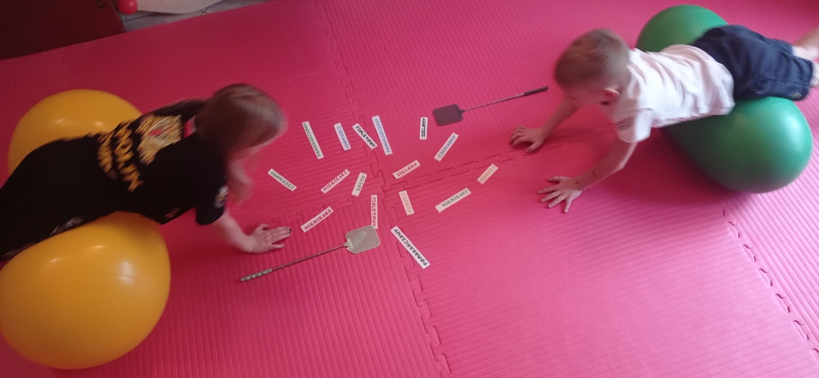 Na gimnastyce korekcyjnej, połączyliśmy wszystkie składowe, ćwicząc koordynację wzrokowo-ruchową, utrzymanie fiksacji na przedmiocie i podążanie za nim wzrokiem (co pełni niezwykle istotną rolę w procesie uczenia się - czytania i pisania).