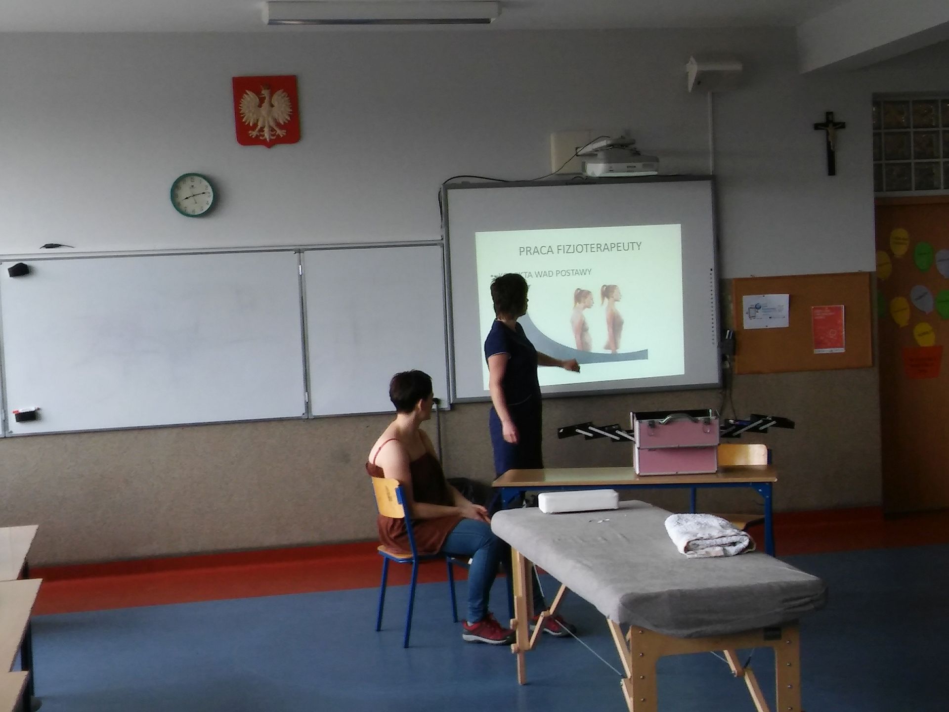 Pani Iwona, właścicielka gabinetu kosmetyczno – rehabilitacyjnego „Iwonella” w Imielinie i nauczyciel akademicki w Śląskiej Wyższej Szkole Medycznej w Katowicach, przedstawiła piątoklasistom informacje o pracy w zawodzie fizjoterapeuty. Podzieliła się swoimi doświadczeniami w tym zawodzie.