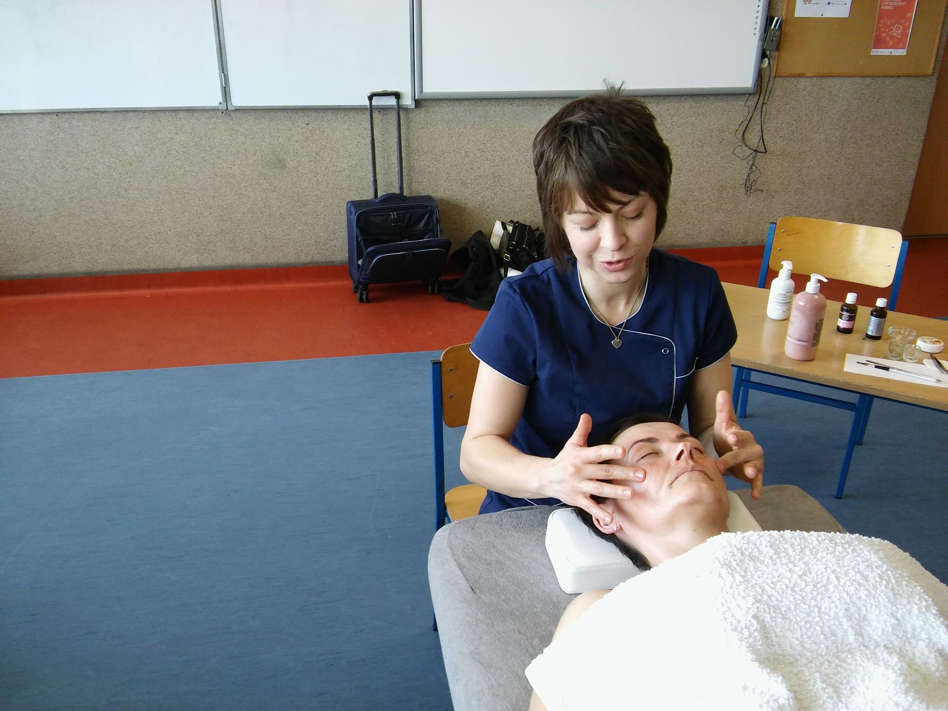 Ponadto Pani Iwona zaprezentowała dzieciom przykład zabiegów pielęgnacyjnych, które wykonała na modelce, pani Jolancie Zawadzkiej. Henna, regulacja brwi, masaż relaksacyjny twarzy, szyi i dekoltu – pozwoliły dzieciom na bezpośrednią obserwację pracy kosmetyczki.
