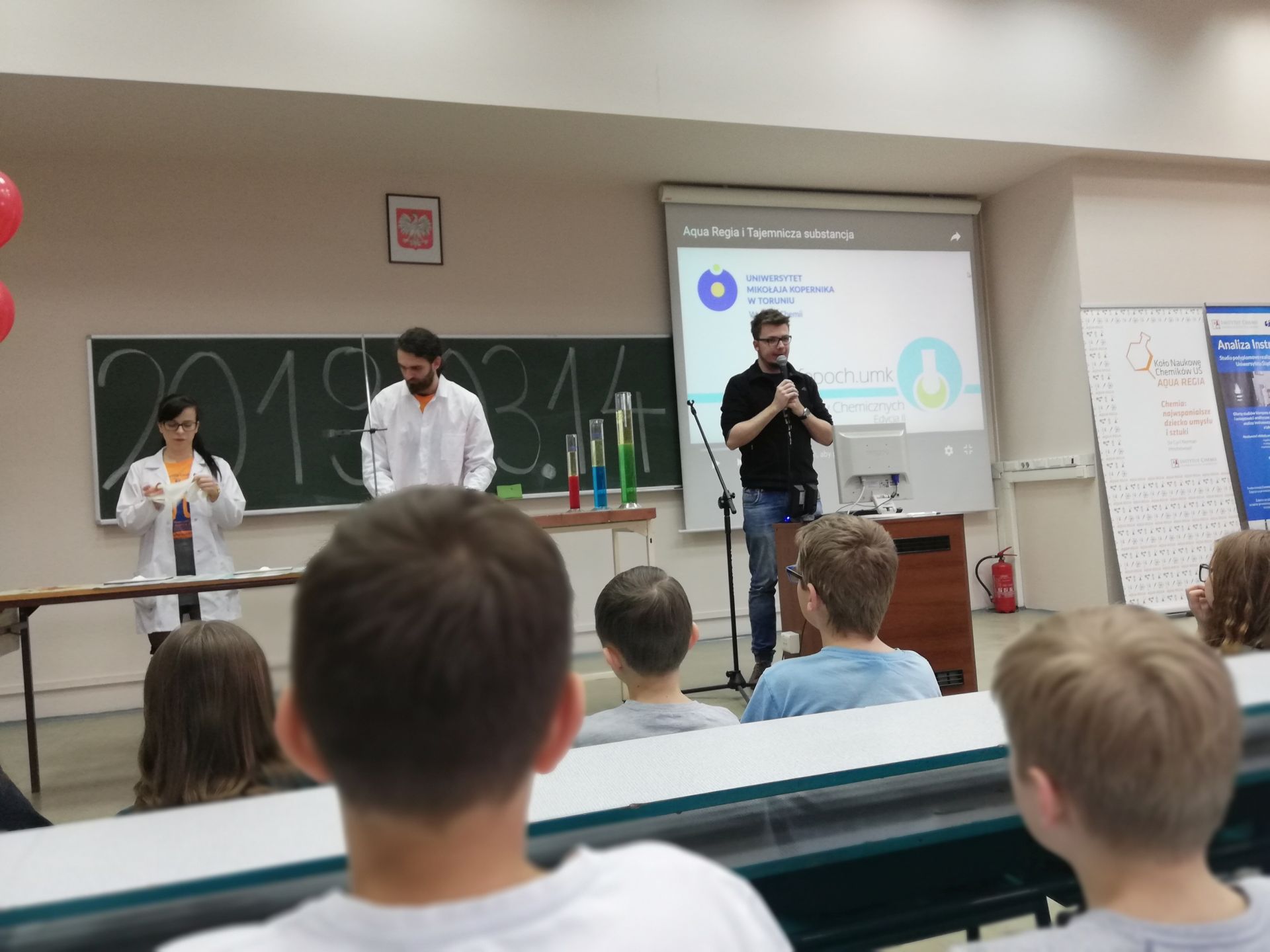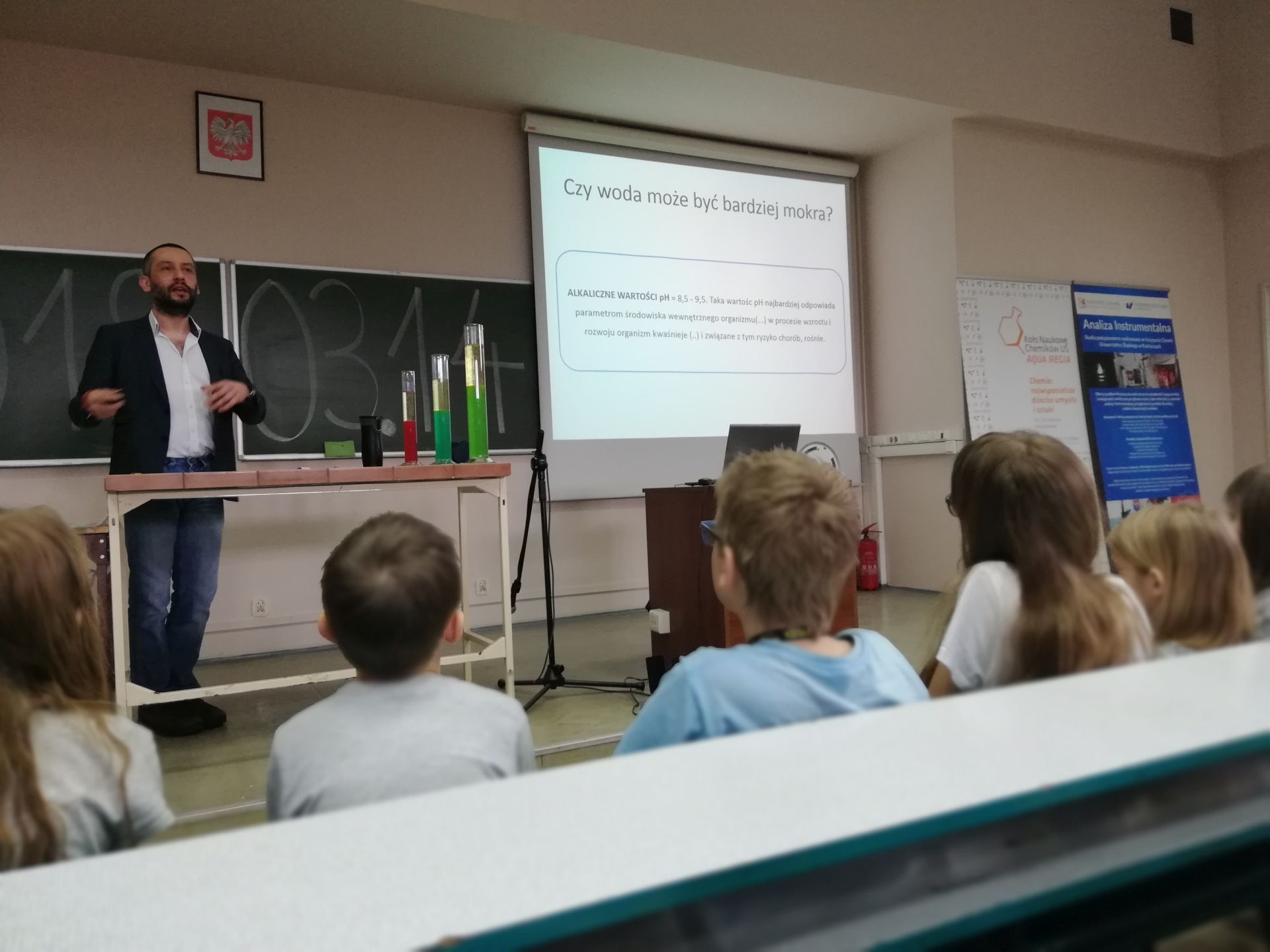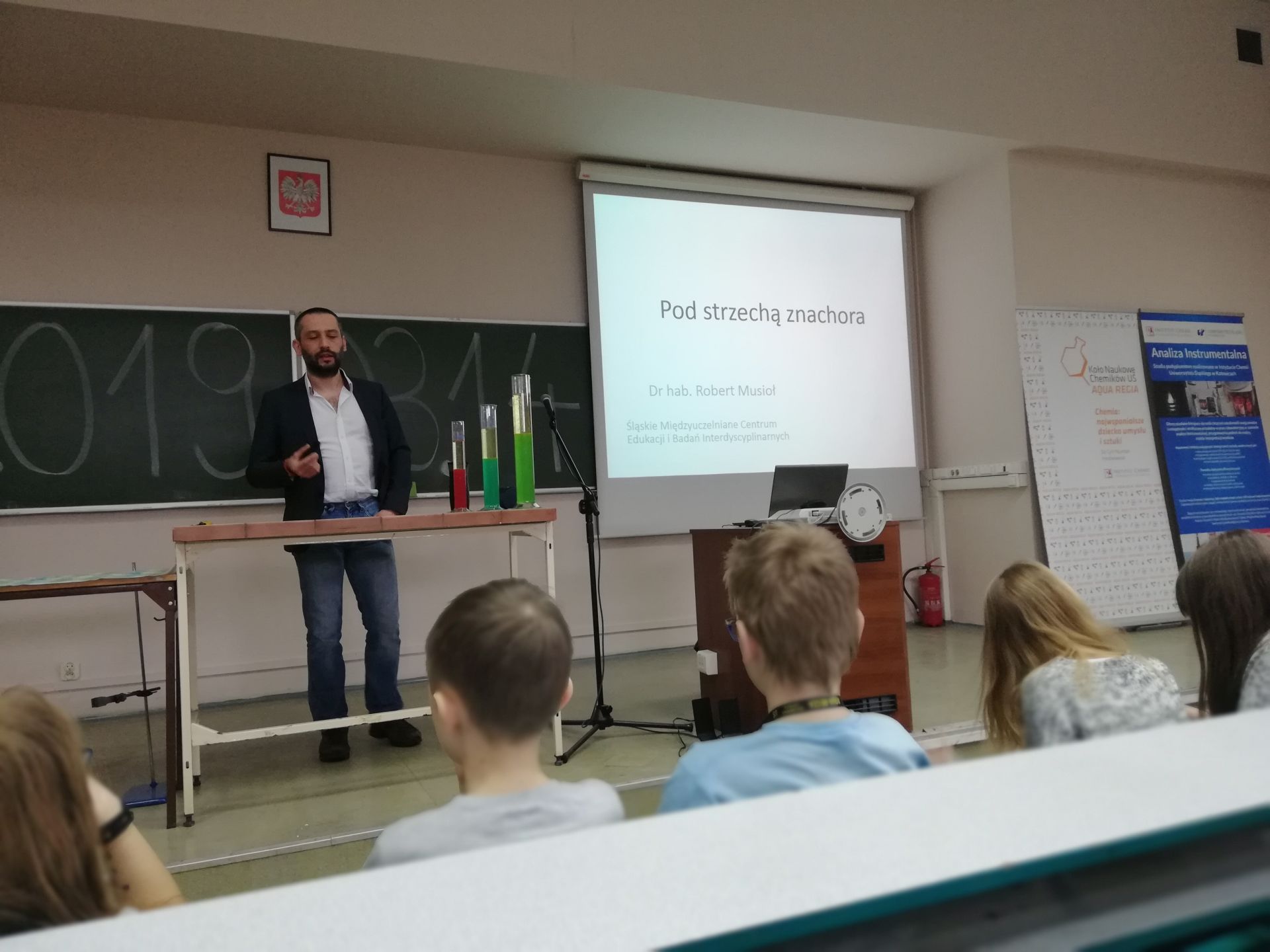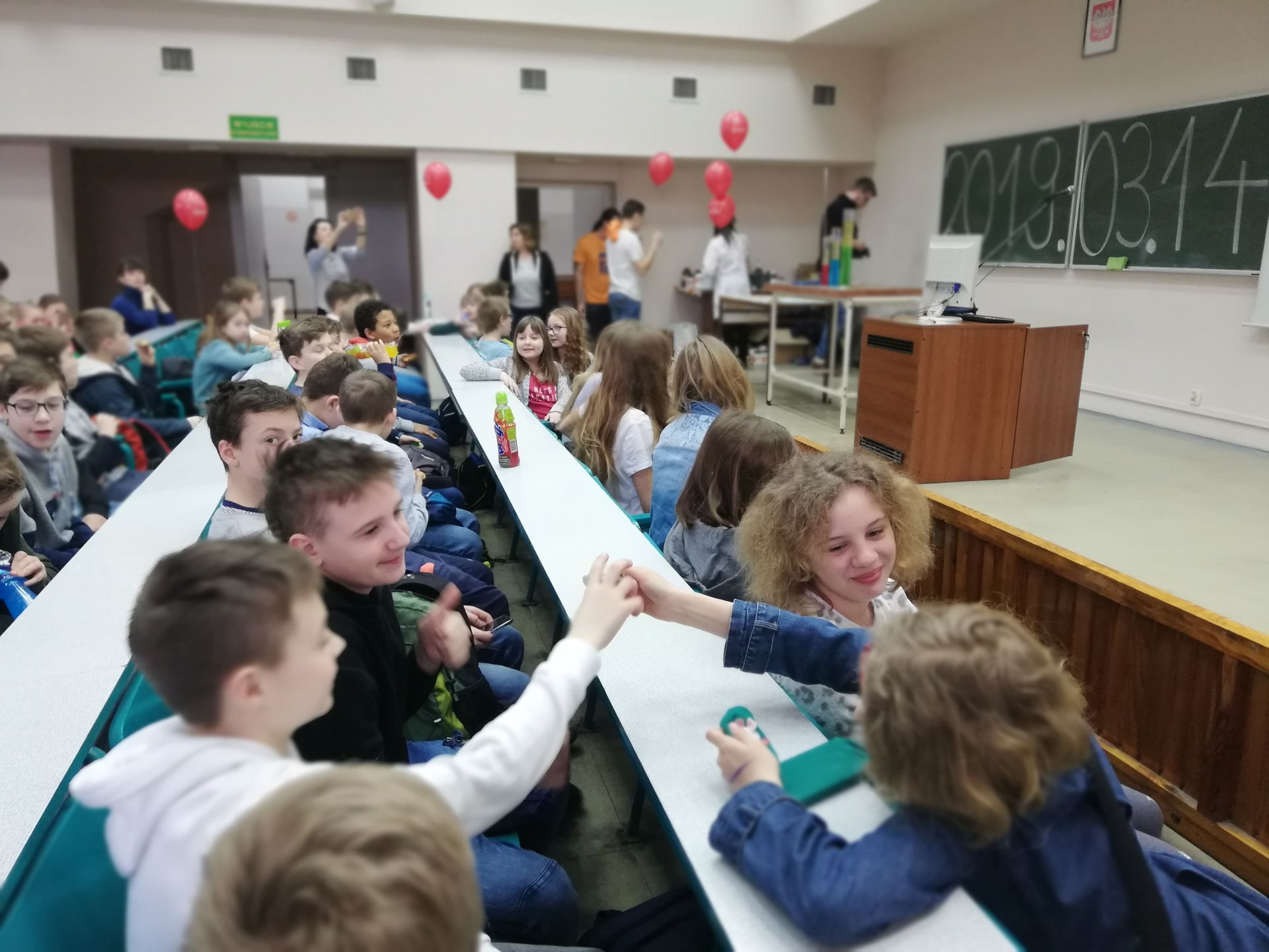 W związku z Świętem Liczby Pi uczniowie klas V C i V D naszej szkoły odwiedzili Uniwersytet Śląski Wydział Matematyki, Fizyki i Chemii. Tego dnia dla zwiedzających studenci i wykładowcy uczelni przygotowali mnóstwo atrakcji. Nasi uczniowie uczestniczyli m.in. w pokazie pt. Chemiczny zawrót głowy oraz Chemia może być efektowna i fascynująca, zwiedzili Pracownię chemii nieorganicznej i Pracownię syntezy polimerów. Wysłuchali niesamowitego wykładu pt. Medycyna w pigułce prowadzonego przez dr hab. Roberta Musioł. Poza tym na korytarzach uczelni studenci prezentowali różne fascynujące doświadczenia, np. z wykorzystaniem ciekłego azotu. Mogliśmy też spróbować dymiących chrupek. Nasi uczniowie wykazali się wiedzą, za którą zostali nagrodzeni. Dla uczniów był to dzień pełen niesamowitych wrażeń.
