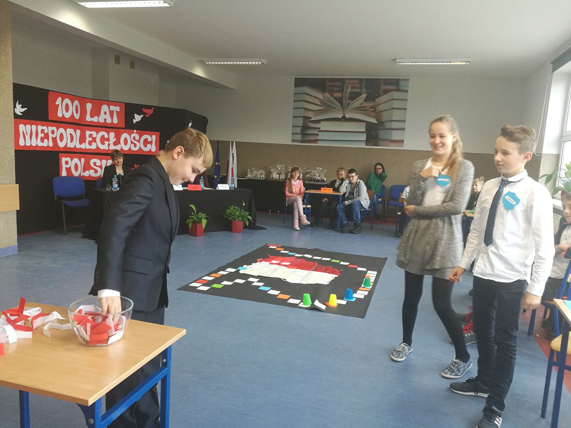 W ramach zajęć w szkole uczniowie przygotowali biało-czerwone chorągiewki i kotyliony oraz oglądali film dydaktyczny: „Przystanek niepodległość”, poruszający tematykę odzyskania przez Polskę Niepodległości.