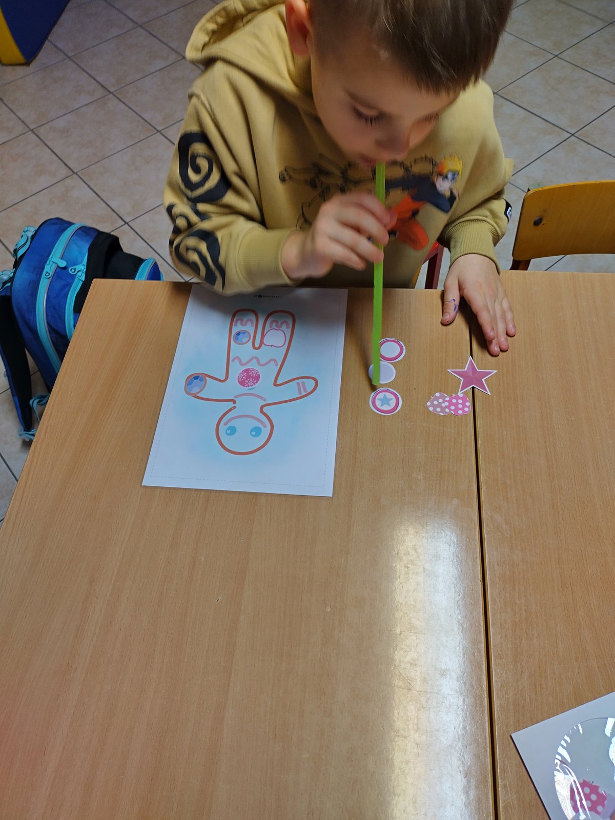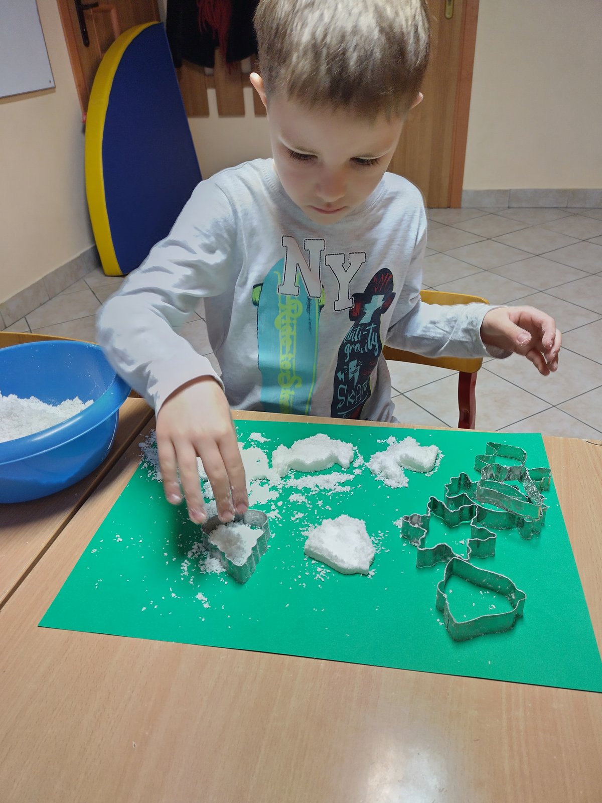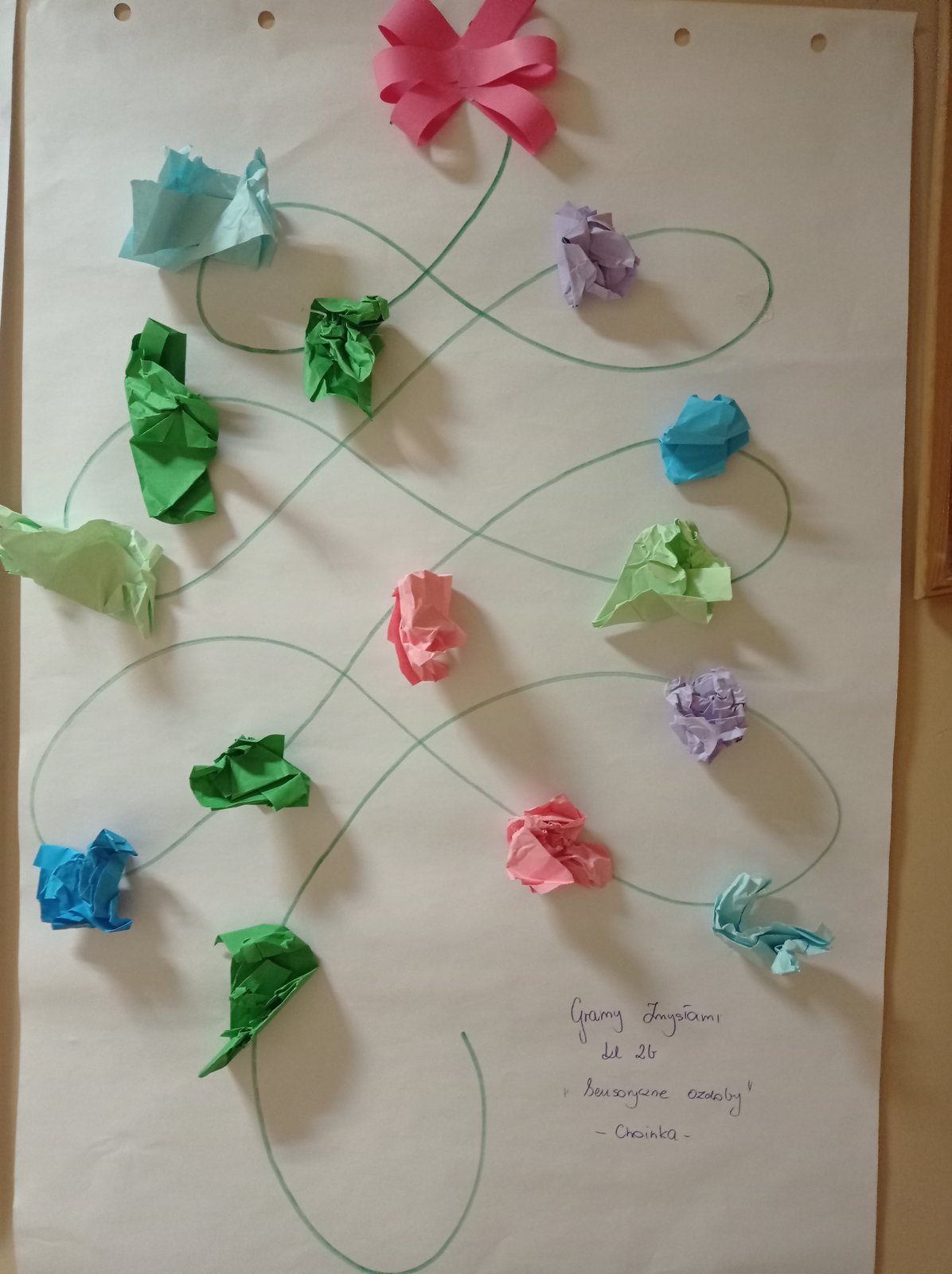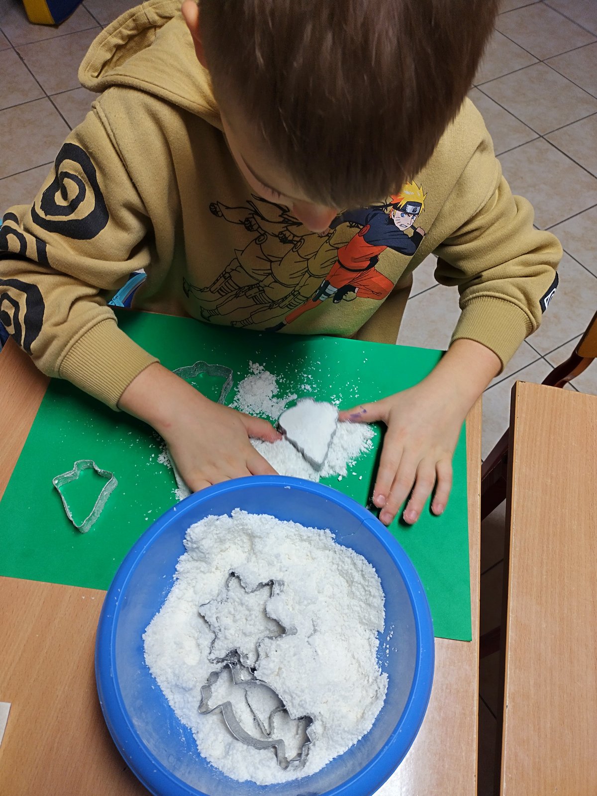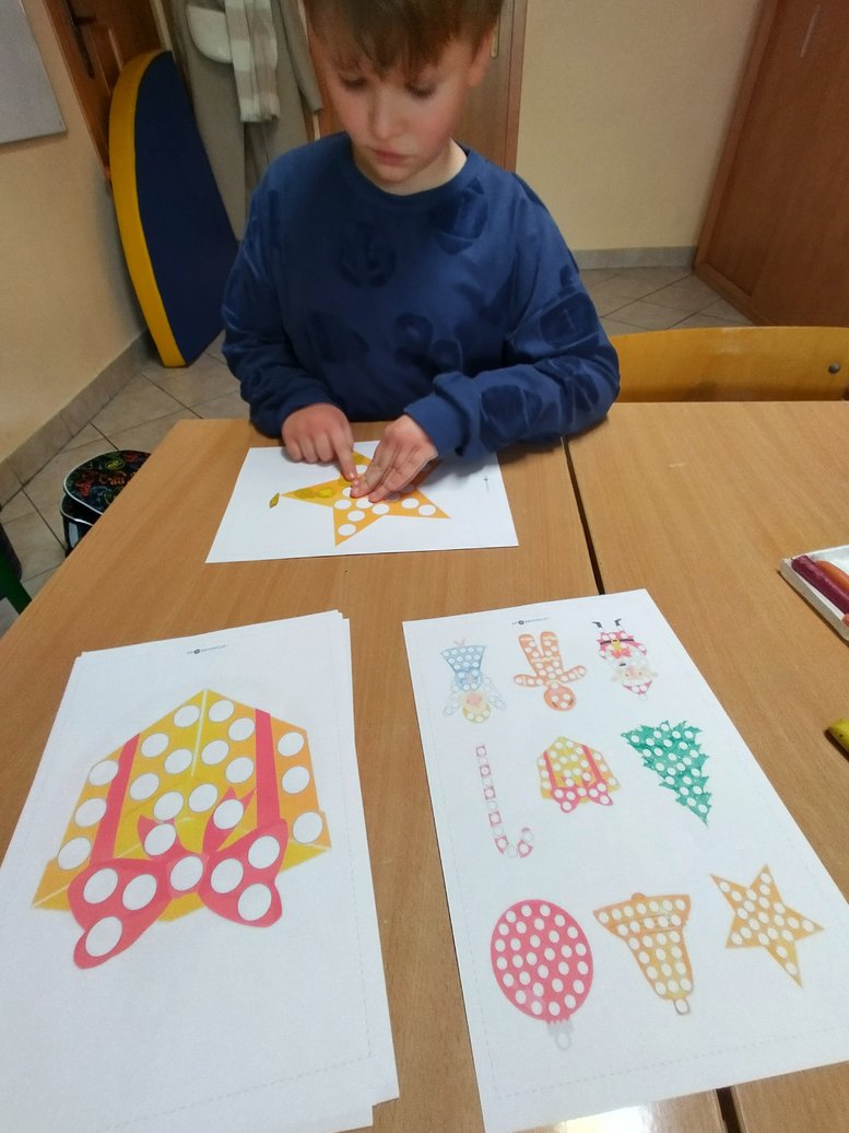 Grudniowe zadanie z projektu Gramy Zmysłami to Sensoryczna Ozdoba Świąteczna, realizowane na wybranych zajęciach logopedycznych, rewalidacyjnych i gimnastyki korekcyjnej. Grudniowy, przedświąteczny czas przesycony jest doznaniami sensorycznymi: świąteczne smaki, zapachy, różnorodne faktury … Wykorzystywaliśmy wszystkie zmysły do różnych świątecznych aktywności. Robiliśmy świąteczne ćwiczenia oddechowe, ćwiczenia artykulacyjne z Mikołajem, ćwiczyliśmy małą motorykę podczas ozdabiania pierniczków i obrazków świątecznych, a także wykorzystywaliśmy masę sensoryczną w postaci sztucznego śniegu. Doświadczaliśmy świątecznego smaku i zapachu podczas wąchania i jedzenia pierniczków. Kokosowy śnieg również pobudzał nasz zmysł węchu . Ach, co to był za smak …. i zapach …. Rozwijaliśmy słownictwo związane ze świętami, a także stymulowaliśmy rozwój słuchu poprzez słuchanie świątecznych melodii. Zajęcia te rozwijały nas sensorycznie, ponieważ pobudzały wszystkie zmysły. Dostarczyły bodźców sensorycznych. Stanowiły doskonały stymulator dotyku, smaku, a także wzroku i słuchu. Na gimnastyce korekcyjnej pracowaliśmy sensorycznie, strojąc choinkę – naszymi stopami… Pobudzaliśmy w ten sposób zmysł dotyku, czucia głębokiego i równowagi. Stymulowaliśmy także receptory nerwowe umiejscowione na stopach. Jednocześnie (poprzez dotykanie różnych faktur) pozytywnie wpływaliśmy na rozwój stóp, gdyż wzmacniając mięśnie, pracują nasze więzadła dzięki czemu zapobiegamy płaskostopiu. Zapraszamy do obejrzenia zdjęć