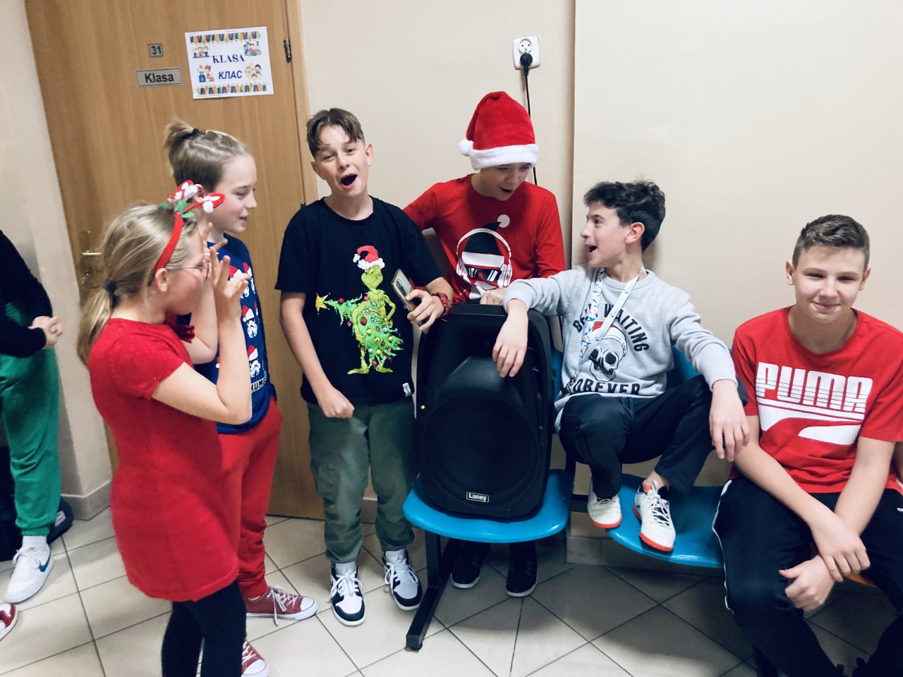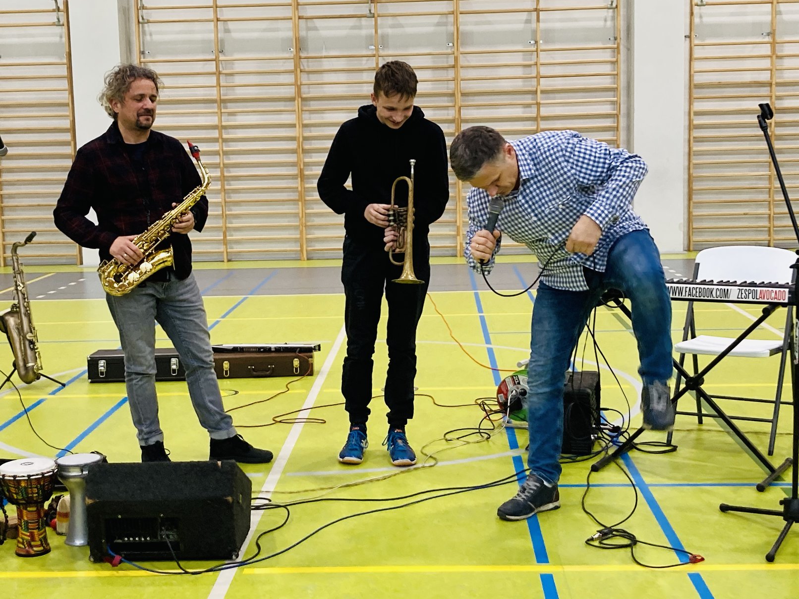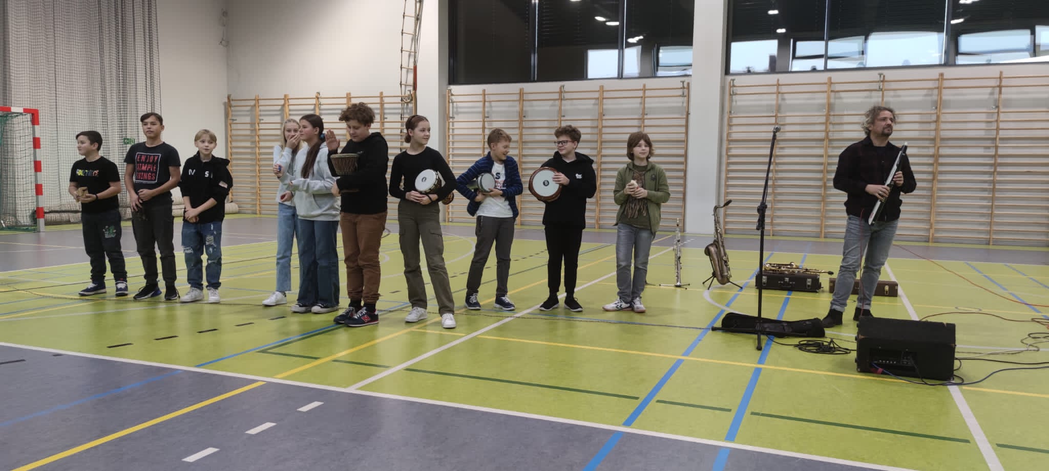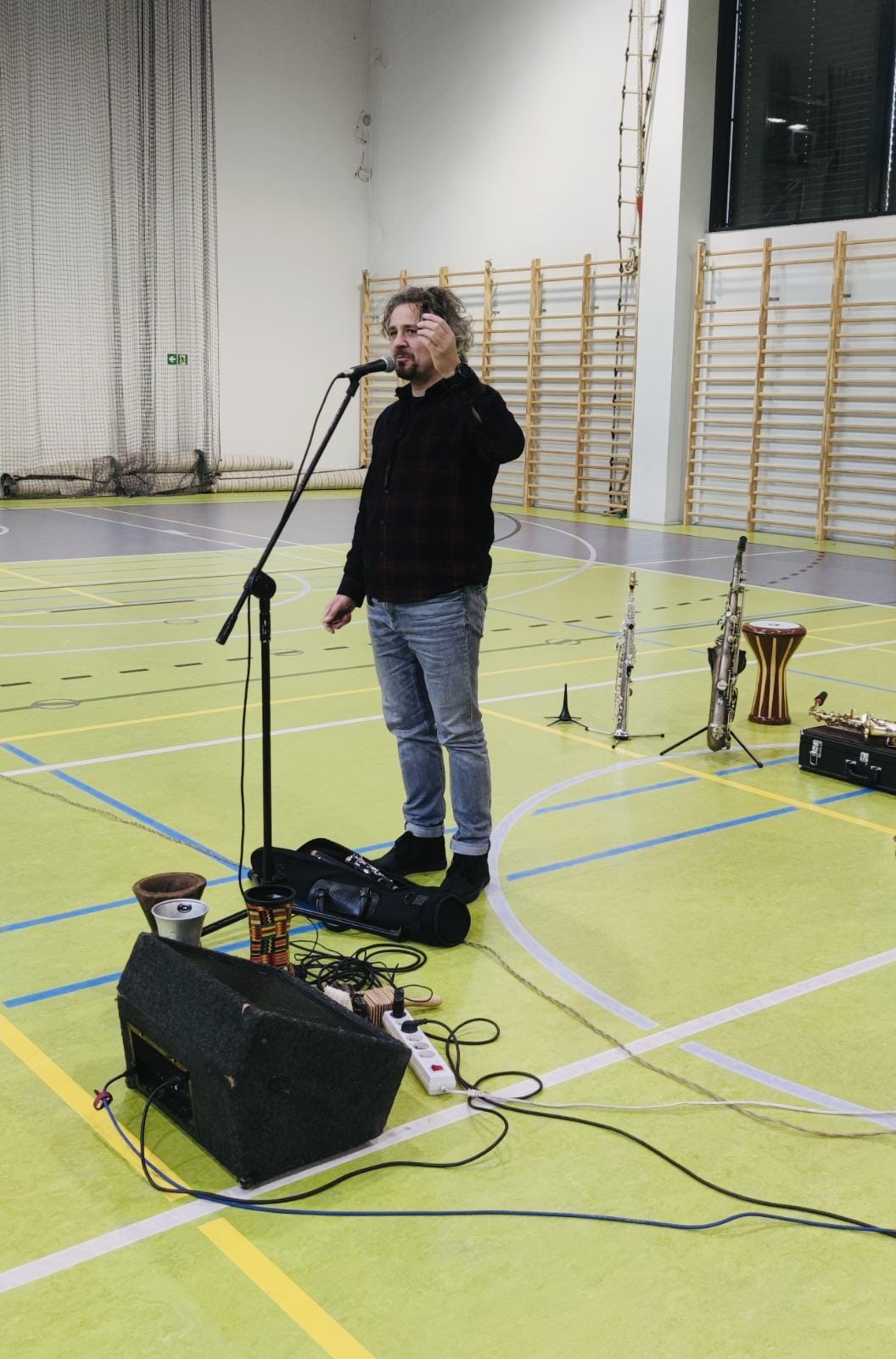 Około godziny 11:00 klasy starsze zebrały się wraz ze swoimi nauczycielami w hali widowiskowo-sportowej. Warsztaty prowadziło dwóch muzyków. Zaproponowali nam różne zabawy, między innymi taką, podczas której grane są znane melodię, a publika musi zgadnąć, co to za utwór. Panowie pokazywali nam również budowę instrumentów oraz przedstawiali ich pełne nazwy. Uczniowie mieli także okazję odpowiadać na pytania zadawane przez muzyków na temat poznanych instrumentów. Na końcu artyści zaprosili na “scenę” chętnych uczniów między innymi: Piotra Kopcia i Maję Patałąg z mojej klasy, aby razem zagrać na różnych instrumentach. Moi koledzy otrzymali bongosy; na ich twarzach począwszy od stresu poprzez zakłopotani, pojawiał się uśmiech. Ten wachlarz emocji jest świetnym dowodem na to, że łatwiej jest być sobą podczas lekcji niż na scenie.