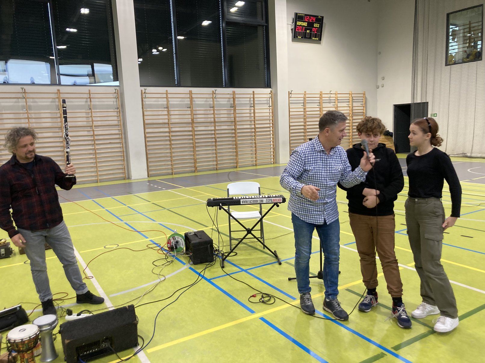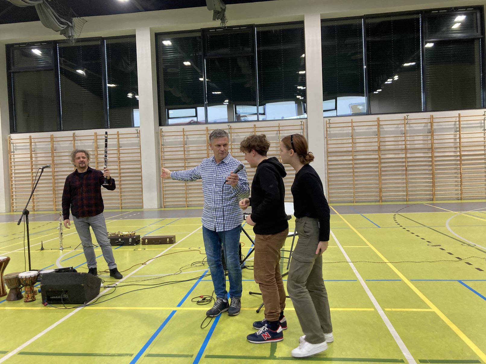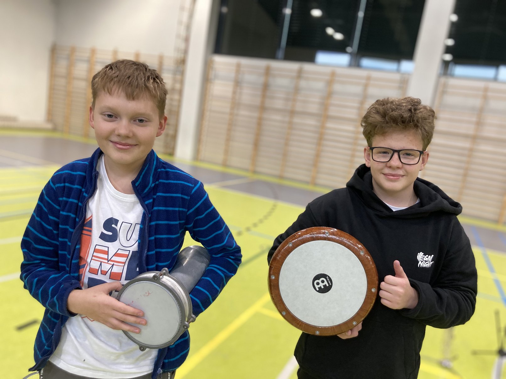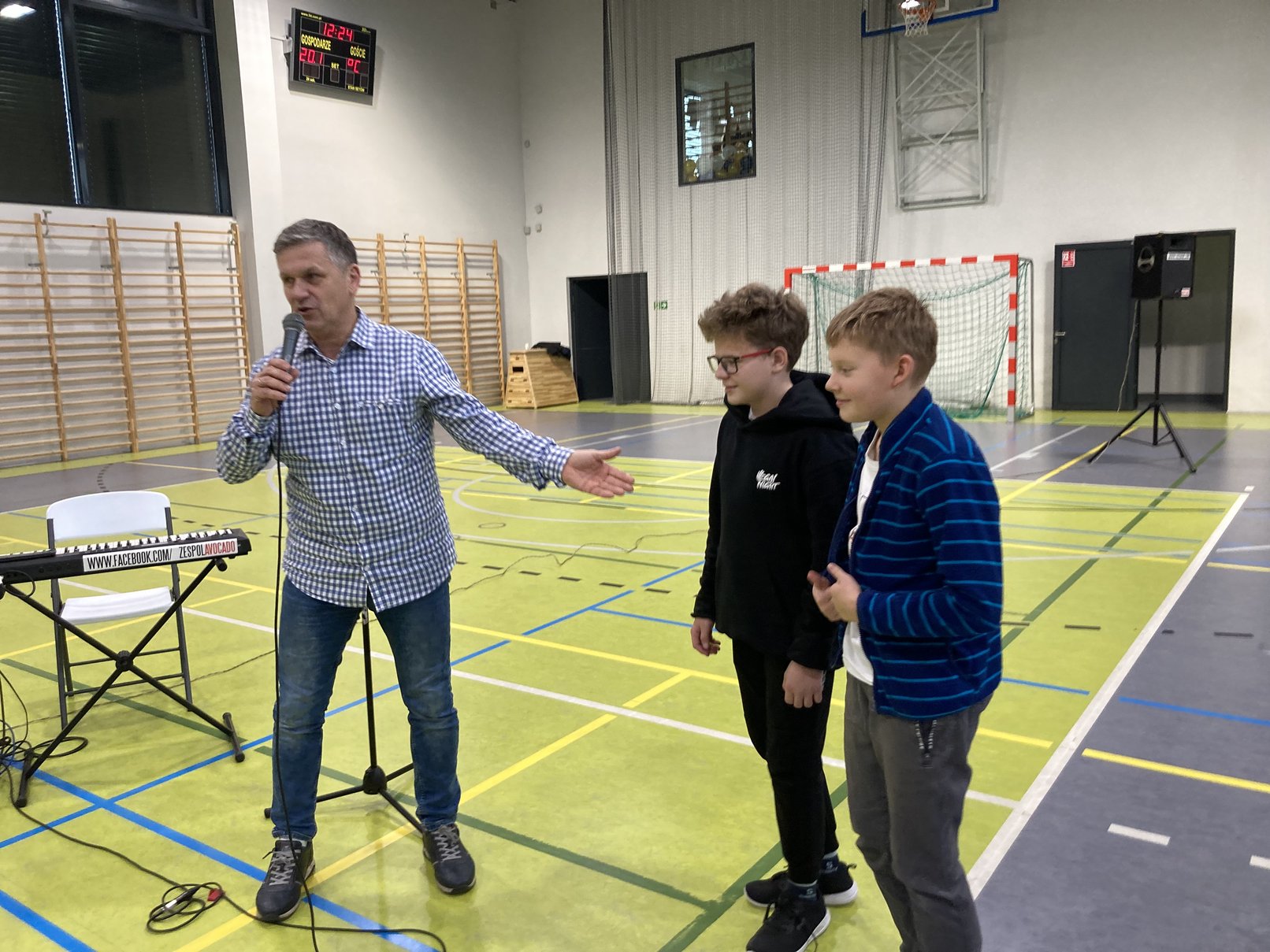 Około godziny 11:00 klasy starsze zebrały się wraz ze swoimi nauczycielami w hali widowiskowo-sportowej. Warsztaty prowadziło dwóch muzyków. Zaproponowali nam różne zabawy, między innymi taką, podczas której grane są znane melodię, a publika musi zgadnąć, co to za utwór. Panowie pokazywali nam również budowę instrumentów oraz przedstawiali ich pełne nazwy. Uczniowie mieli także okazję odpowiadać na pytania zadawane przez muzyków na temat poznanych instrumentów. Na końcu artyści zaprosili na “scenę” chętnych uczniów między innymi: Piotra Kopcia i Maję Patałąg z mojej klasy, aby razem zagrać na różnych instrumentach. Moi koledzy otrzymali bongosy; na ich twarzach począwszy od stresu poprzez zakłopotani, pojawiał się uśmiech. Ten wachlarz emocji jest świetnym dowodem na to, że łatwiej jest być sobą podczas lekcji niż na scenie.