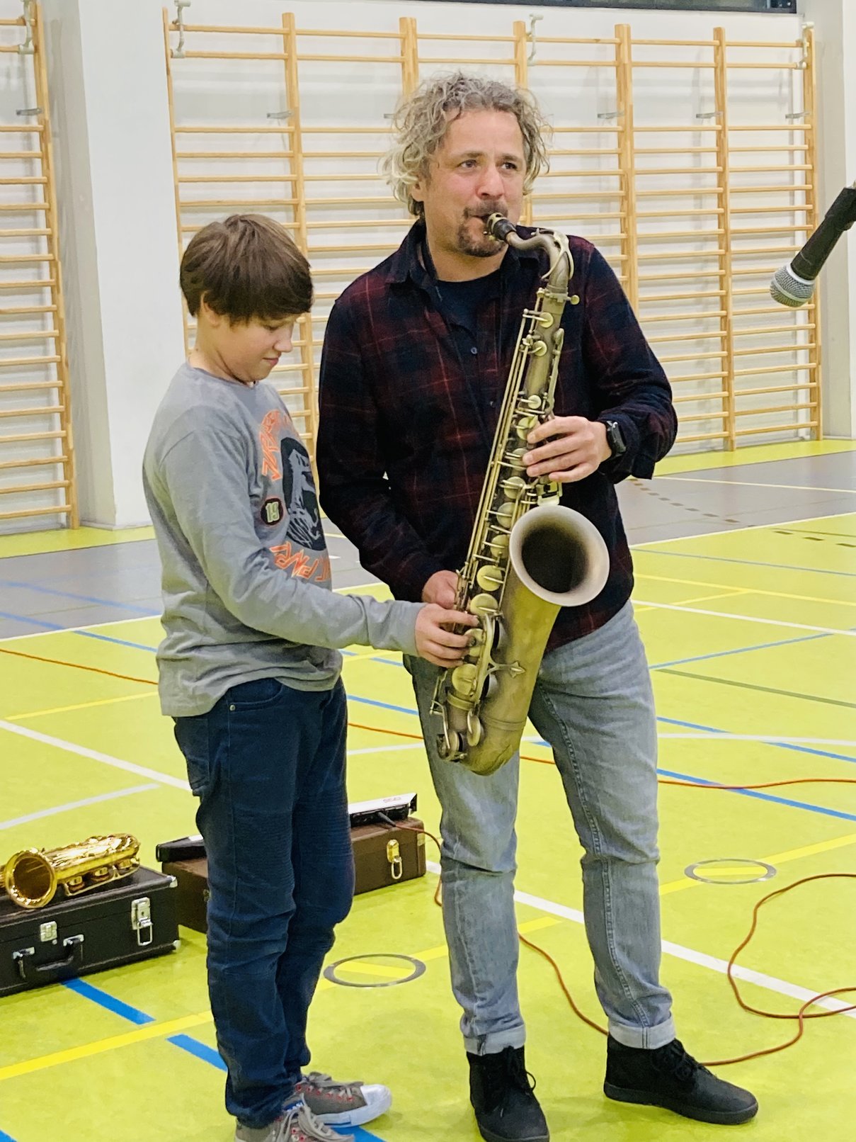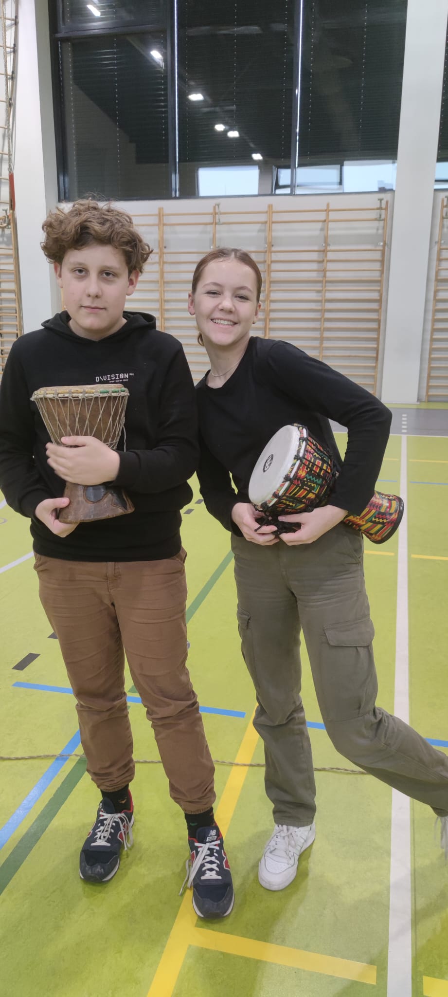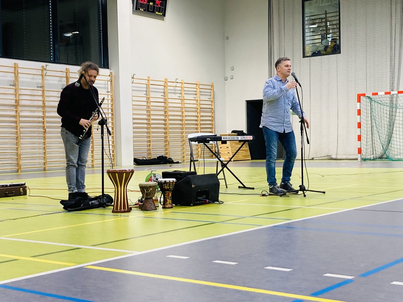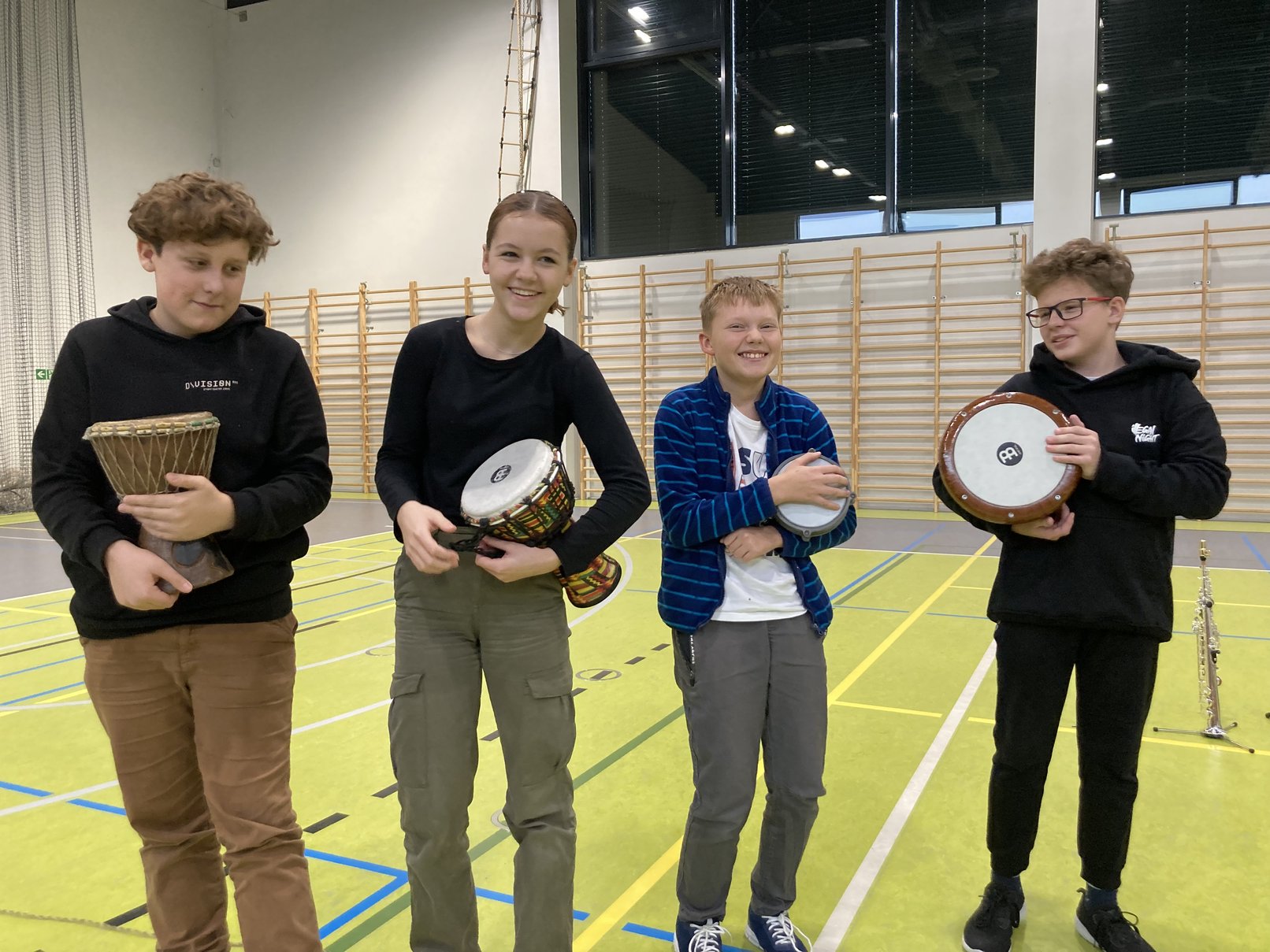 Około godziny 11:00 klasy starsze zebrały się wraz ze swoimi nauczycielami w hali widowiskowo-sportowej. Warsztaty prowadziło dwóch muzyków. Zaproponowali nam różne zabawy, między innymi taką, podczas której grane są znane melodię, a publika musi zgadnąć, co to za utwór. Panowie pokazywali nam również budowę instrumentów oraz przedstawiali ich pełne nazwy. Uczniowie mieli także okazję odpowiadać na pytania zadawane przez muzyków na temat poznanych instrumentów. Na końcu artyści zaprosili na “scenę” chętnych uczniów między innymi: Piotra Kopcia i Maję Patałąg z mojej klasy, aby razem zagrać na różnych instrumentach. Moi koledzy otrzymali bongosy; na ich twarzach począwszy od stresu poprzez zakłopotani, pojawiał się uśmiech. Ten wachlarz emocji jest świetnym dowodem na to, że łatwiej jest być sobą podczas lekcji niż na scenie.