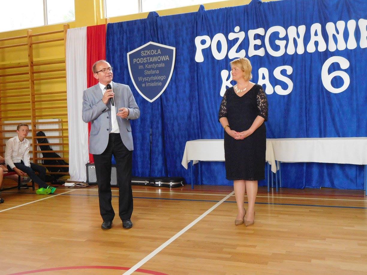 Klasy VI, które w tym roku żegnają się z murami naszej szkoły, nie żegnając się jednak z podstawówką, świętowały nieco bardziej uroczyście. O godzinie 10:30 w sali gimnastycznej rozpoczęła się akademia pożegnalna, na którą przybyli przedstawiciele Urzędu Miasta Imielin z panem burmistrzem na czele, rodzice i nauczyciele. Po ceremonii zaprzysiężenia nowego pocztu sztandarowego wręczone zostały świadectwa dla najlepszych uczennic i uczniów z klas VI: a, b, c i d. Wyróżniający się uczniowie otrzymali również nagrody specjalne - za szczególne osiągnięcia m.in. w nauce, sporcie, sztuce, działaniach wolontariacie. Za pracę na rzecz szkoły podziękowania otrzymali rodzice z tzw. "trójek" klasowych.