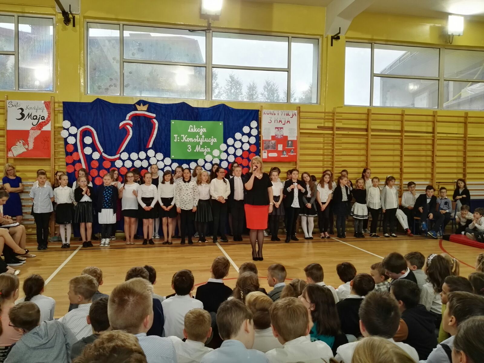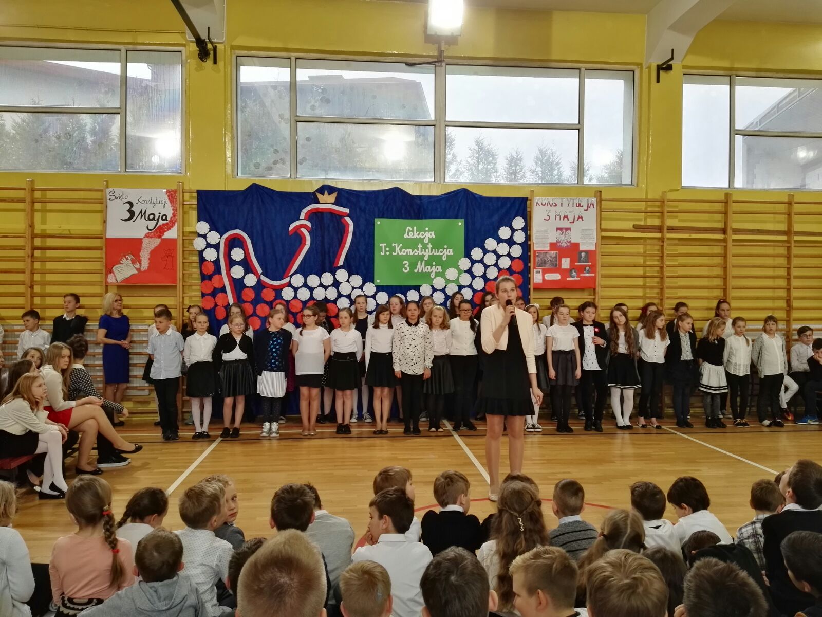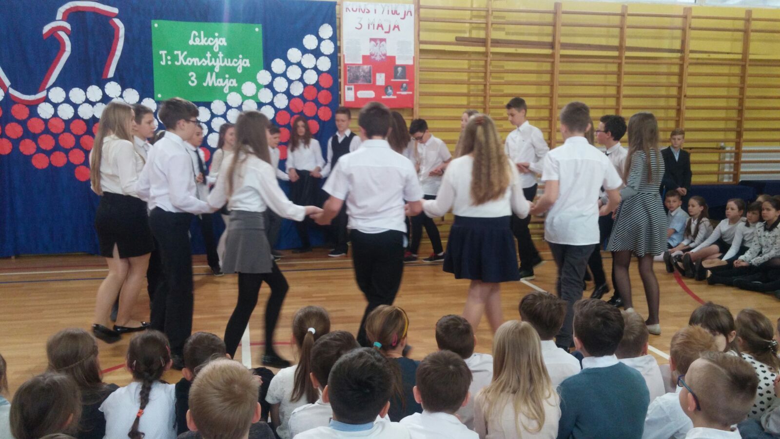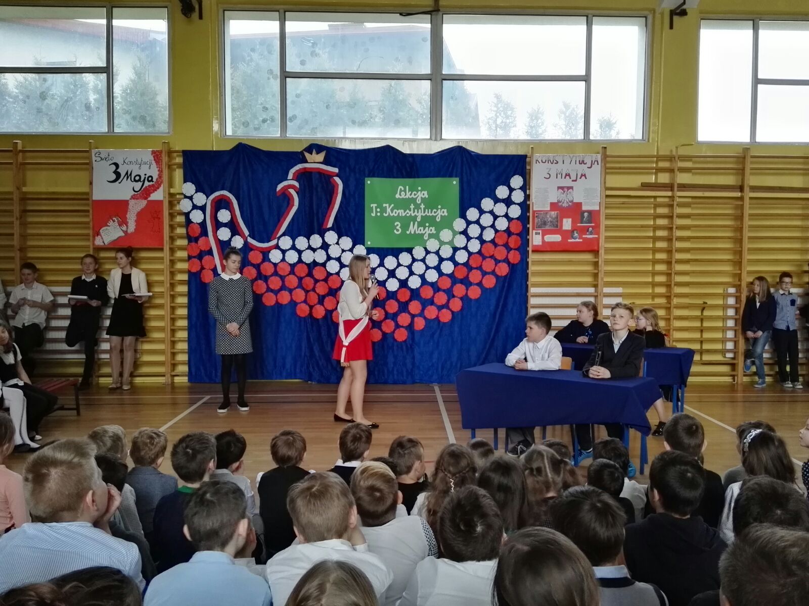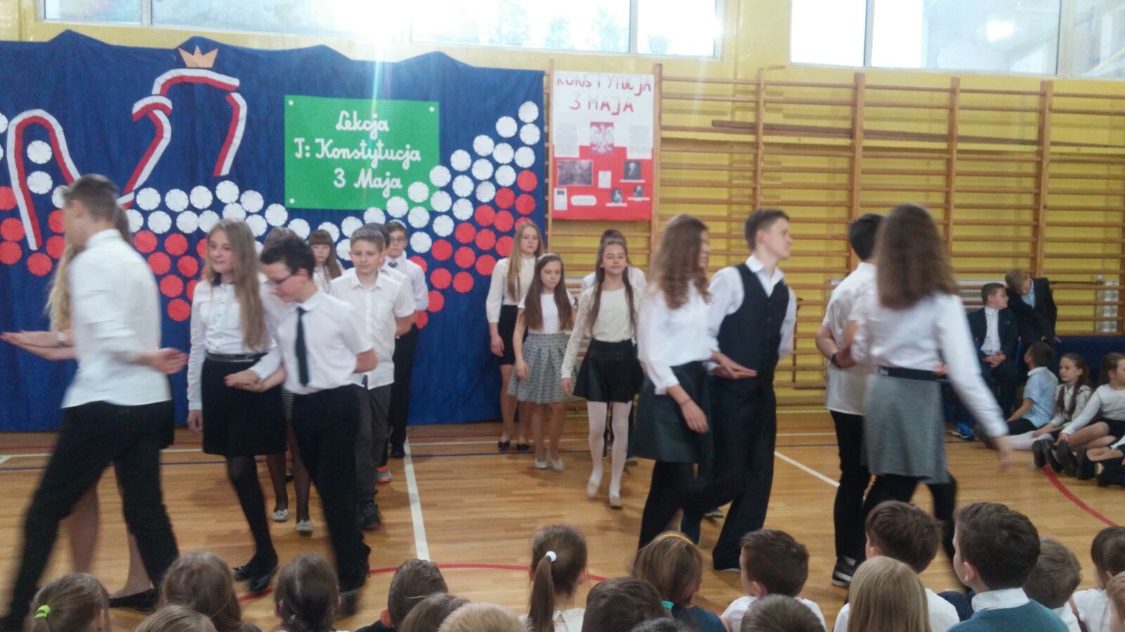 Następnie dzieci miały okazję oglądać scenkę, która była świetną lekcją historii. Podczas przedstawienia, można było się dowiedzieć, co to jest właściwie konstytucja, dlaczego Konstytucja 3 Maja była tak ważna dla Polski oraz że obchodzimy już 226 rocznicę jej uchwalenia. Uczniowie występujący podkreślali również fakt, że była to druga na świecie i pierwsza w Europie konstytucja.