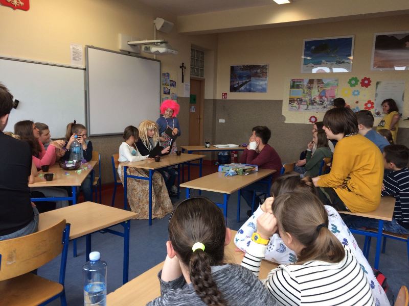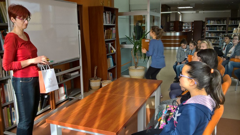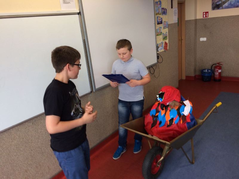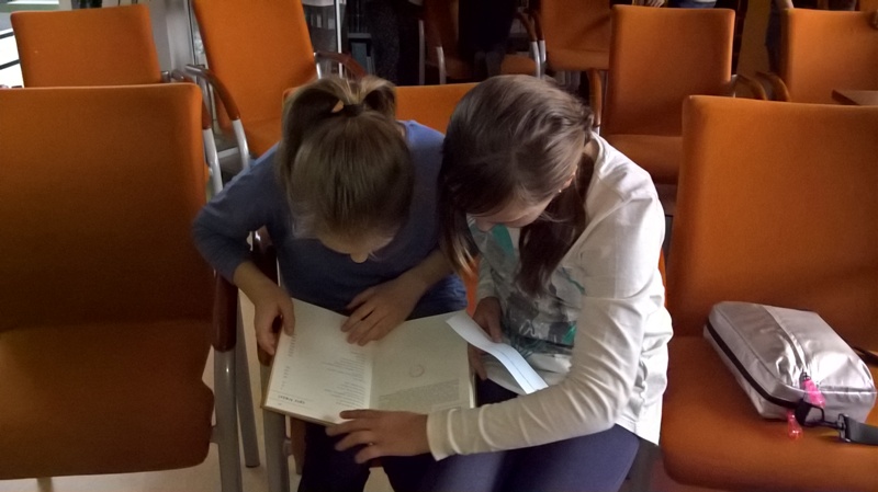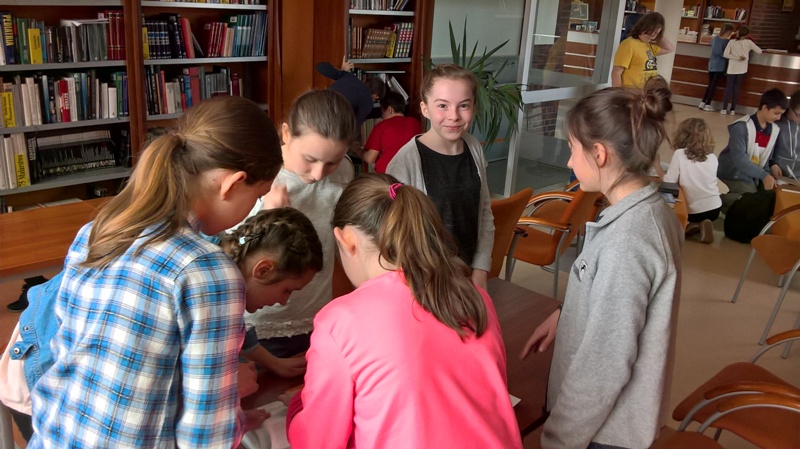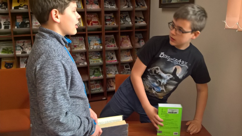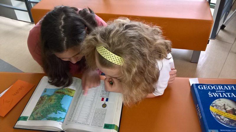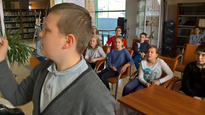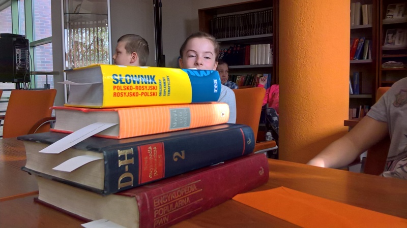 Szóstoklasiści przypomnieli sobie zasady korzystania z księgozbioru podręcznego oraz rodzaje źródeł informacji. Następnie, podzielni na dwie drużyny, walczyli o puchar "Mistrza wyszukiwania informacji", szukając odpowiedzi w rozmaitych encyklopediach, leksykonach i słownikach. Obie grupy szybko uporały się z zadaniami, więc pozostały czas można było przeznaczyć na zabawę w kalambury.