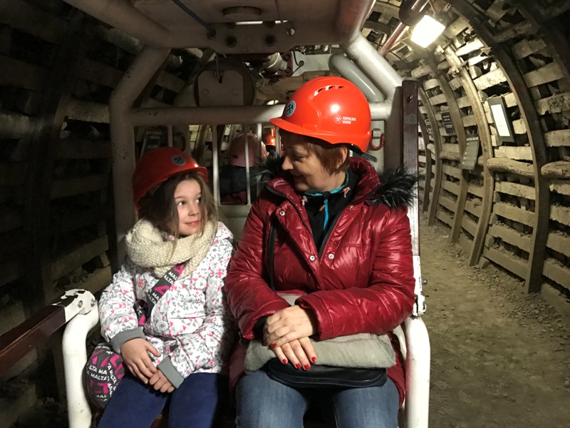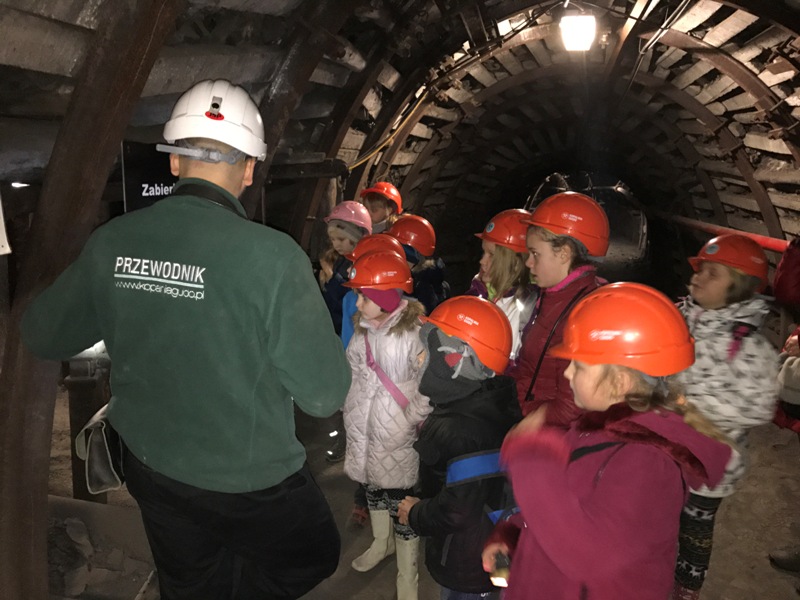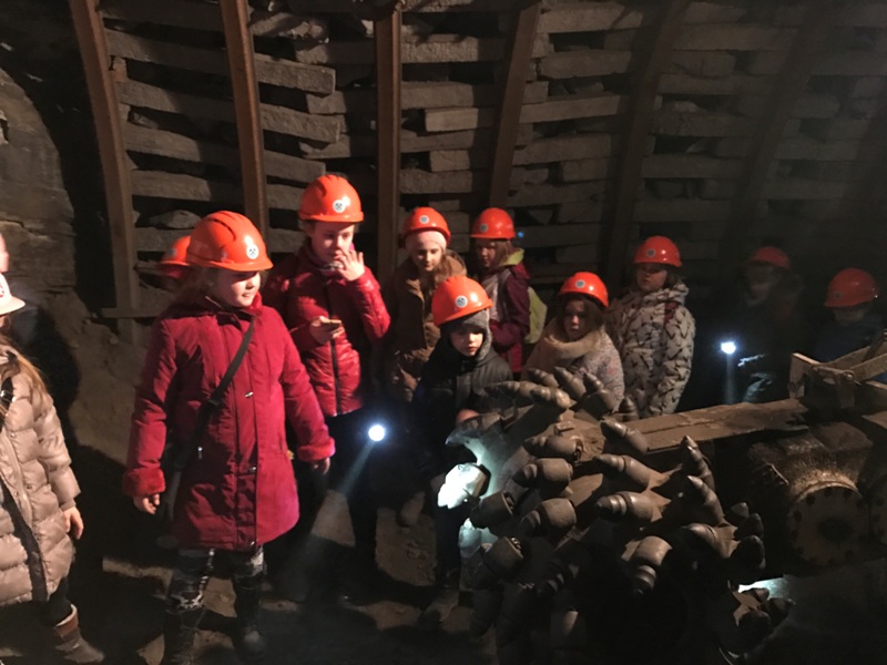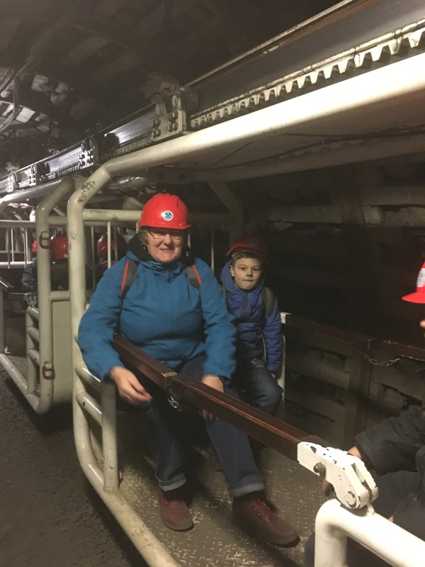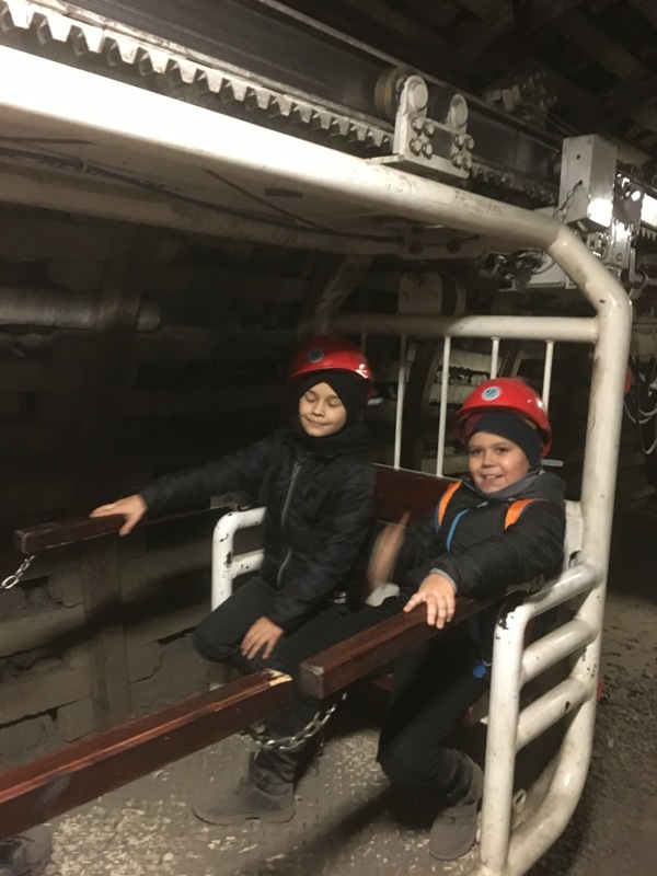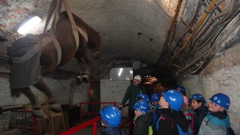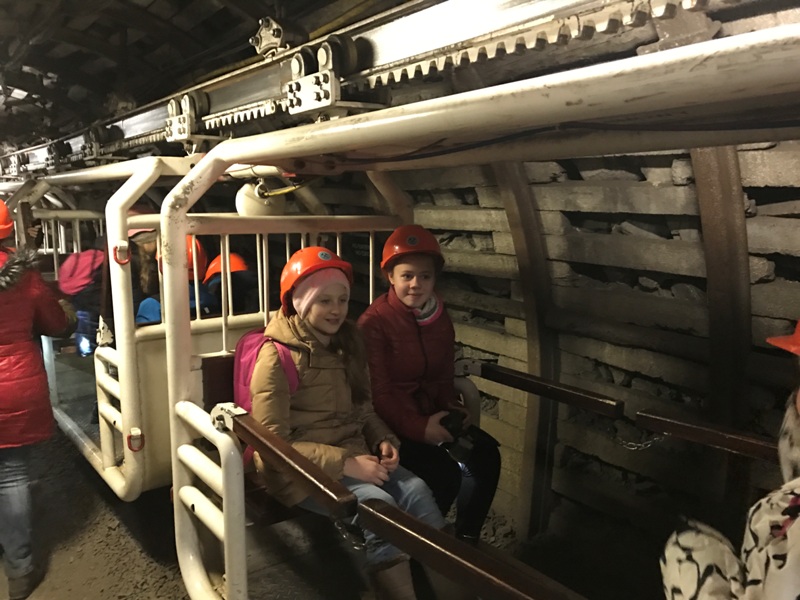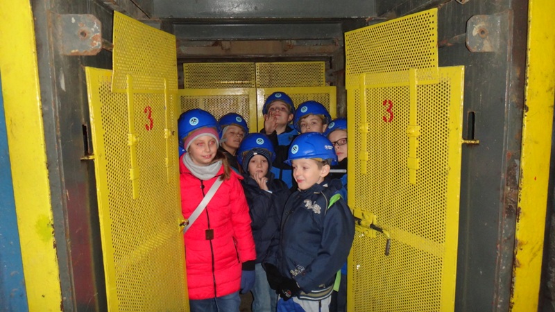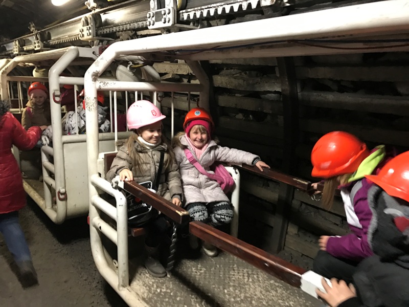 Górniczą szolą najpierw zjechaliśmy na poziom 170, gdzie obejrzeliśmy podziemne stajnie z przełomu XIX i XX wieku, multimedialne projekcje wody wdzierającej się do górniczego chodnika i huk wybuchających materiałów strzałowych. Poznaliśmy też dzieje patronki górników i piękną kaplicę z witrażem i rzeźbą św. Barbary. Potem tą samą szolą zjechaliśmy na poziom 320. Jest to najgłębiej położona w kopalni węgla kamiennego trasa turystyczna w Europie . Tam przekonaliśmy się na własne oczy jak wygląda górnicza szychta. Pokazano nam jak pracują maszyny górnicze i w jak trudnych i niebezpiecznych warunkach pracują górnicy. Tam też jechaliśmy podwieszaną kolejką elektryczną.