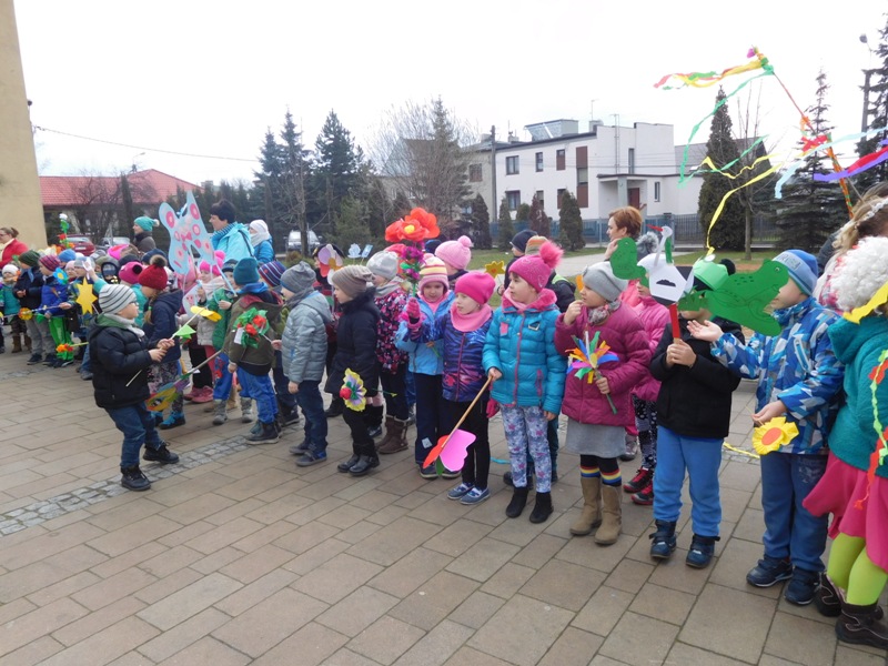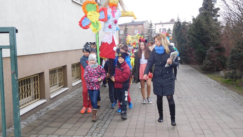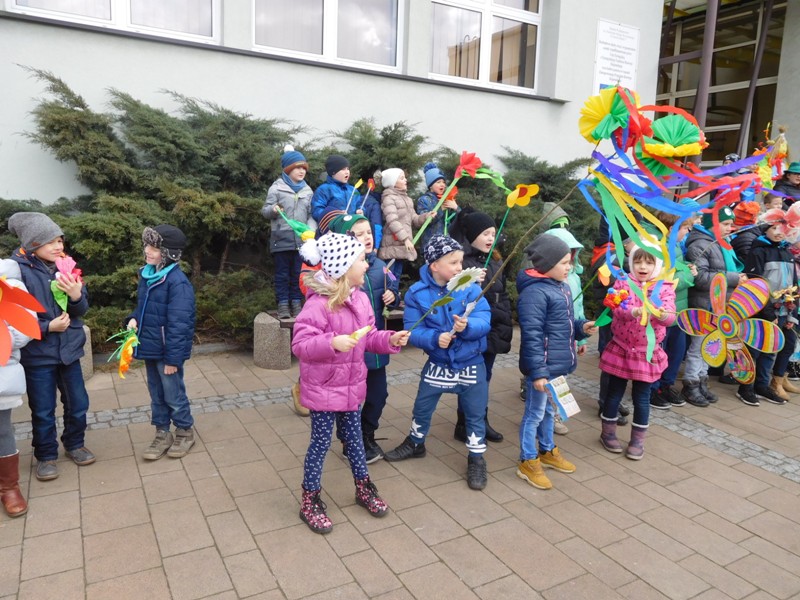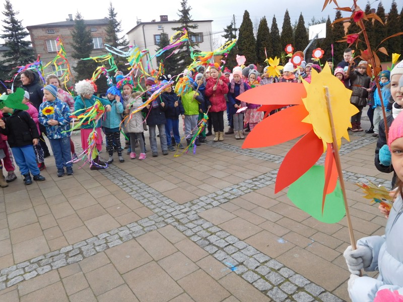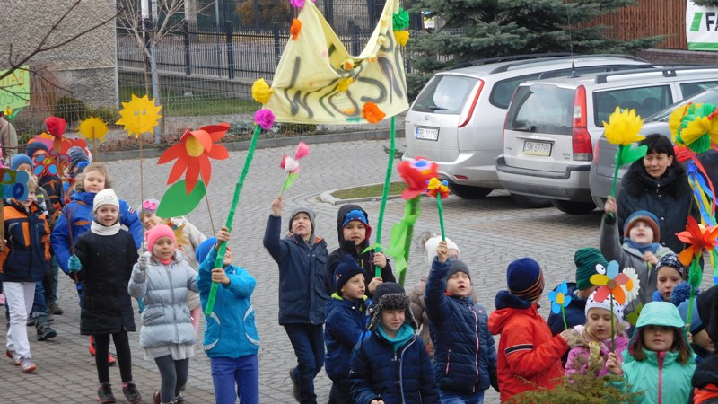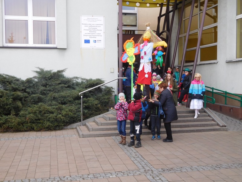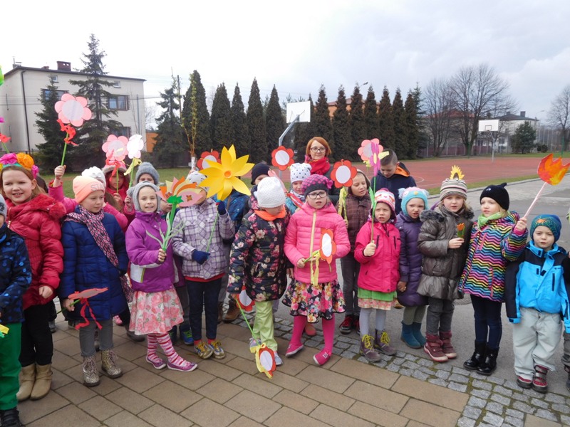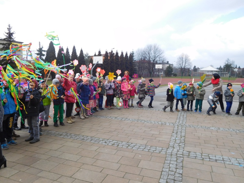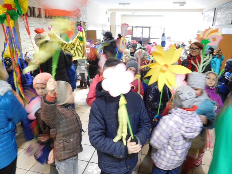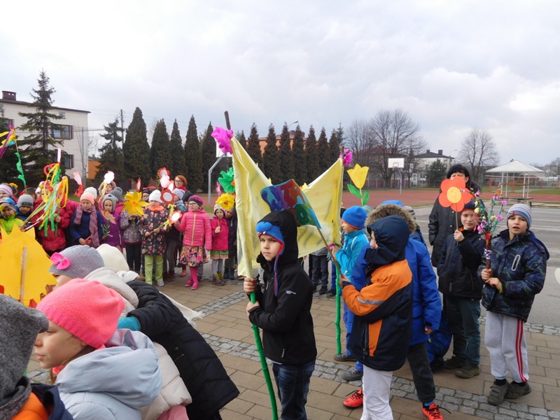 Można by rzec, iż klasy I-III celebrowały ten dzień trochę huczniej niż inni. Jednym za to nie odbiegały od starszaków- także w ich stroju zagościł żółty lub zielony kolor. Każdy z maluchów przyniósł (zrobionego przez siebie) kwiatka. Nasi kochani nauczyciele zadbali także o marzannę, która nieodłącznie kojarzy się z pożegnaniem zimy. Jak co roku nasi milusińscy wyruszyli w korowód wiosenny którego celem było powitanie długo wyczekiwanej wiosny. Po takiej paradzie zima na pewno do nas nie wróci.