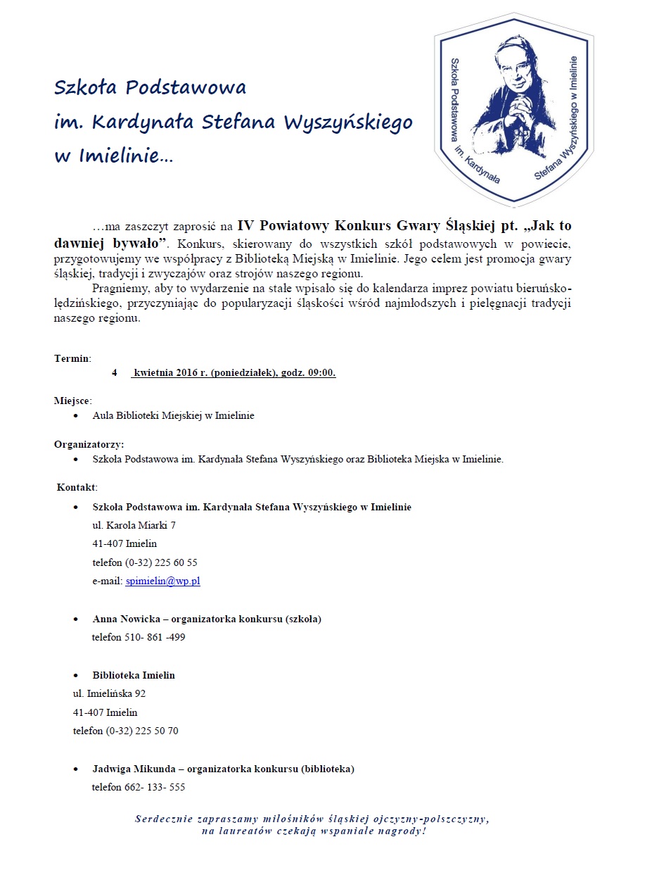 Serdecznie zapraszam uczniów i uczennice wszystkich szkół podstawowych naszego powiatu do udziału w IV Konkursie Gwary Śląskiej pt. "Jak to dawniej bywało". Konkurs, którego nasza szkoła jest współorganizatorem, odbędzie się 4 kwietnia br. w auli Biblioteki Miejskiej w Imielinie. (UWAGA: termin zgłoszeń upływa 23 marca).